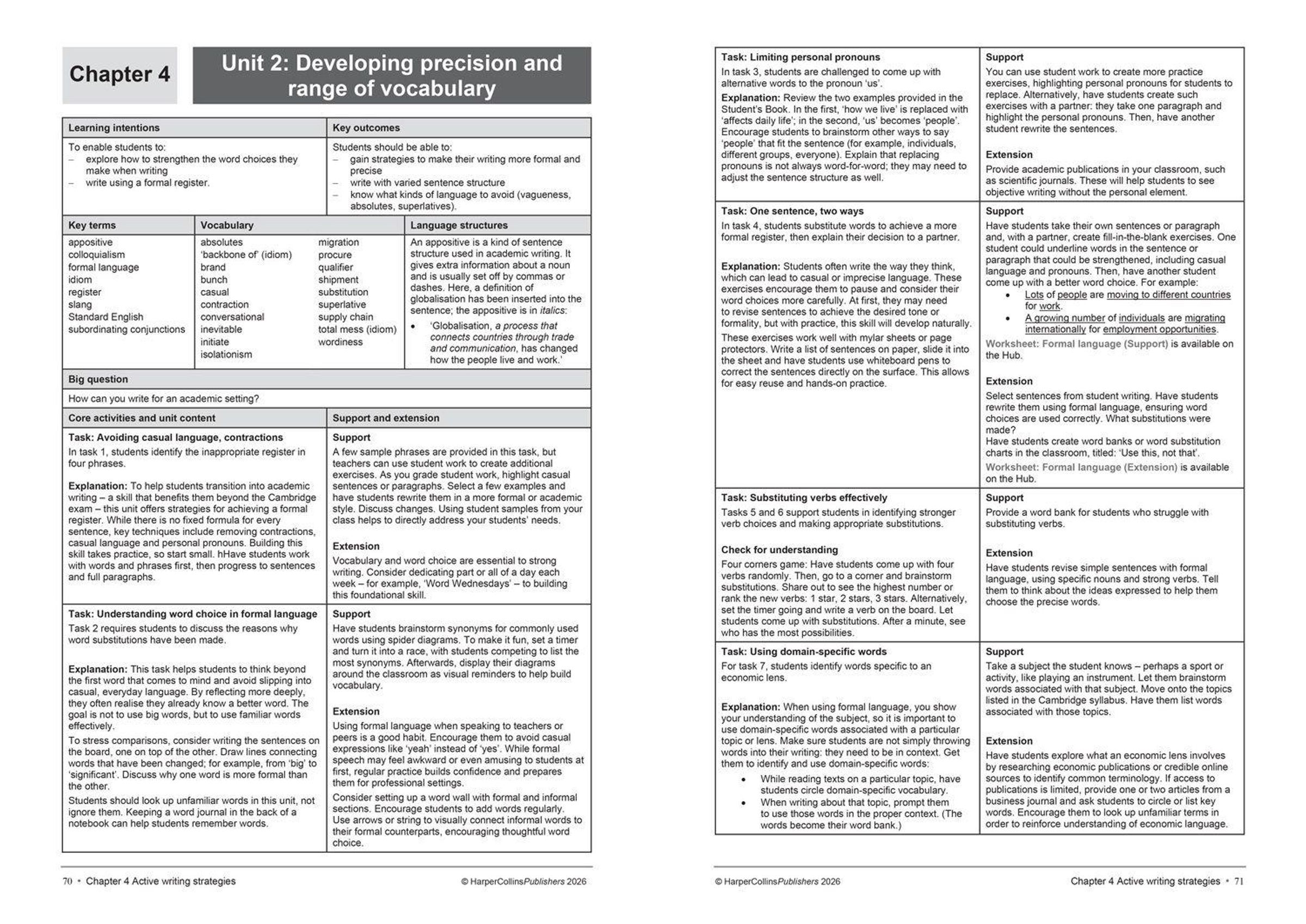 · Provides clear, quick-reference guidance for teaching each unit, outlining the intentions and key outcomes as well as highlighting any support that may be required for specific tasks.