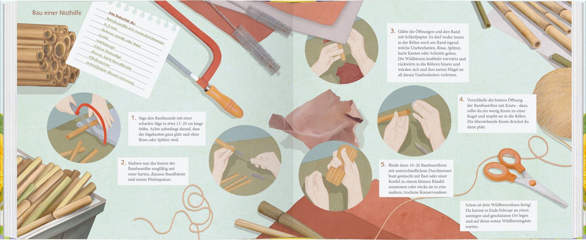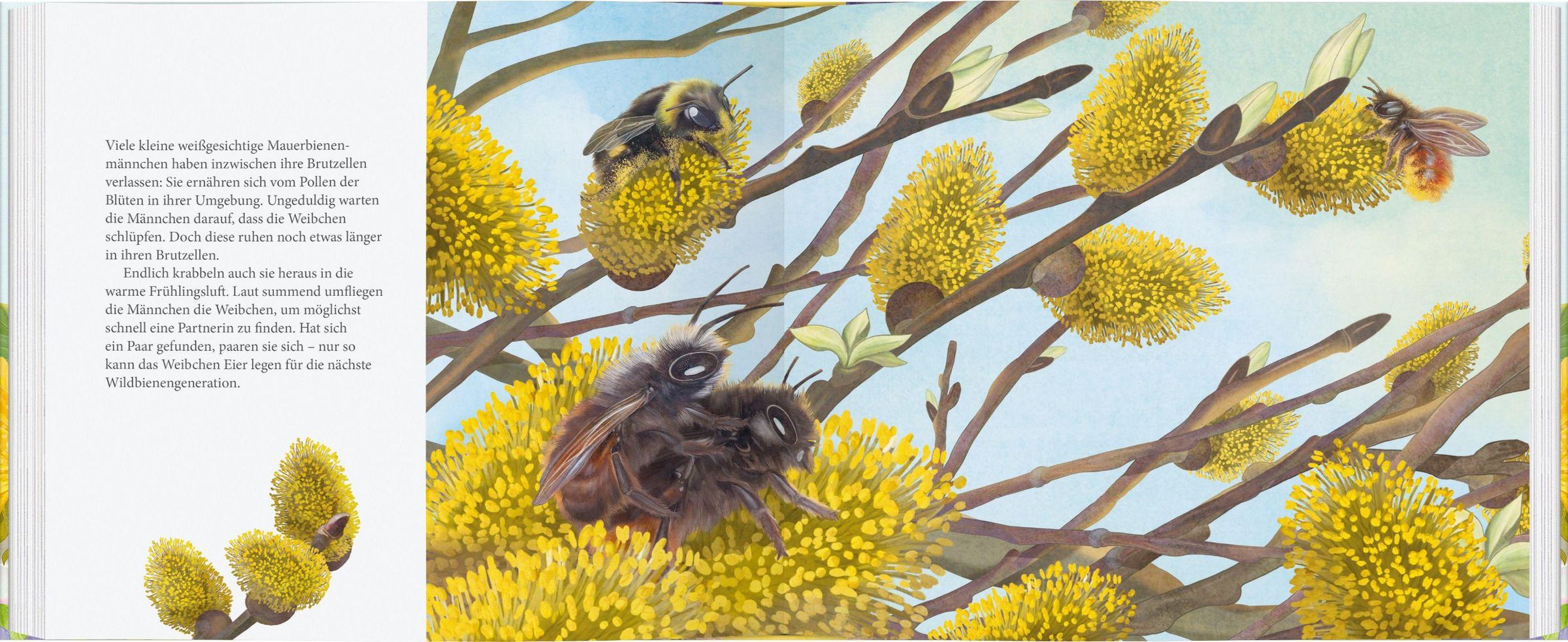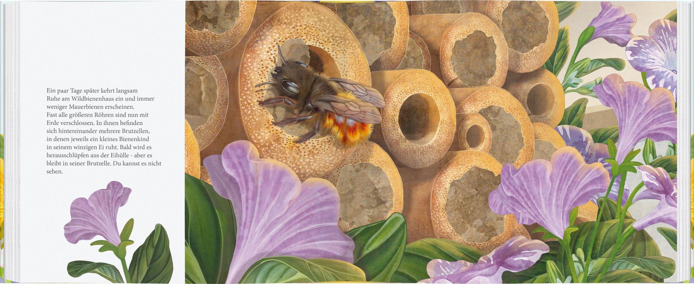 Sobald im Frühling die ersten Blumen blühen, fliegen auch schon Wildbienen wie die Gehörnte Mauerbiene auf der Suche nach einem passenden Quartier für ihren Nachwuchs umher. Mit der Schritt-für-Schritt-Anleitung am Ende dieses Buches kann man im Handumdrehen eine Nisthilfe bauen und die faszinierenden Tiere von ganz nah beobachten. Es wird berichtet, wie sich die Gehörnte Mauerbiene vom Ei zur fertigen Biene entwickelt, wie das Jahr einer Erdhummel aussieht und welch wichtige Aufgabe die wilden Verwandten unserer Honigbiene in der Natur haben. Spannende Informationen zur Lebensweise und Vielfalt dieser interessanten und nützlichen Insekten runden das Buch ab.
