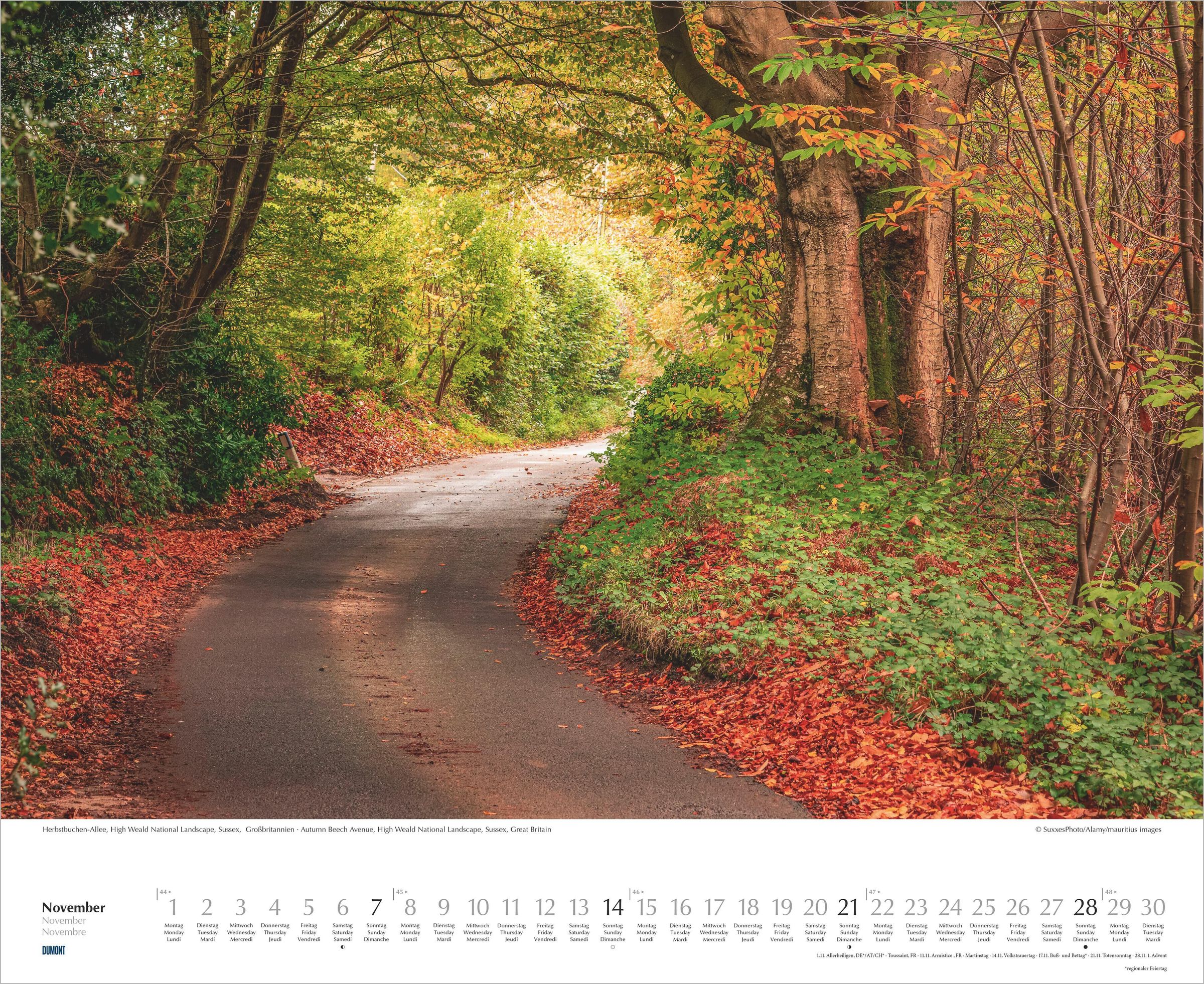 12 Monatsblätter mit großformatigen Naturaufnahmen von Alleen und alten Bäumen