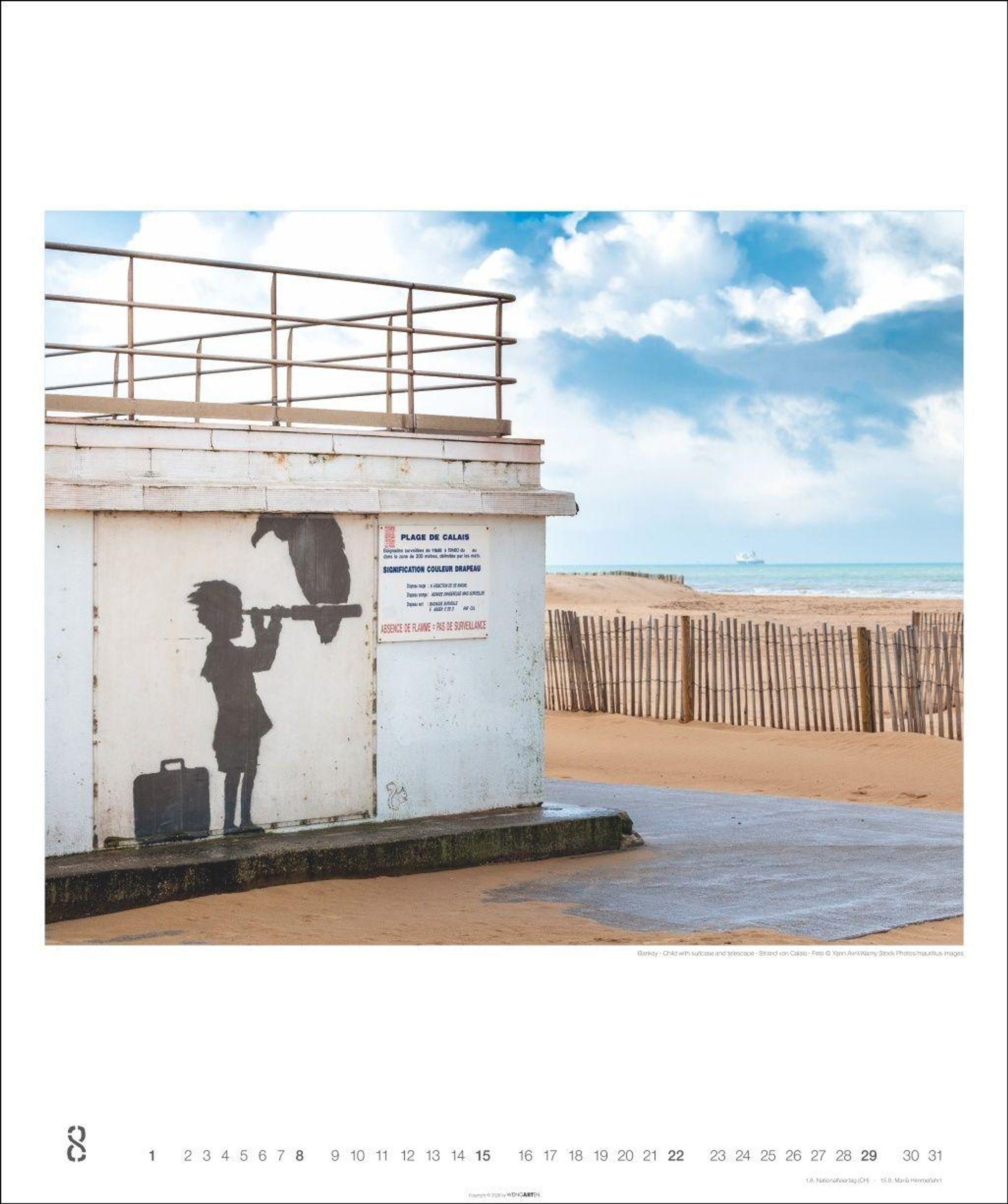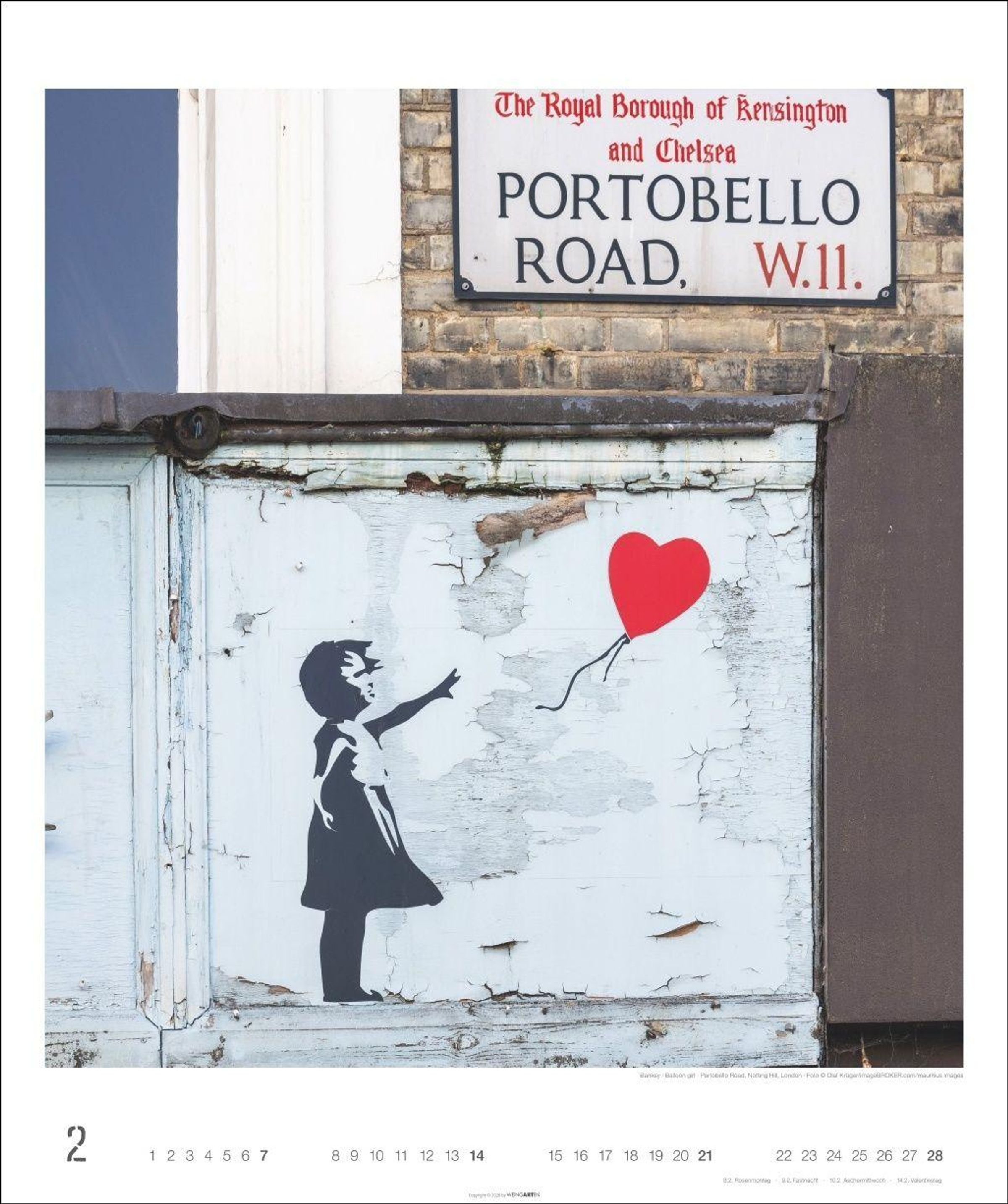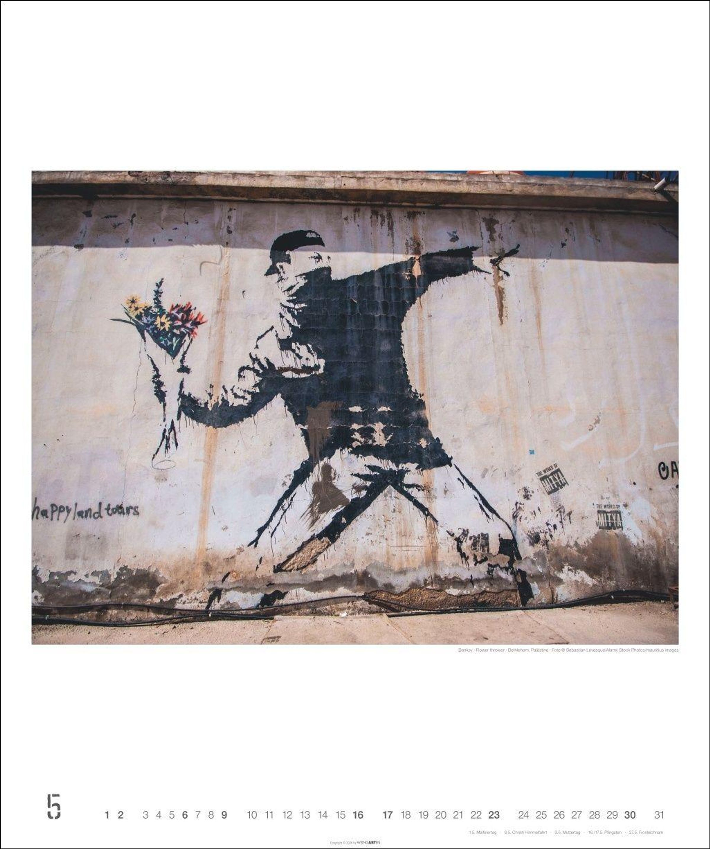 - Guerilla Art in einem Monatskalender mit weltbekannten Abbildungen von Banksys Street-Art-Murals, vom Blumenwerfer bis zu den Kissing Coppers