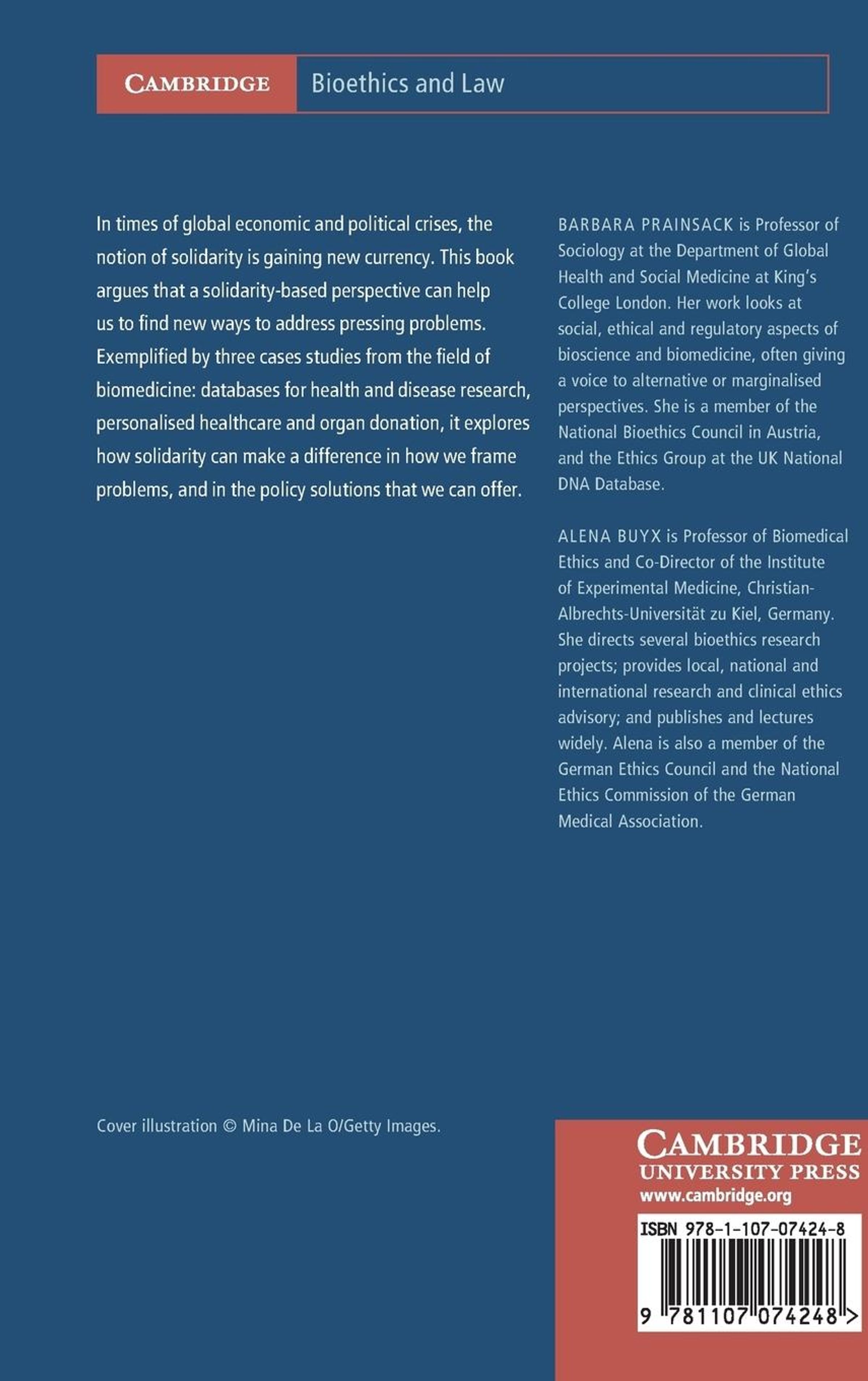 In times of global economic and political crises, the notion of solidarity is gaining new currency. This book argues that a solidarity-based perspective can help us to find new ways to address pressing problems. Exemplified by three case studies from the field of biomedicine: databases for health and disease research, personalised healthcare, and organ donation, it explores how solidarity can make a difference in how we frame problems, and in the policy solutions that we can offer.