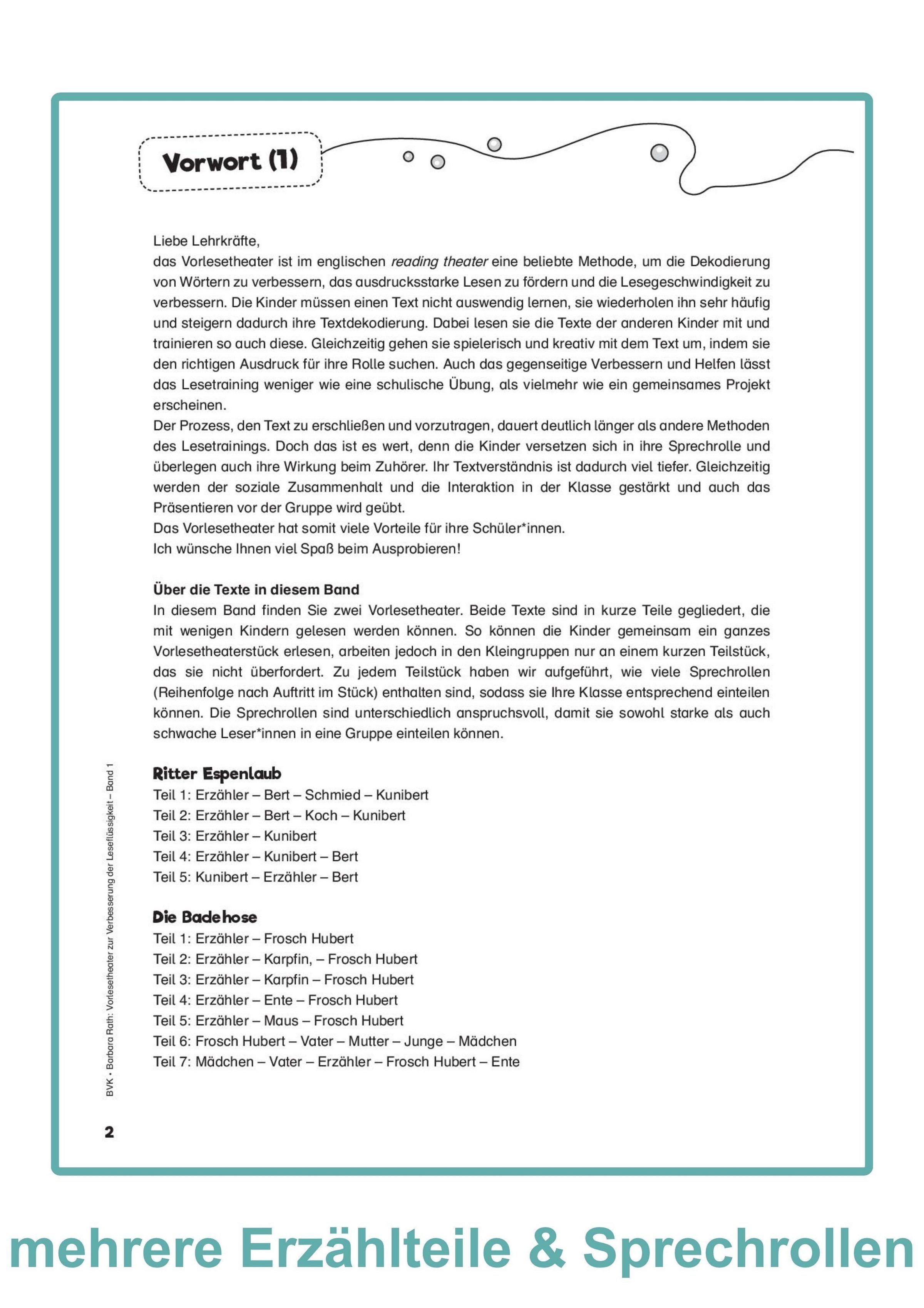 Band 1: In diesem Band finden Sie die zwei humorvollen Vorlesetheater Die Badehose und Ritter Espenlaub. Beide Texte sind in kurze Teile unterteilt, die mit wenigen Kindern gelesen werden können. Die Leserollen sind unterschiedlich anspruchsvoll, sodass Sie sowohl lesestarke als auch leseschwache Leserinnen und Leser in eine Gruppe einteilen können. Diese Differenzierung ermöglicht schnelle Leseerfolge für alle Kinder!