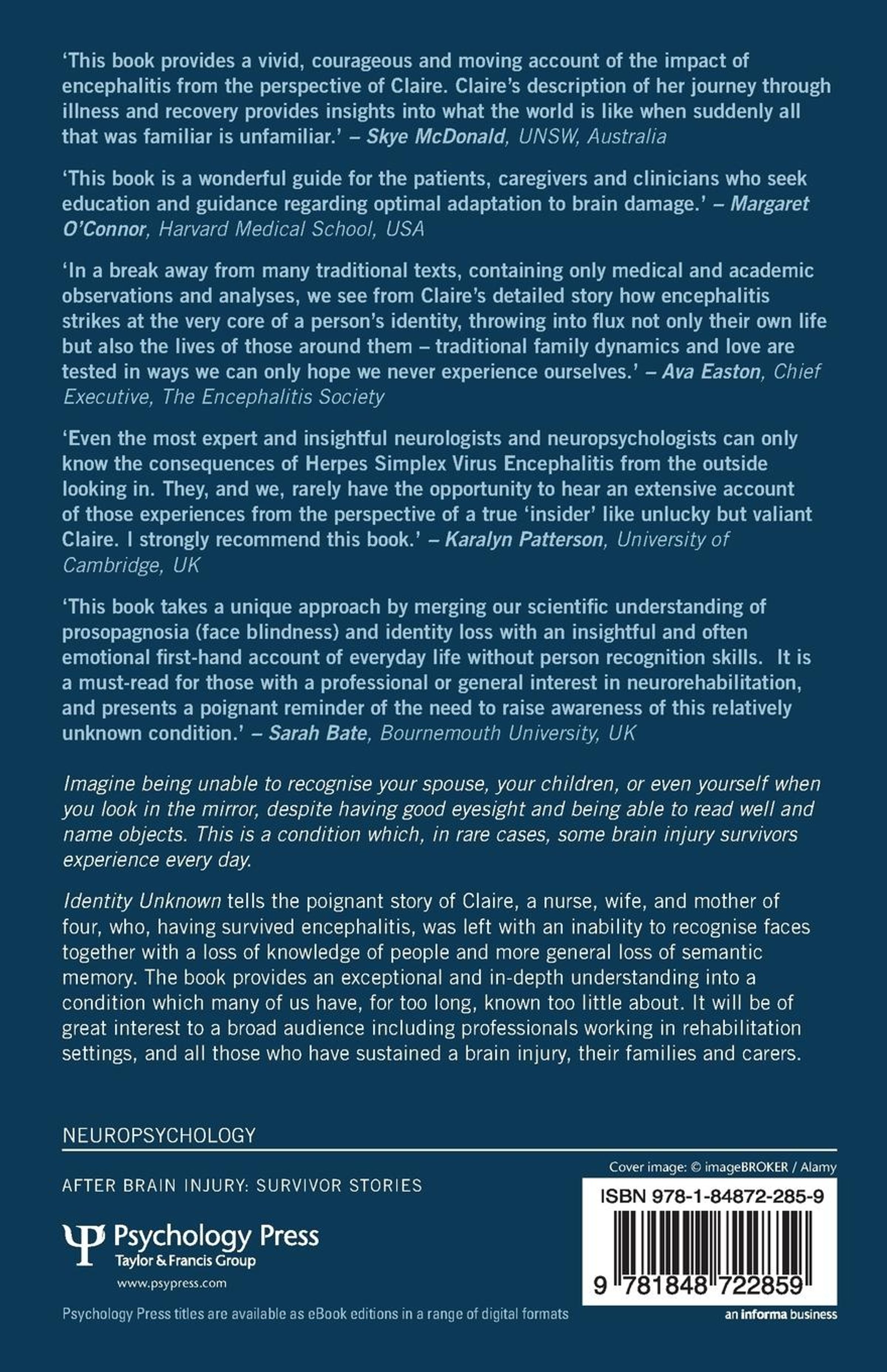 Identity Unknown gives an exceptional, poignant and in-depth understanding of what it is like to live with the severe after-effects of brain damage caused by a viral infection of the brain. It tells the story of Claire, a nurse, wife, and mother of four, who having survived encephalitis, was left with an inability to recognise faces - a condition also known as prosopagnosia together with a loss of knowledge of people and more general loss of semantic memory