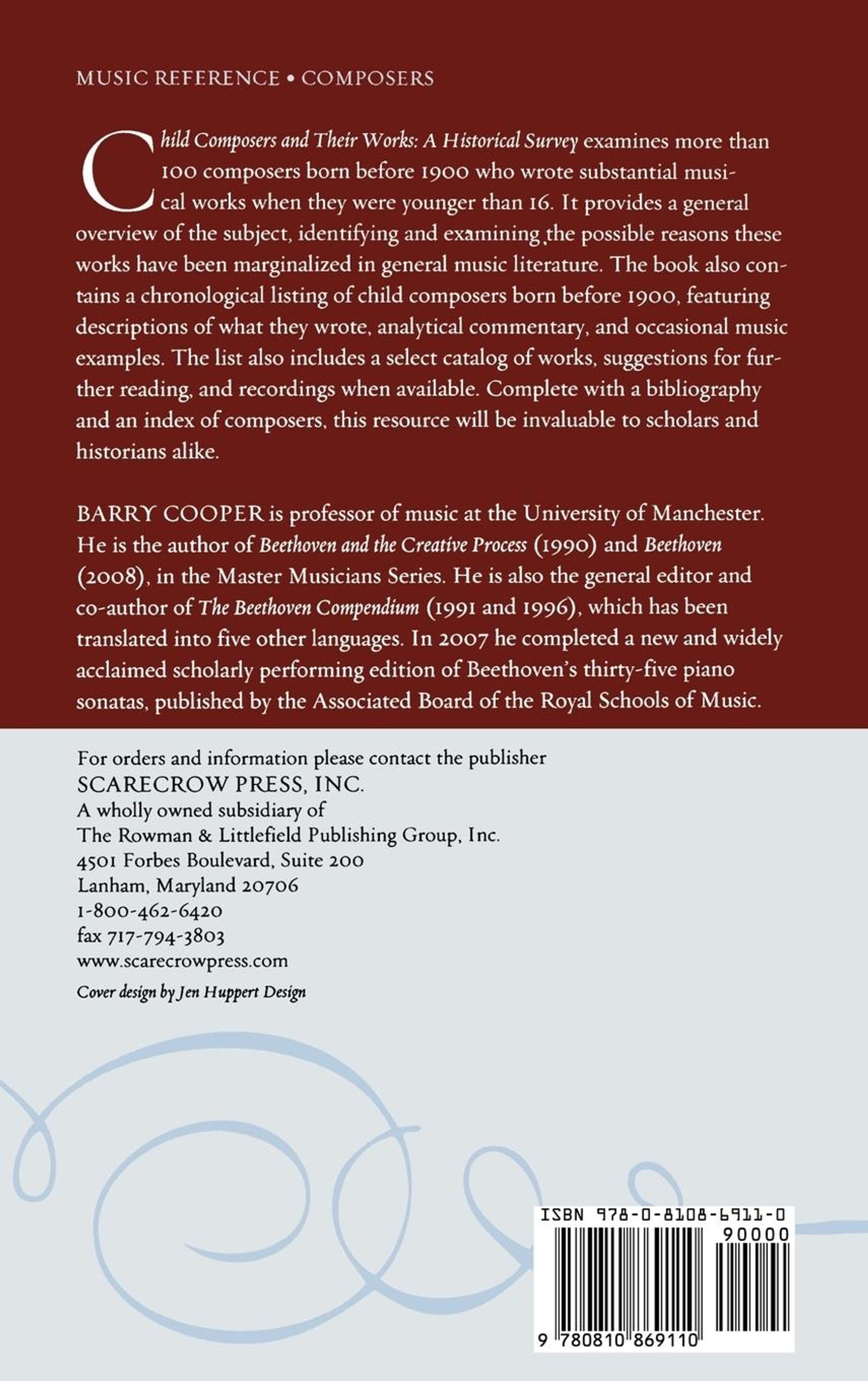 In Child Composers and Their Works: A Historical Survey, Barry Cooper examines over 100 composers born before 1900 who wrote substantial musical works before age 16. The book provides a general overview of the subject, examining the ways and identifying possible reasons these works have been marginalized in the general literature. The book also contains an annotated checklist of over 100 notable child composers, presenting a valuable and handy reference of these creators and their early works.