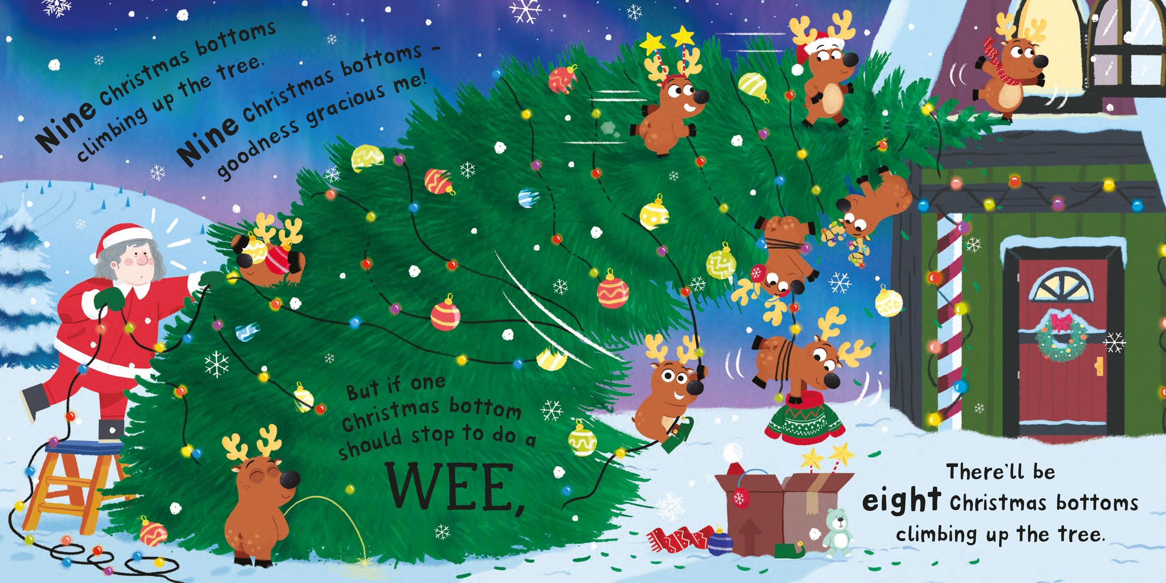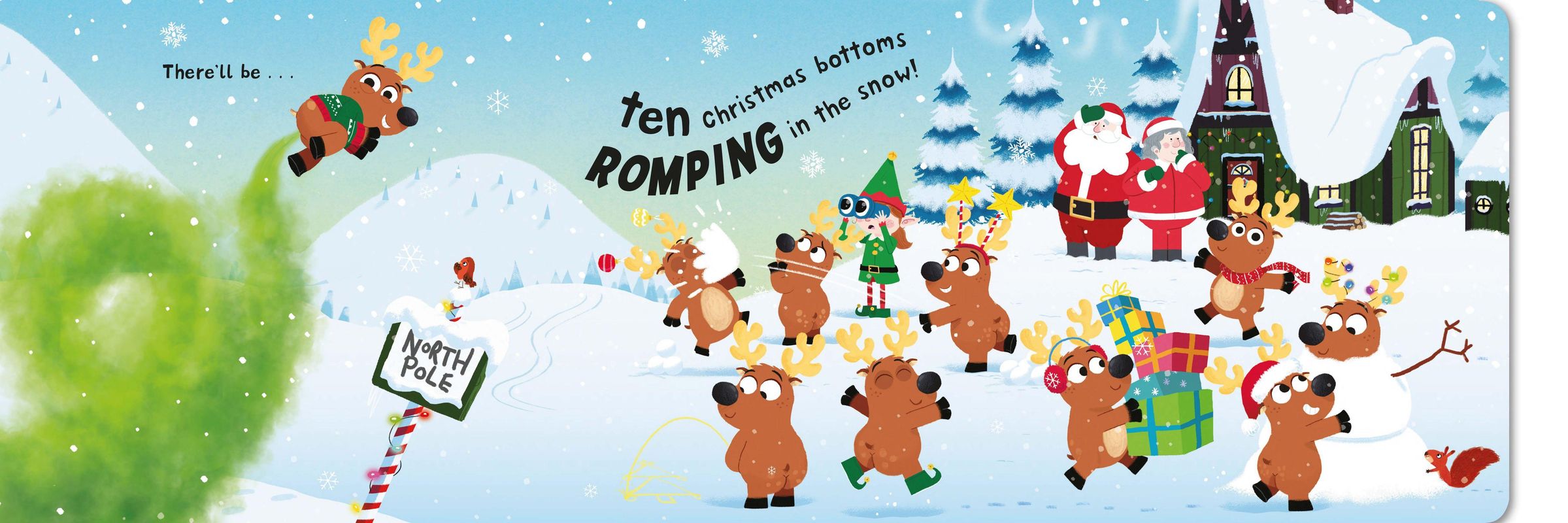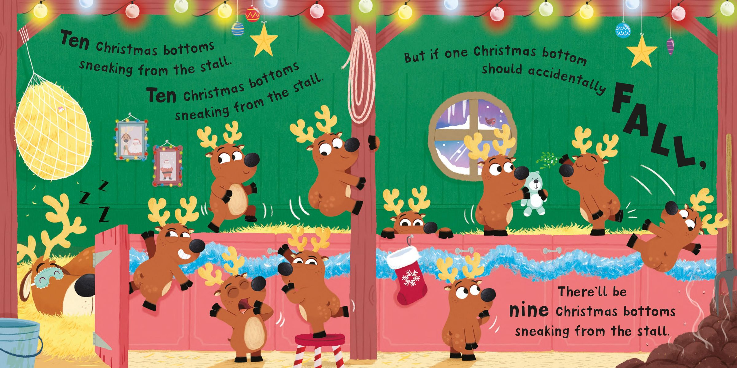 Count down from 10 with the cheeky little reindeer and do your 'sums with bums'! Ten Christmas Bottoms is a laugh-out-loud rhyming story for preschoolers - a festive twist on the nursery rhyme Ten Green Bottles.