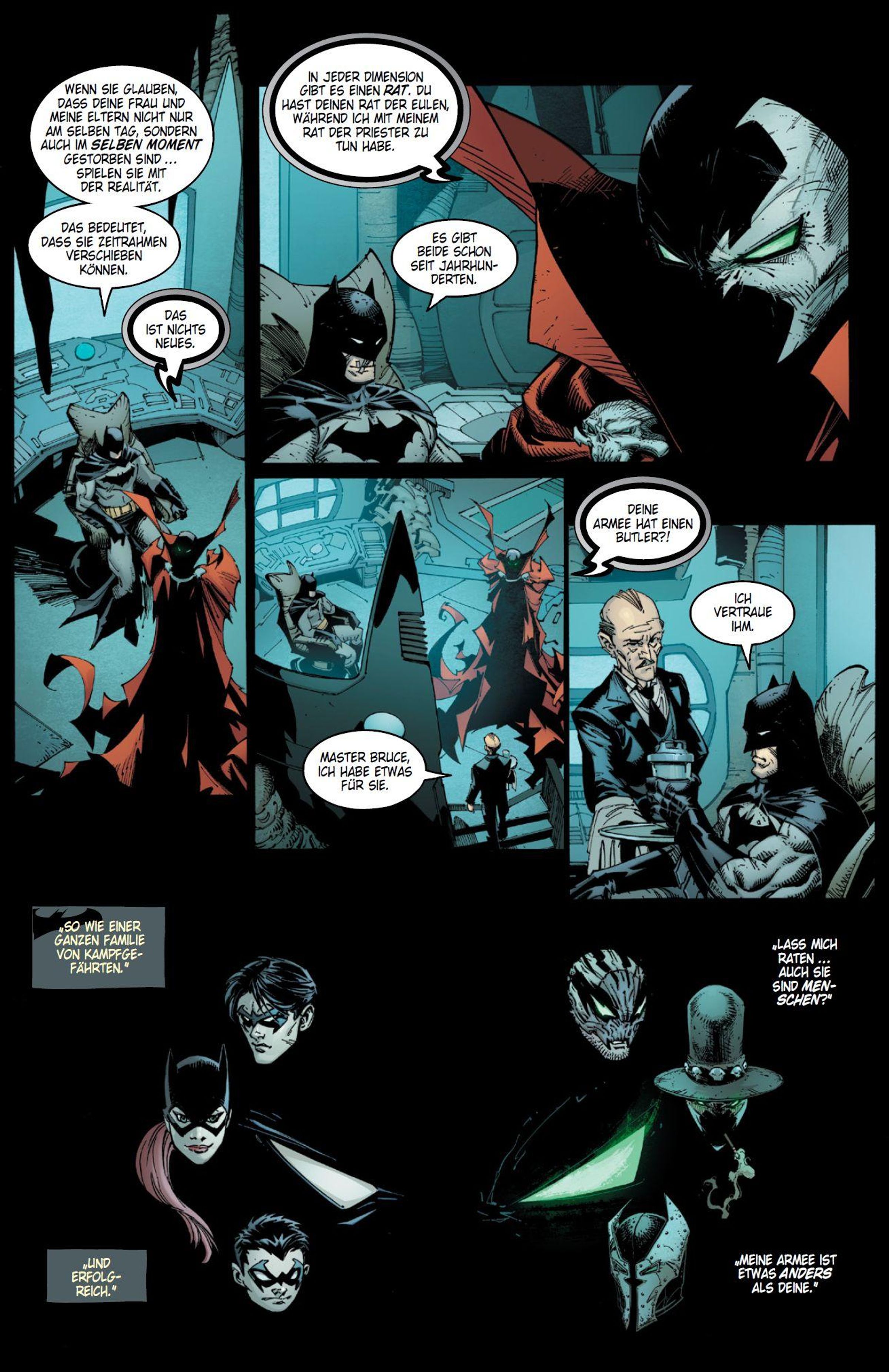 DIE DÜSTEREN HELDEN ZWEIER WELTEN In seiner Welt ist Bruce Wayne der finstere Held Batman, der über Gotham City wacht und dort gegen irre Kriminelle wie den Joker kämpft. Auf der Erde einer anderen Existenzebene wurde Al Simmons zum höllischen Helden Spawn, der das Böse bekämpft. Nun verschlägt es Spawn nach Gotham in die Realität des Dunklen Ritters. Dahinter stecken die finstere Geheimloge der Rat der Eulen und ein teuflischer Gegner von Spawn, und sie wollen die beiden düsteren Helden aufeinanderhetzen...