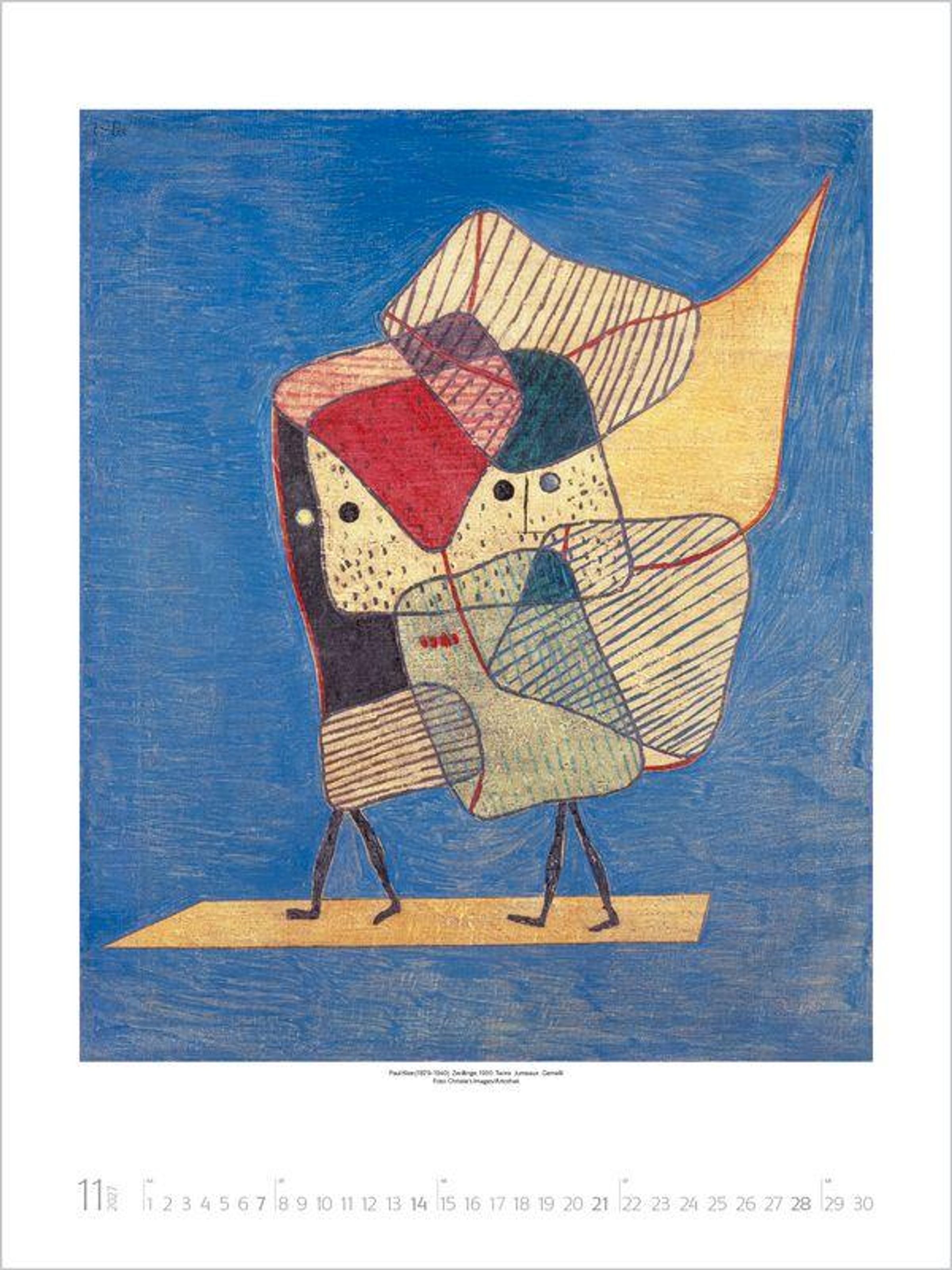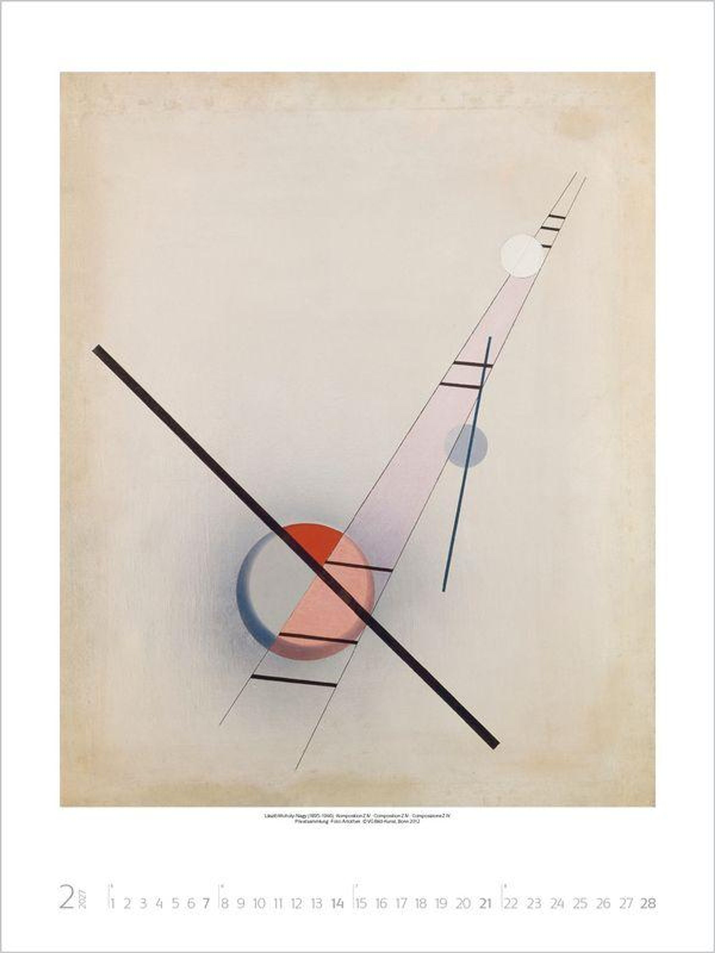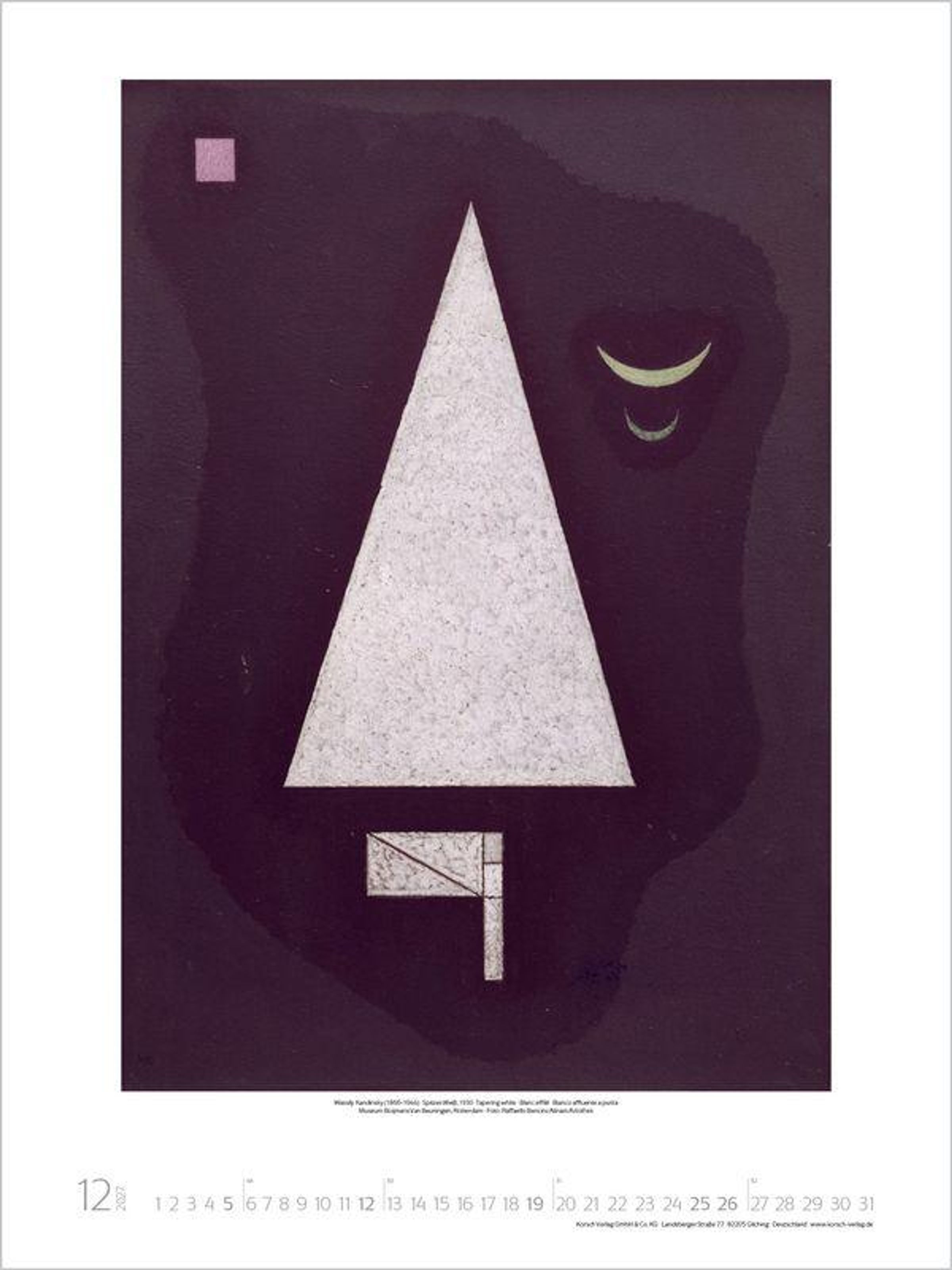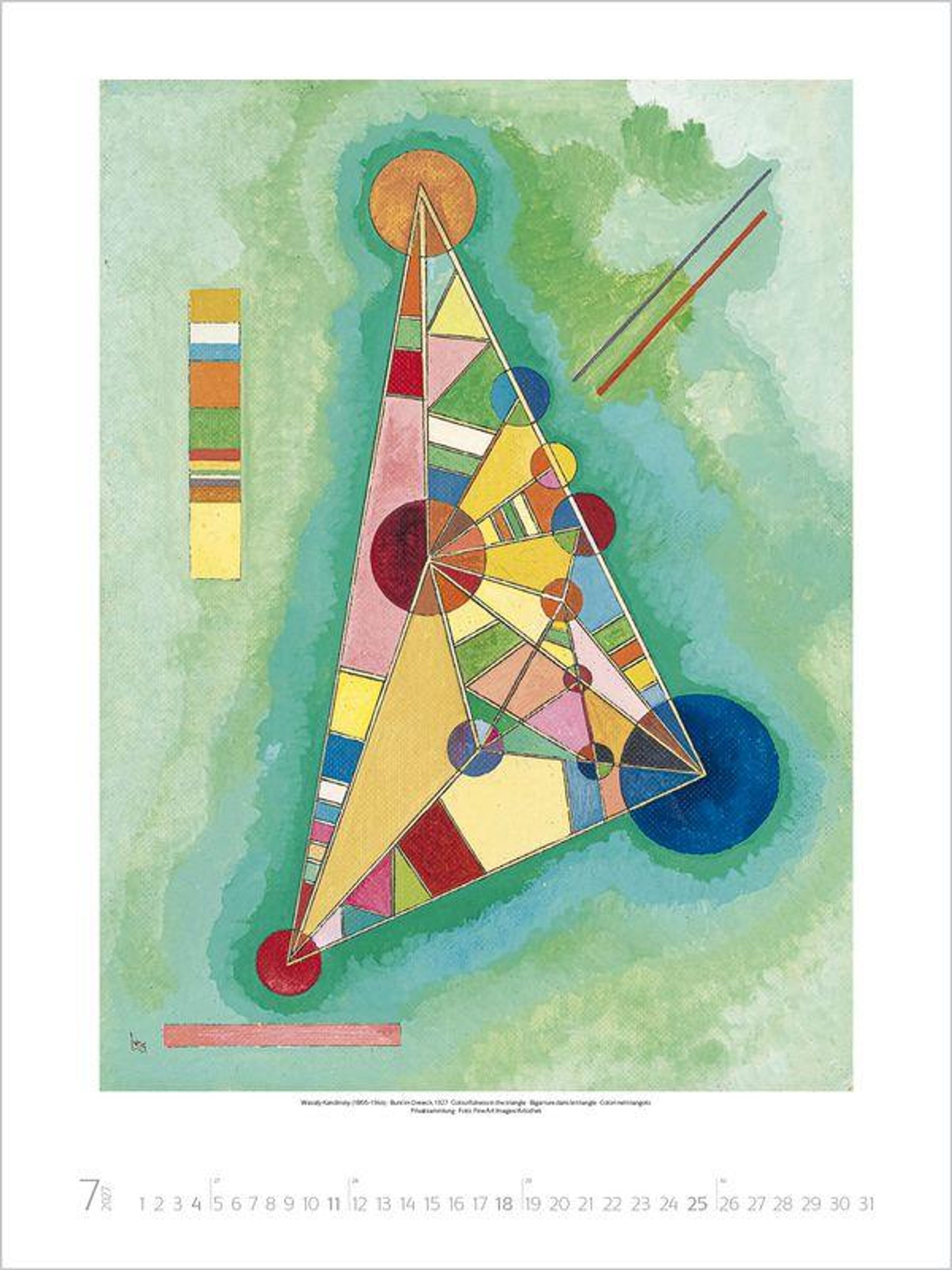 Klarheit, Sachlichkeit und Zweckmäßigkeit sowie das Zusammenwirken von Kunst und Industrie im Sinn umfassender Lebensgestaltung waren die Maximen dieses revolutionär neuen Kunstverständnisses. Der Kalender zeigt eine Auswahl der bekanntesten Werke großer Bauhaus-Künstler wie Klee, Kandinsky und Moholy-Nagy.