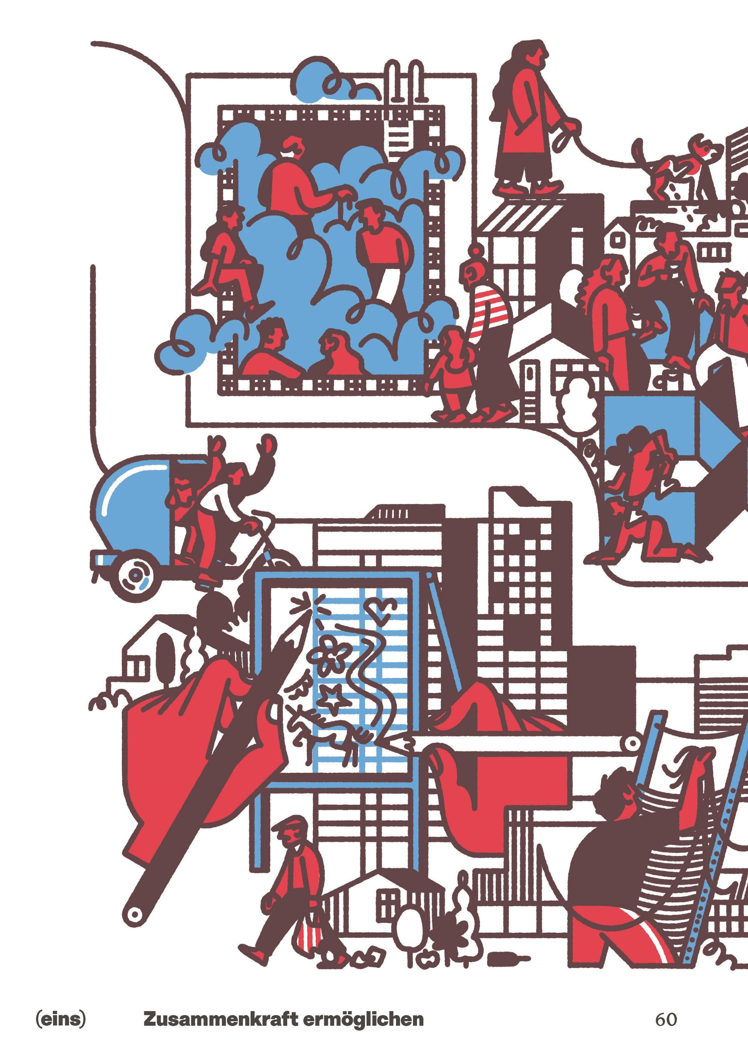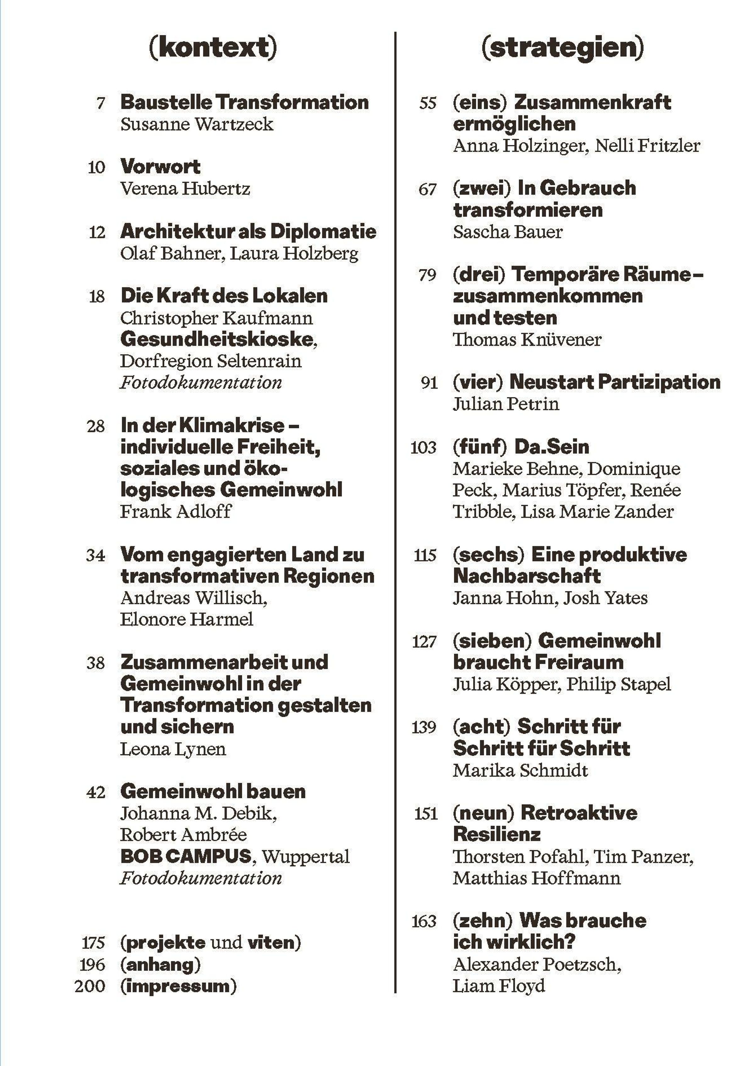 The socially and ecologically conscious transformation of the built environment-whether urban or rural-calls for productive discussions with the community. The sharing of collective experiences gives rise to inspiring ideas and concrete visions for the climate-neutral reconstruction of our lifeworld. Starting from these principles, architects and urbanists present ten strategies for transforming residential and office buildings, urban districts, and traffic infrastructures. They shape processes that rely on discussion and trial and error, taking lived reality seriously, experimenting with temporary utilizations, and encouraging shared responsibility rather than simple acceptance. Together, they are developing a vision of a possible future.