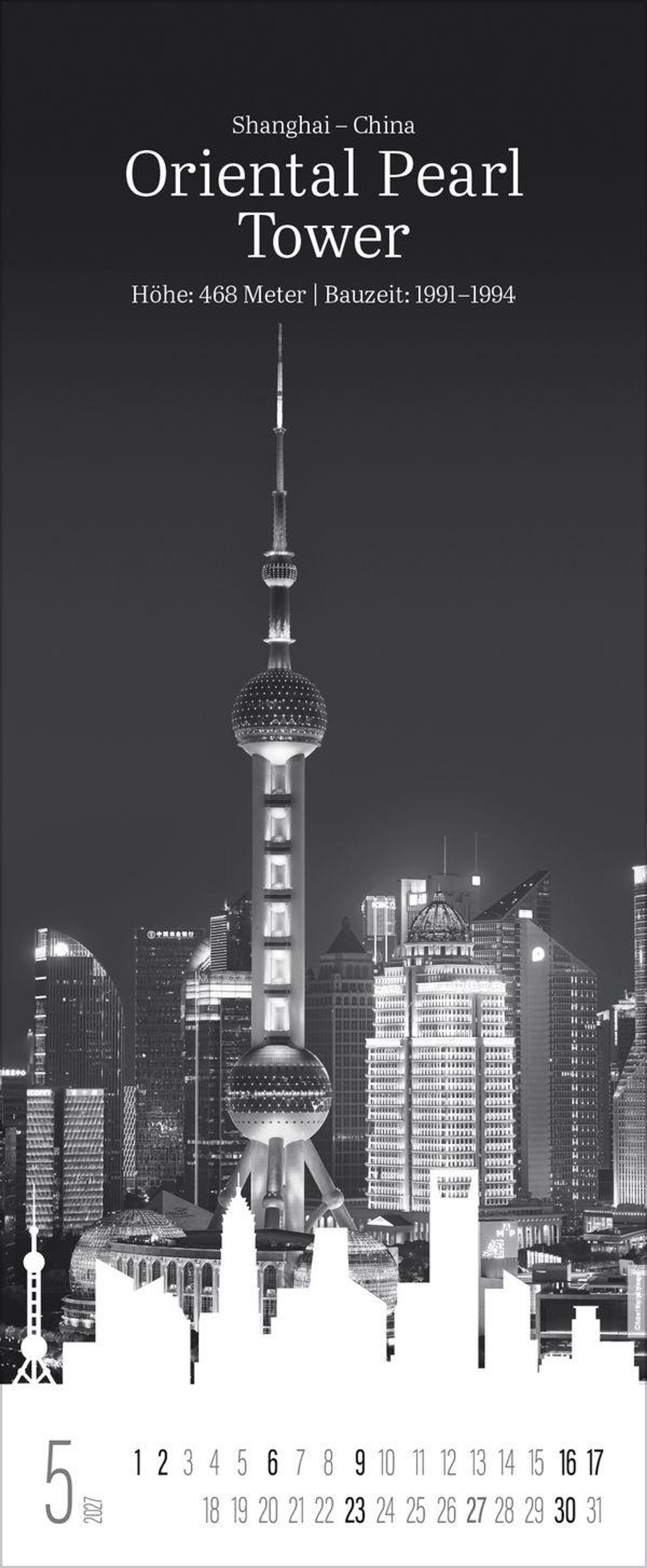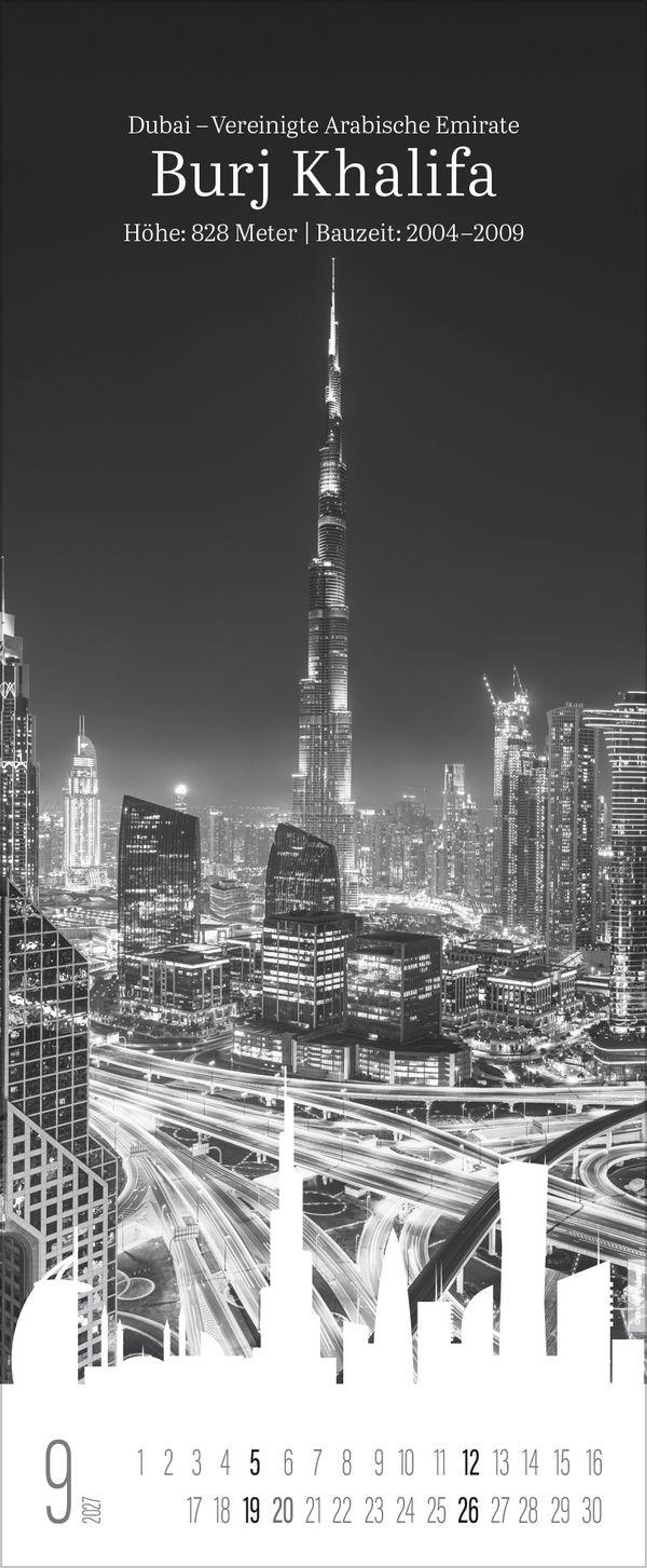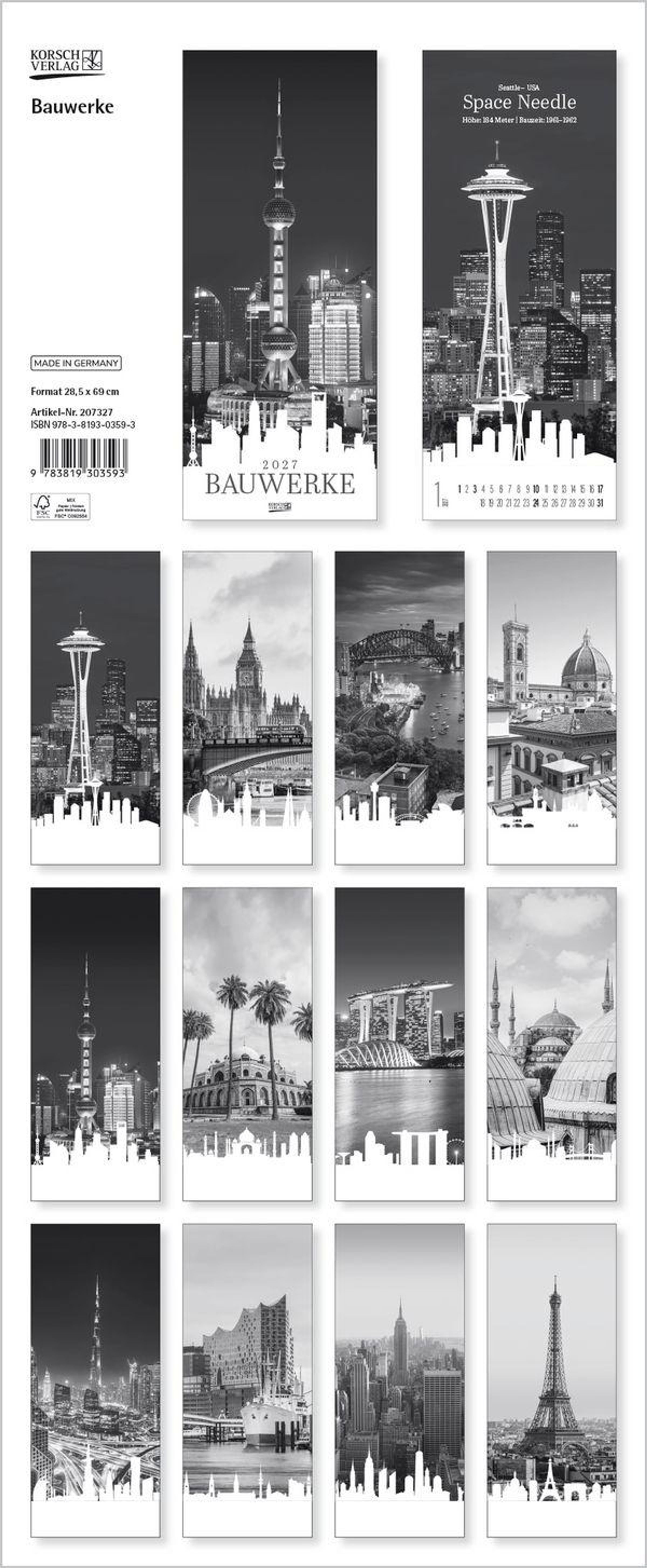 Der Kalender Bauwerke zeigt Monat für Monat beeindruckende Bauwerke rund um den Globus - festgehalten in ausdrucksstarken Schwarz-Weiß-Fotografien. Jedes Motiv wird durch die stilisierte Skyline der jeweiligen Stadt sowie modern gestalteter Typografie ergänzt. Ein eleganter Blickfang für alle Liebhaber von Architektur, Fotografie und urbaner Ästhetik.