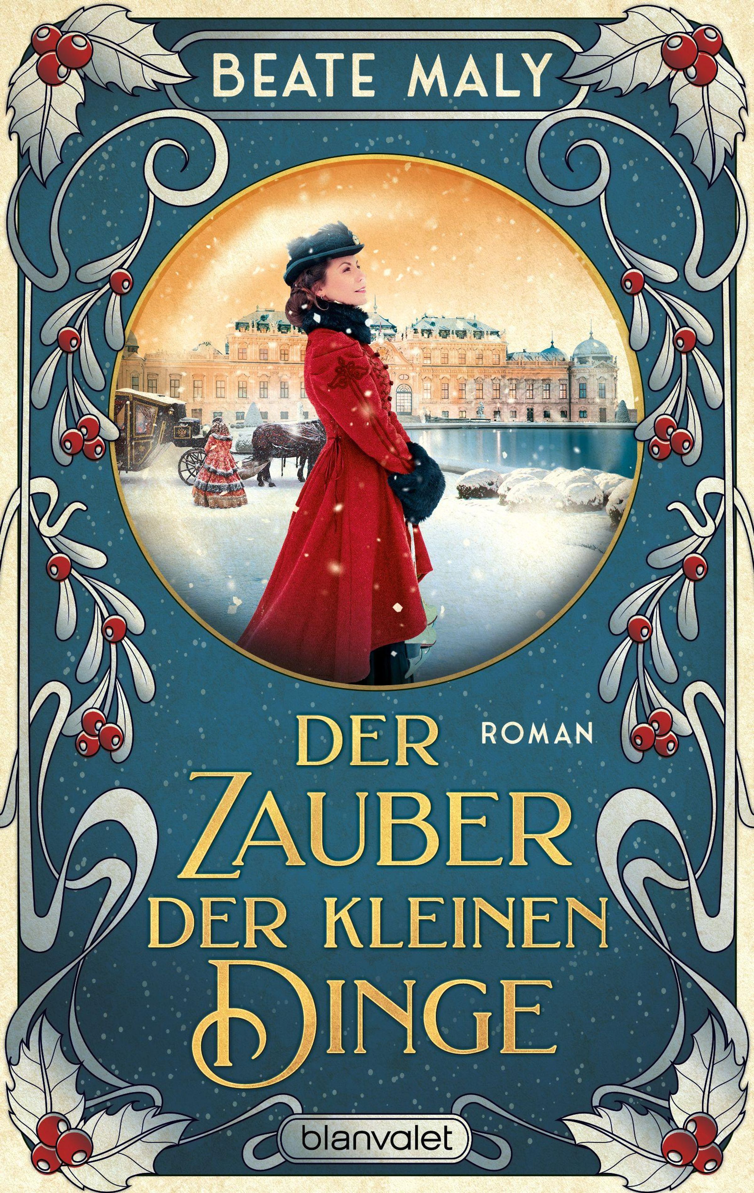 Beate Maly "Der Zauber der kleinen Dinge". Illustration mit Frau in rotem Mantel, Schneefall, historisches Gebäude im Hintergrund., Buch