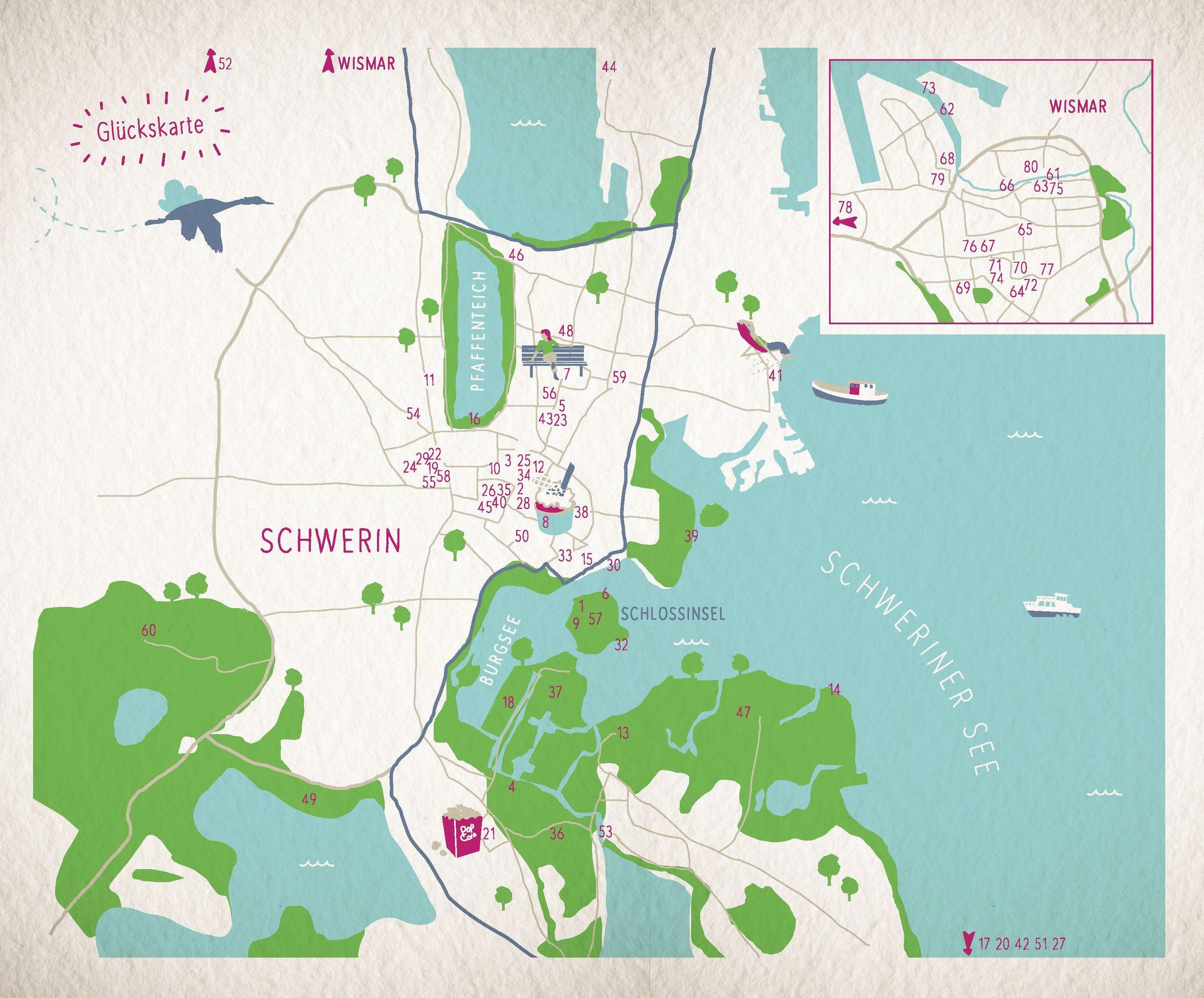 "Glücksorte in Schwerin" und "Mit Wismar". Illustration mit Sehenswürdigkeiten, Natur und Freizeitaktivitäten., Buch