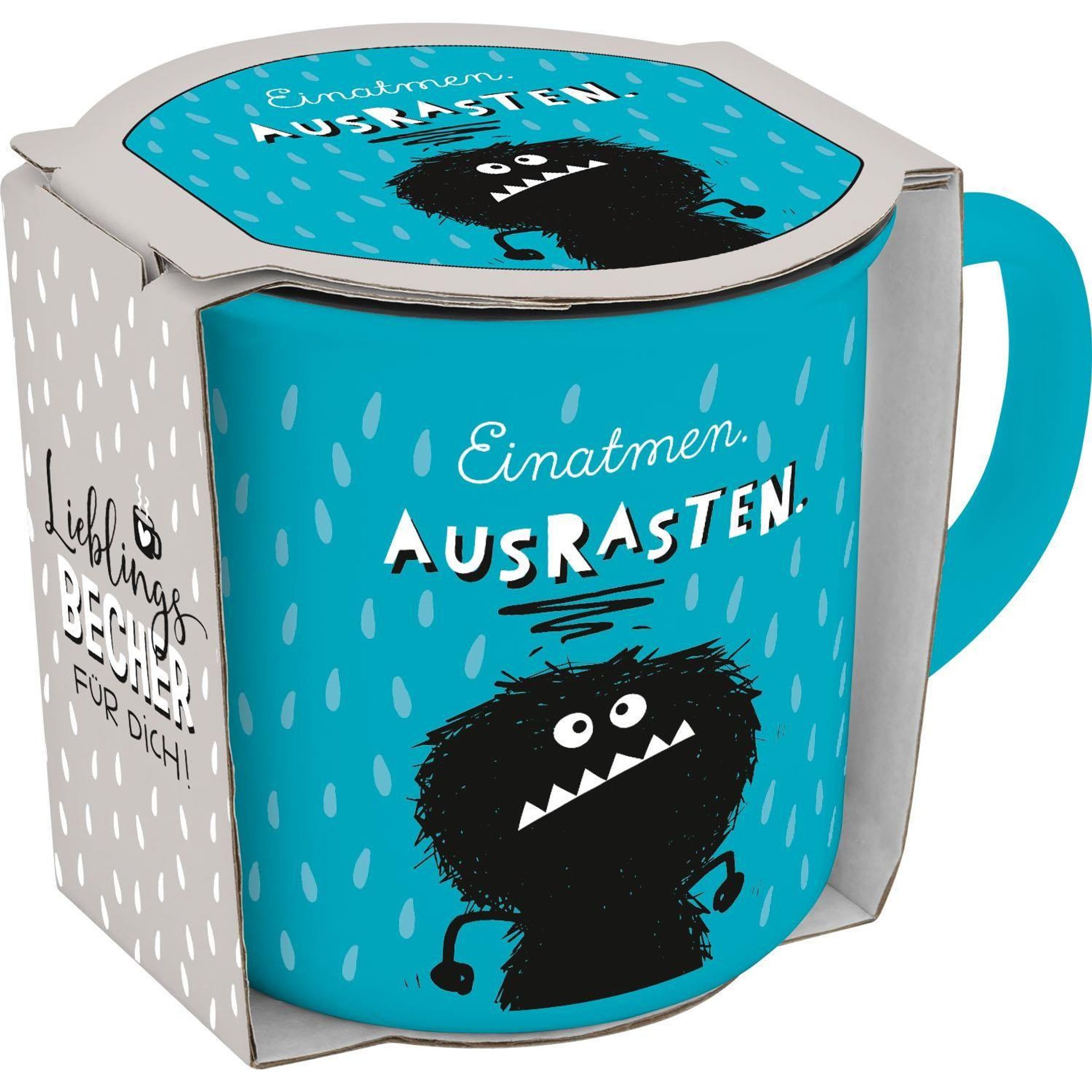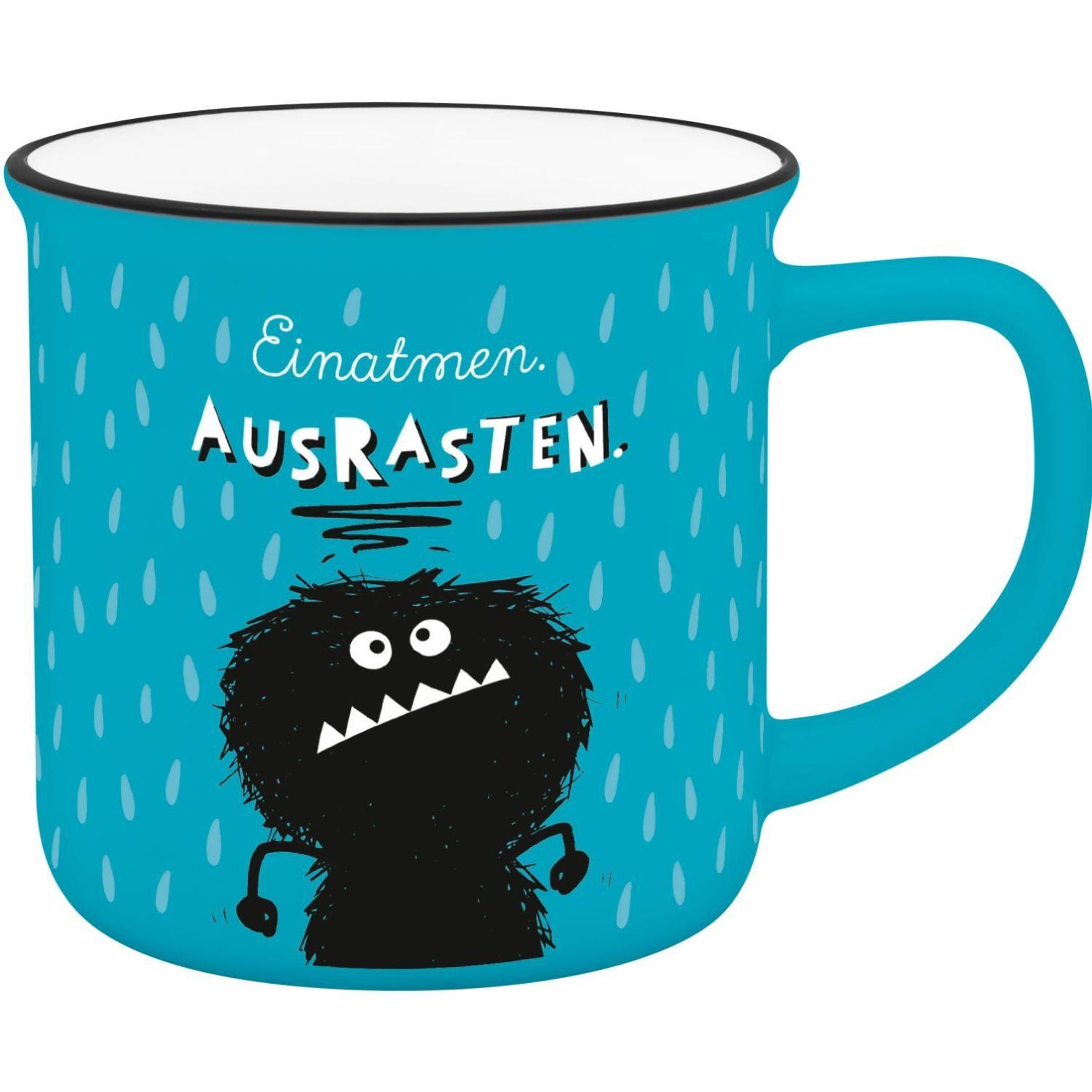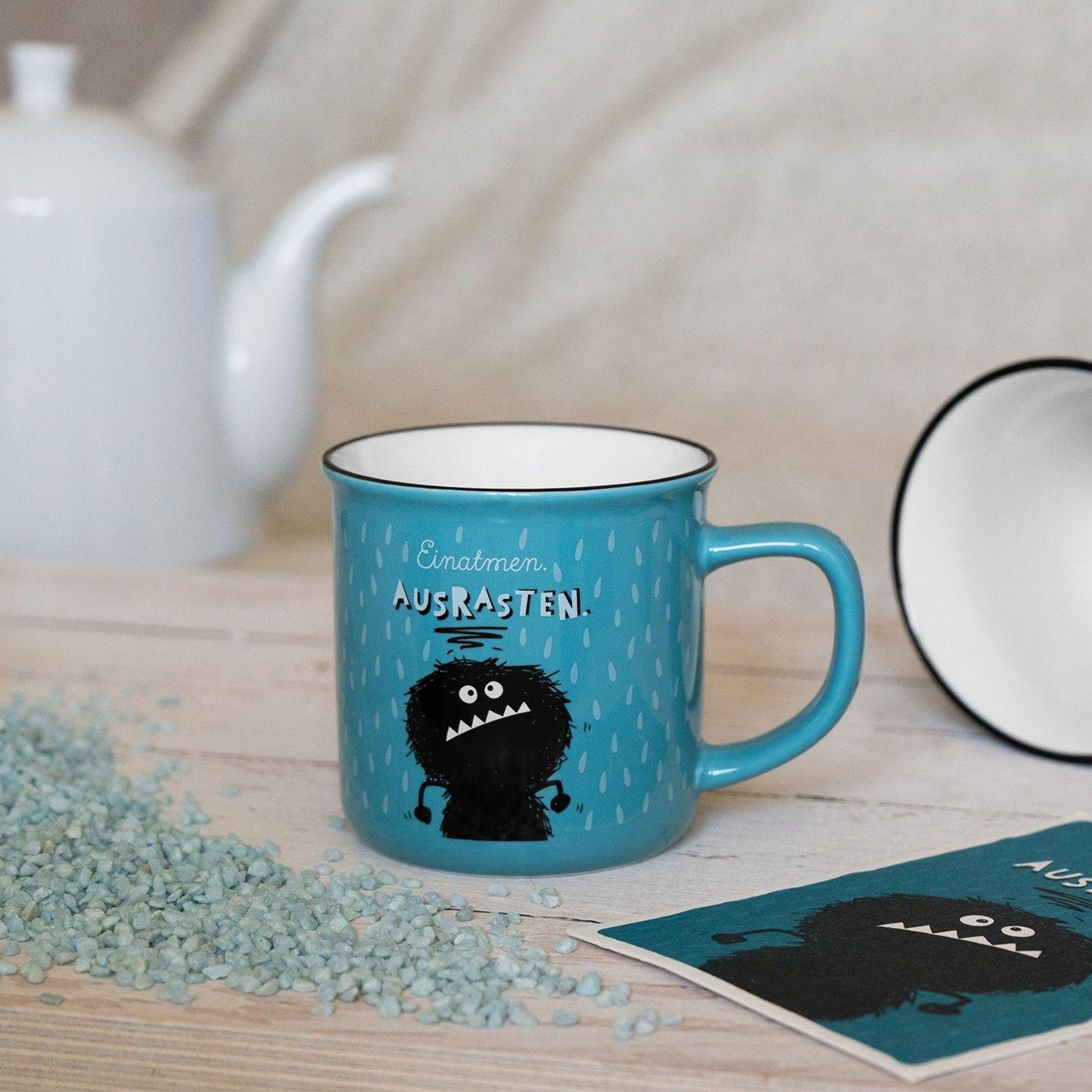 NOSTALGISCHER VINTAGE-LOOK: Tassen, Kaffeebecher und Teetassen in angesagtem Retro-Design, in Emaille-Optik und mit liebevollem Text :-) Dieser Becher mit Spruch im angesagten Nostalgie-Look bringt Farbe und frischen Wind an den gedeckten Tisch, in die Kaffeerunde und ins Büro. TASSE MIT SPRUCH: Becher mit farbigem Moster-Motivdruck und mit Spruch "Ausrasten", Material New Bone China Porzellan, Volumen 35 cl, Höhe 8, 4 cm, Durchmesser 9 cm, Lieblingsbecher verpackt in passend gestalteter Geschenk-Banderole. VOLL IM TREND: Egal ob Lama, Faultier, Einhorn oder trendige Sprüche, Farben, Formen und Material für einen natürlichen, nachhaltigen Look - wir sorgen dafür, dass die brandaktuellen Trends zuhause, bei Familie, Freunden und den Kollegen landen. Valentinstag, zum Jahrestag, zum Geburtstag, zu Weihnachten oder einfach so als schönes Mitbringsel. Als Präsent für die Freundin, den Freund, Mama, Papa, Partner, für Sie, für Ihn und auch alle anderen Lieblingsmenschen geeignet.