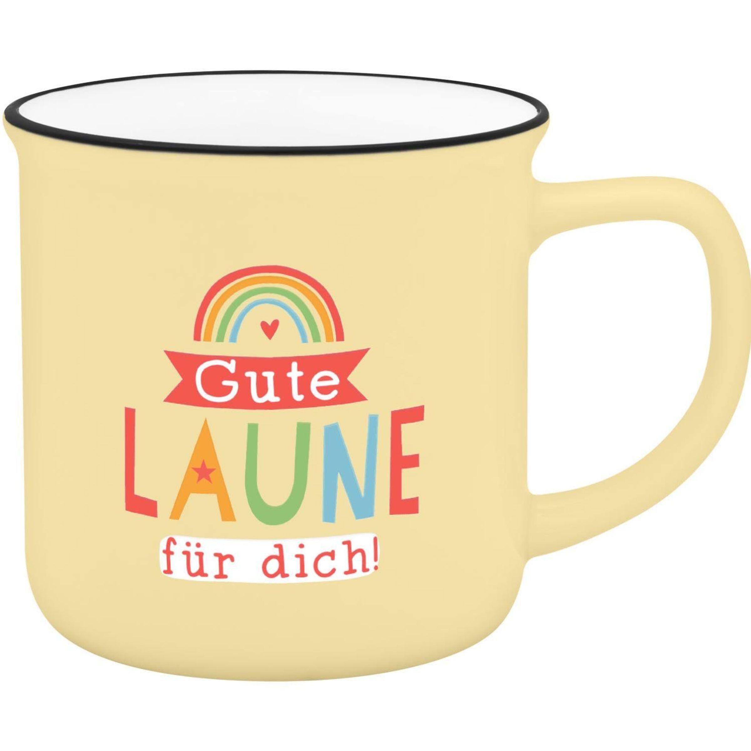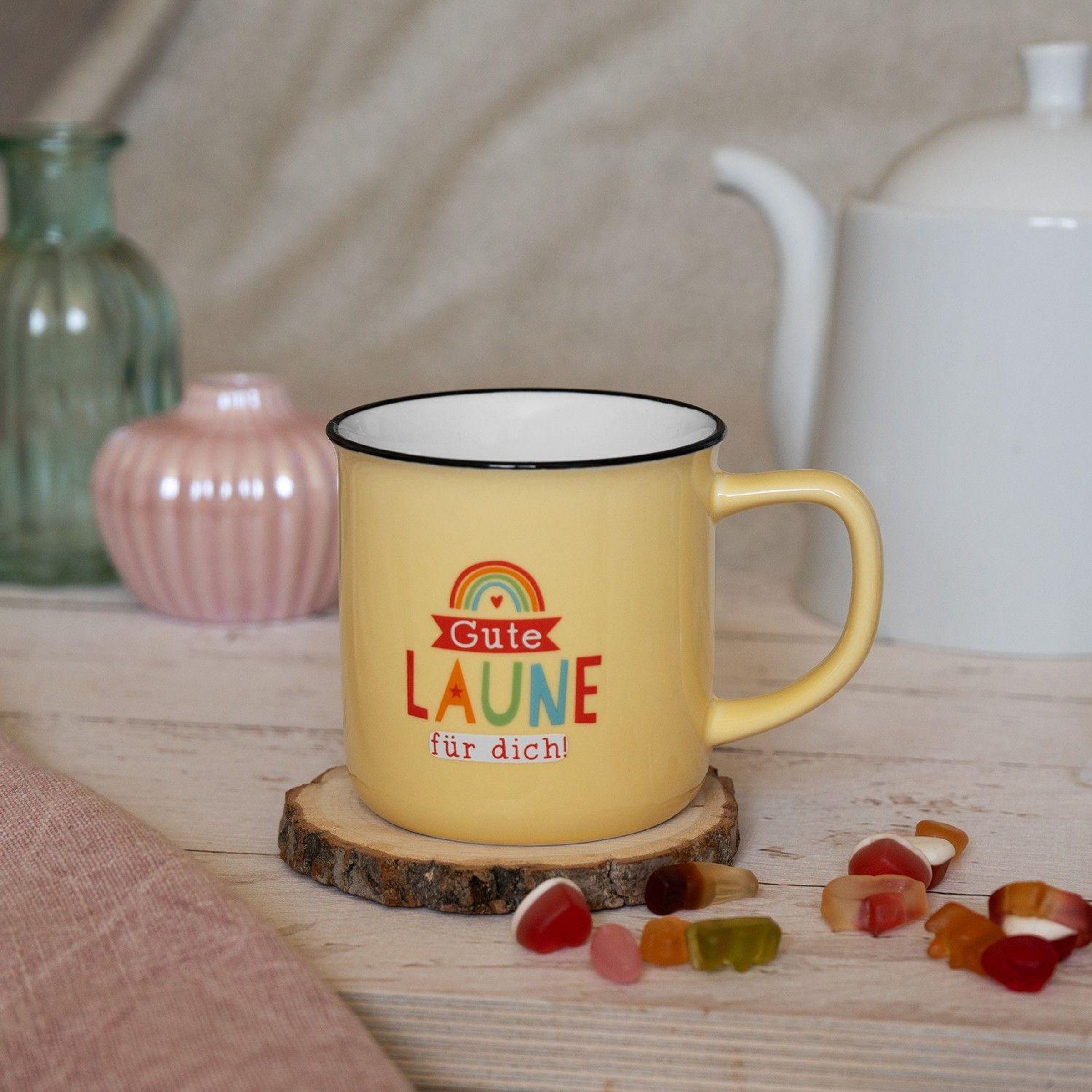 NOSTALGISCHER VINTAGE-LOOK: Tassen, Kaffeebecher und Teetassen in angesagtem Retro-Design, in Emaille-Optik und mit liebevollem Text :-) Dieser Becher mit Spruch im angesagten Nostalgie-Look bringt Farbe und frischen Wind an den gedeckten Tisch, in die Kaffeerunde und ins Büro. TASSE MIT SPRUCH: Becher mit farbigem Motivdruck und mit Spruch "Gute Laune für dich", Material New Bone China Porzellan, Volumen 35 cl, Höhe 8, 4 cm, Durchmesser 9 cm, Lieblingsbecher verpackt in passend gestalteter Geschenk-Banderole. VOLL IM TREND: Egal ob Lama, Faultier, Einhorn oder trendige Sprüche, Farben, Formen und Material für einen natürlichen, nachhaltigen Look - wir sorgen dafür, dass die brandaktuellen Trends zuhause, bei Familie, Freunden und den Kollegen landen. IDEALE GESCHENKIDEE: Passend für jeden Anlass als Geschenk, zum Beispiel zum Valentinstag, zum Jahrestag, zum Geburtstag, zu Weihnachten oder einfach so als schönes Mitbringsel. Als Präsent für die Freundin, den Freund, Mama, Papa, Partner, für Sie, für Ihn und auch alle anderen Lieblingsmenschen geeignet.