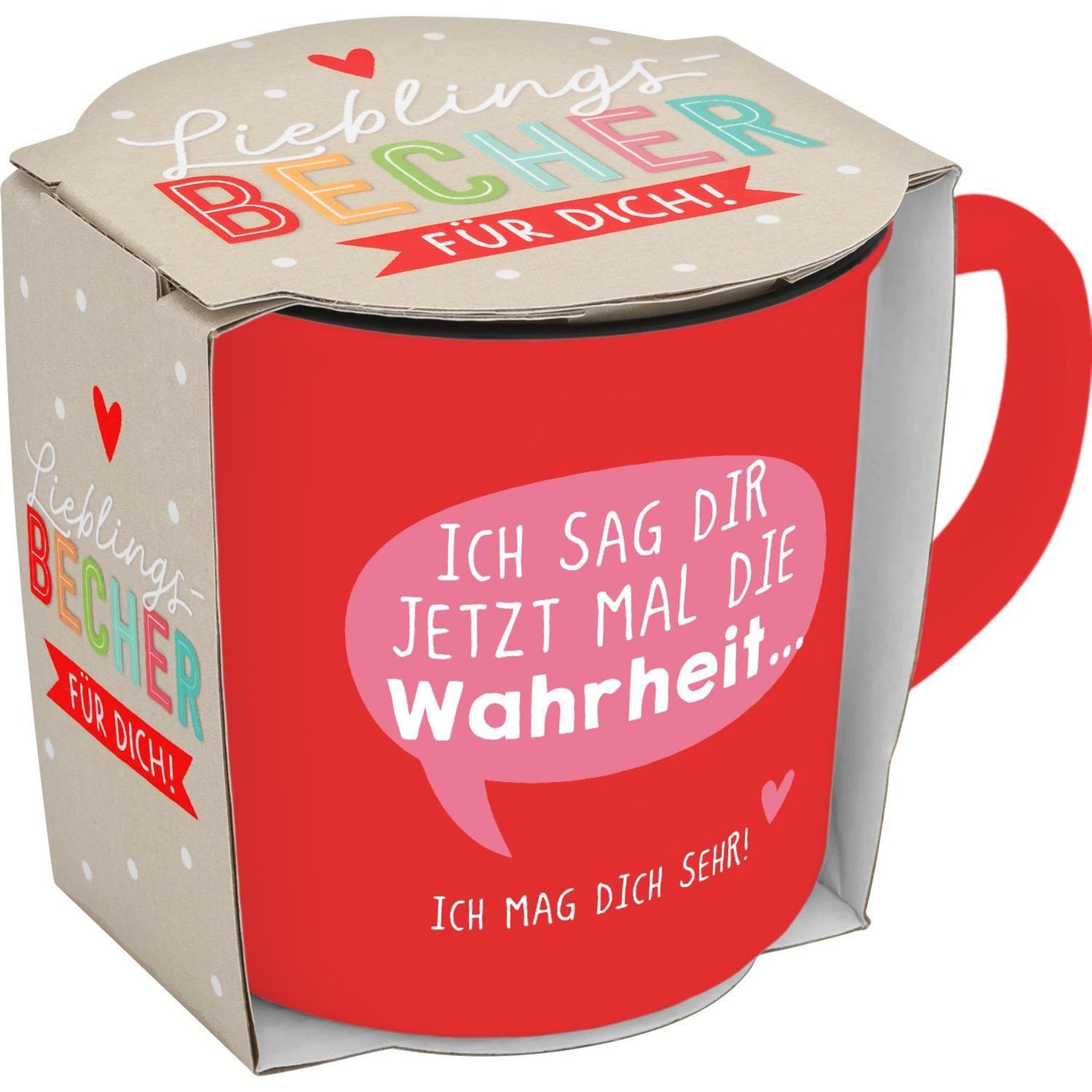 NOSTALGISCHER VINTAGE-LOOK: Tassen, Kaffeebecher und Teetassen in angesagtem Retro-Design, in Emaille-Optik und mit liebevollem Text :-) Dieser Becher mit Spruch im angesagten Nostalgie-Look bringt Farbe und frischen Wind an den gedeckten Tisch, in die Kaffeerunde und ins Büro. TASSE MIT SPRUCH: Becher mit farbigem Motivdruck und mit Spruch "Ich sag dir mal die Wahreit..., Ich mag dich sehr!", Material New Bone China Porzellan, Volumen 35 cl, Höhe 8, 4 cm, Durchmesser 9 cm, Lieblingsbecher verpackt in passend gestalteter Geschenk-Banderole. VOLL IM TREND: Egal ob Lama, Faultier, Einhorn oder trendige Sprüche, Farben, Formen und Material für einen natürlichen, nachhaltigen Look - wir sorgen dafür, dass die brandaktuellen Trends zuhause, bei Familie, Freunden und den Kollegen landen. IDEALE GESCHENKIDEE: Passend für jeden Anlass als Geschenk, zum Beispiel zum Valentinstag, zum Jahrestag, zum Geburtstag, zu Weihnachten oder einfach so als schönes Mitbringsel. Als Präsent für die Freundin, den Freund, Mama, Papa, Partner, für Sie, für Ihn und auch alle anderen Lieblingsmenschen geeignet.