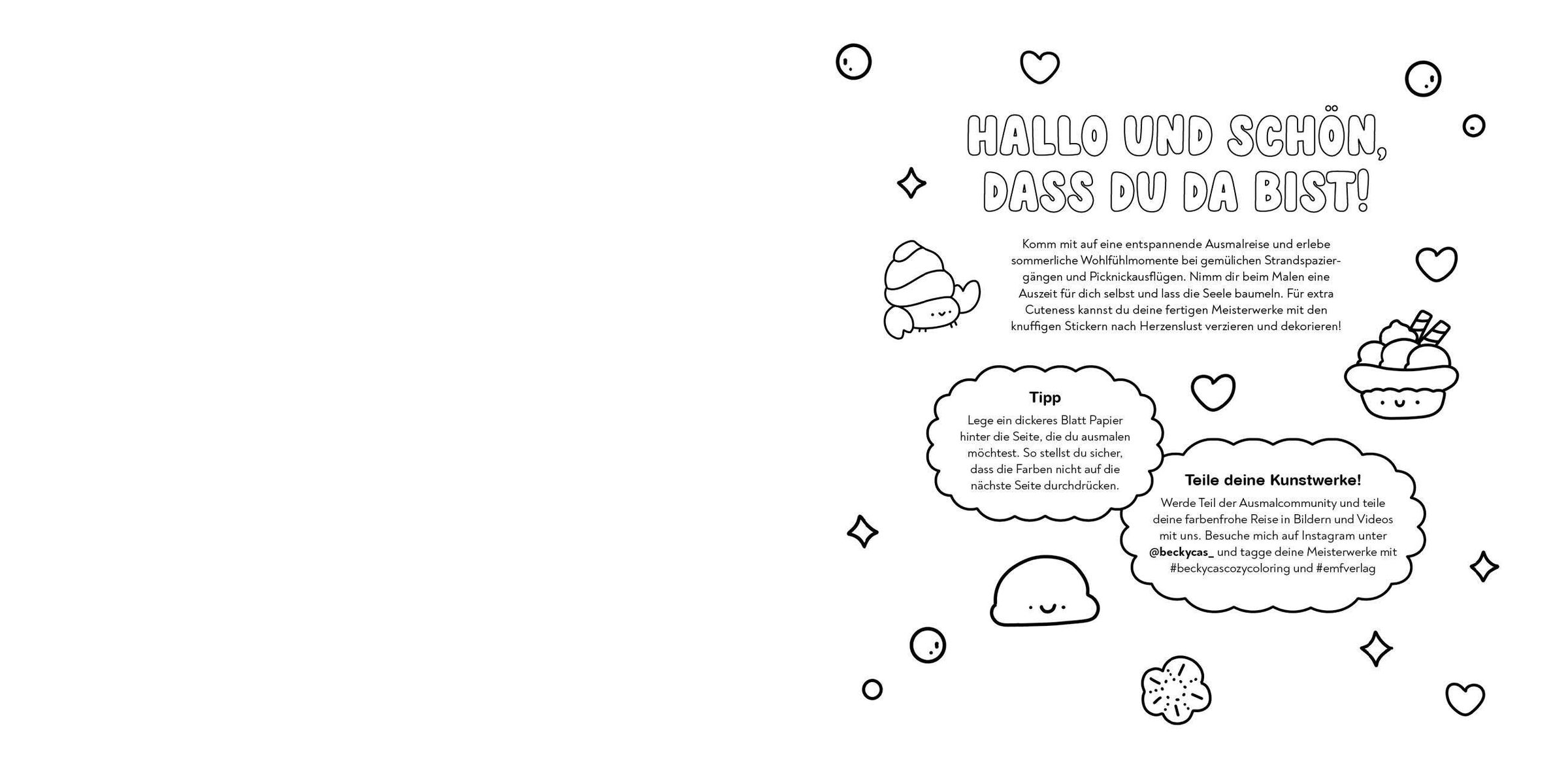 Cozy Cloring Star @beckycas_ nimmt dich in cozy Ausmalszenen mit zu sommerlichen Wohlfühlmomenten. Komm mit auf gemütliche Strandspaziergänge, leckeres Eisessen oder entspannte Picknickausflüge mit flauschigen Freunden und genieße die warme Jahreszeit. Und das Tollste: Mit den über 100 passenden Stickernkannst du deine fertigen Werke zusätzlich dekorieren und verzieren - für den Extra-Cutness-Faktor!