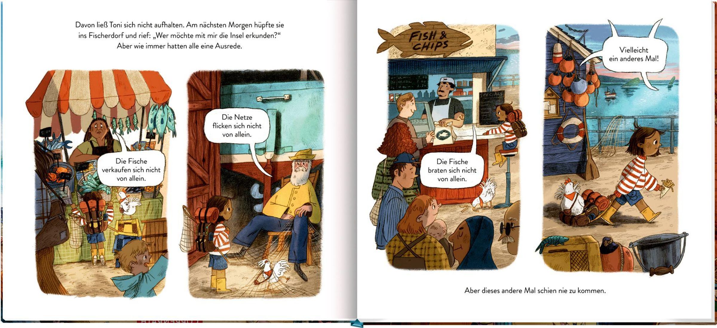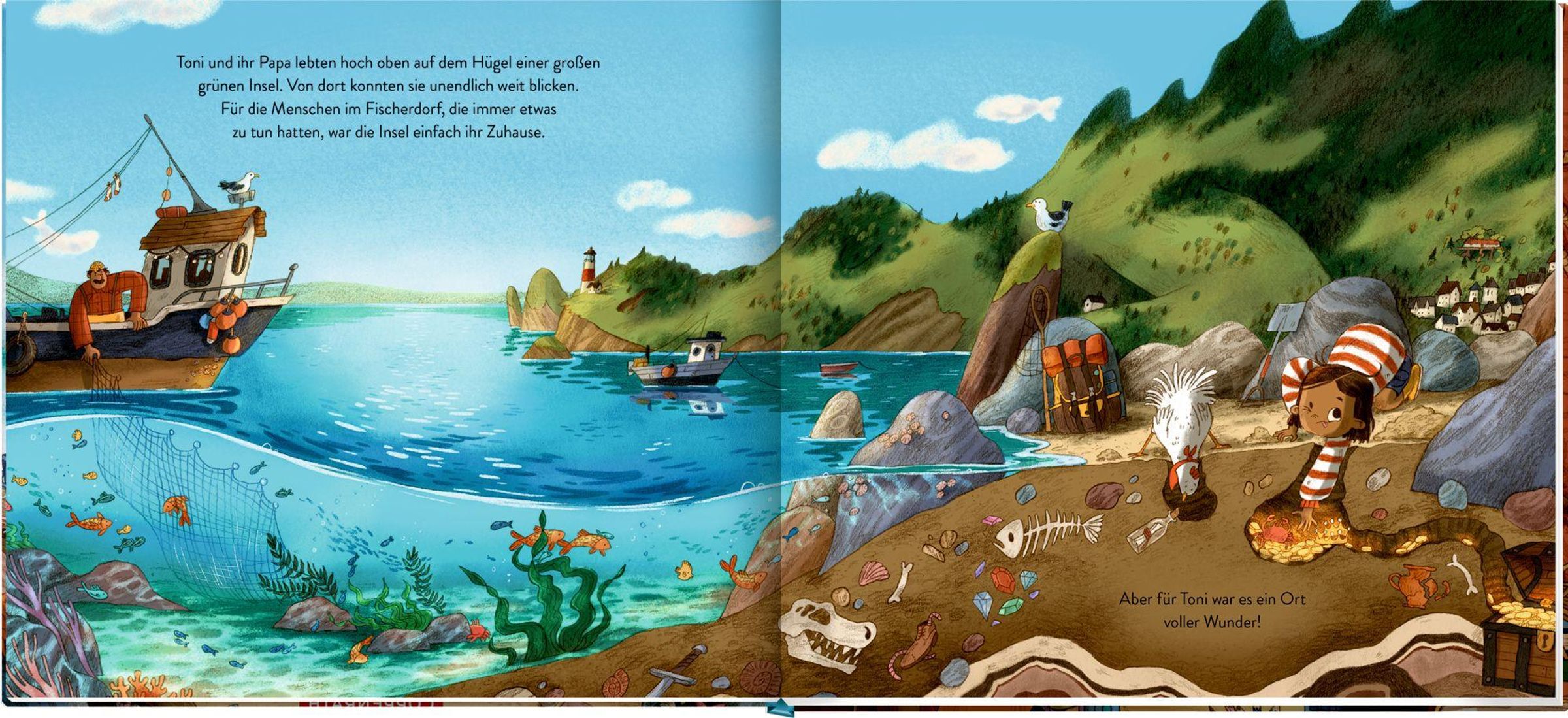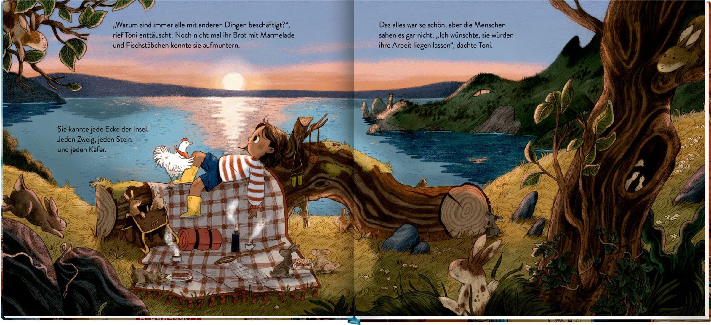 Auf Tonis kleiner Insel scheint alles vertraut - bis plötzlich die Fische verschwunden sind. Gemeinsam mit Papa begibt sich Toni auf eine behutsame Entdeckungsreise. Die Geschichte lädt dazu ein, genauer hinzusehen, zur Ruhe zu kommen und das Wunderbare im Alltag zu entdecken.