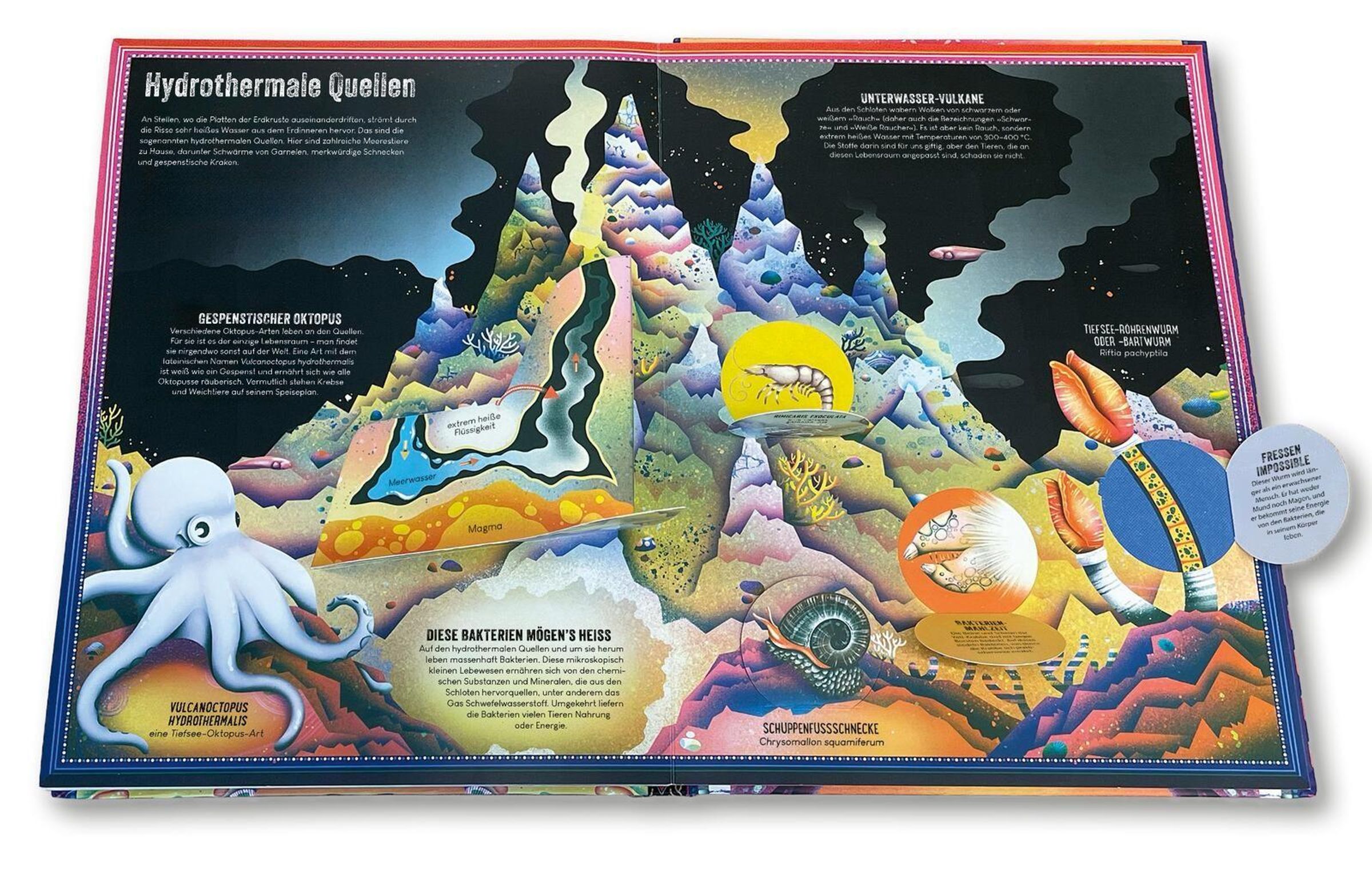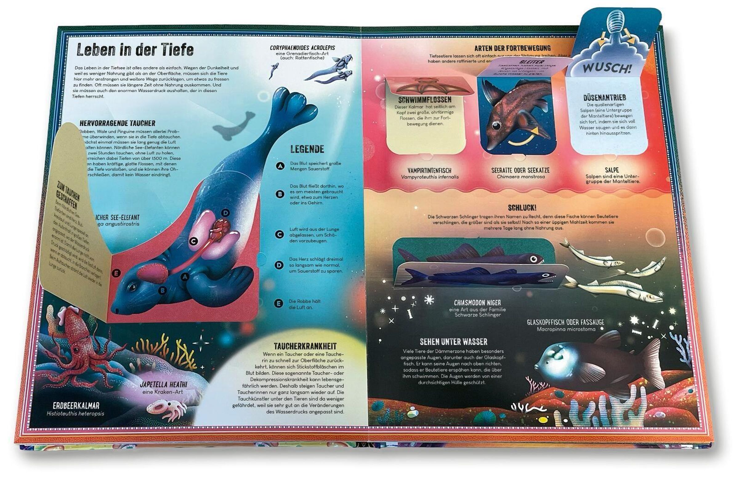 Von erstaunlichen Anglerfischen bis hin zu riesigen Riesenkalmaren: Dieses hochwertige Buch mit seiner eindrucksvollen Papiertechnik zeigt kunstvoll gestaltete 3-dimensionale Pop-ups und Klappen und gewährt so einen faszinierenden Blick in den außergewöhnlichen Lebensraum Tiefsee.
