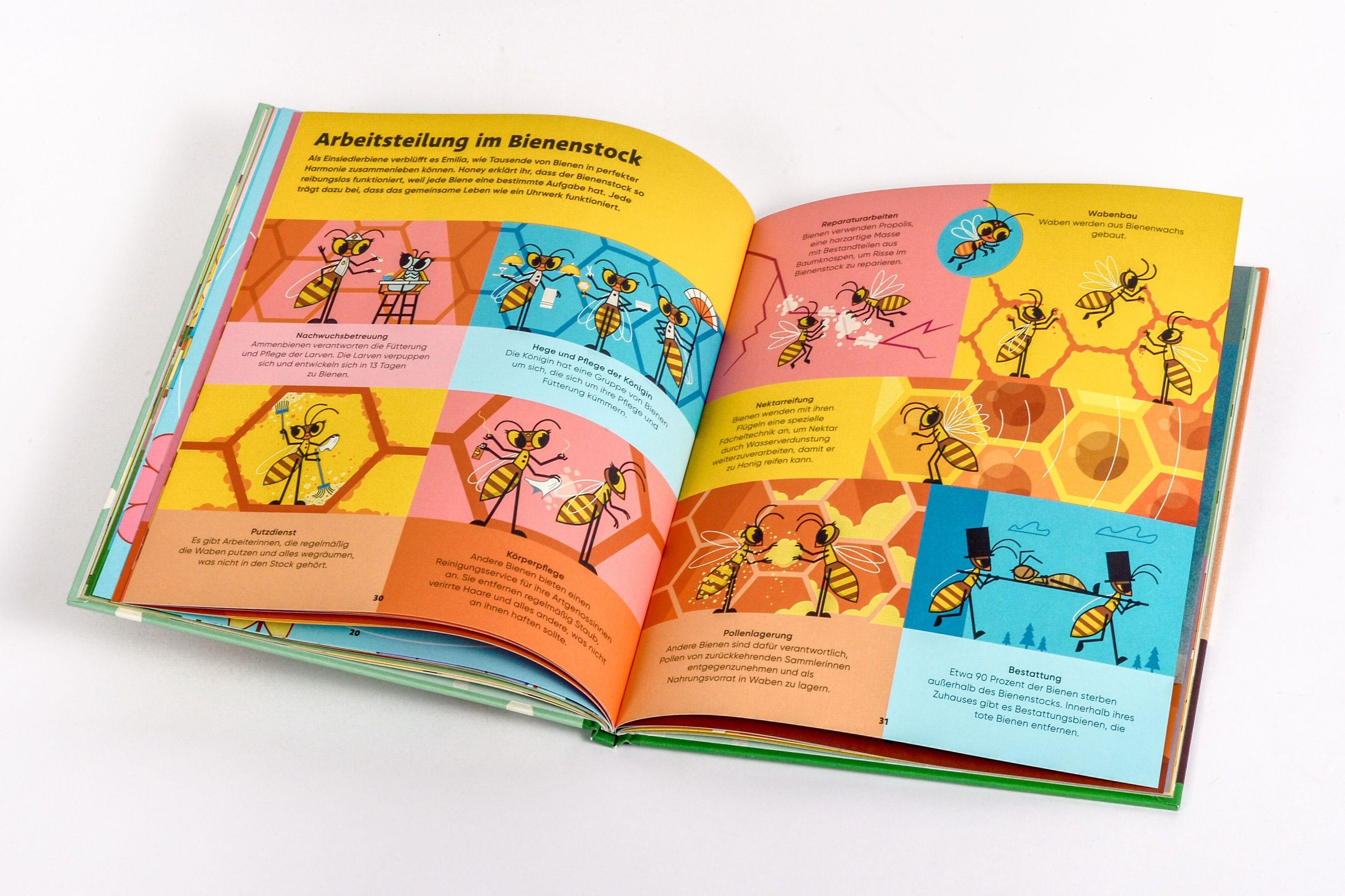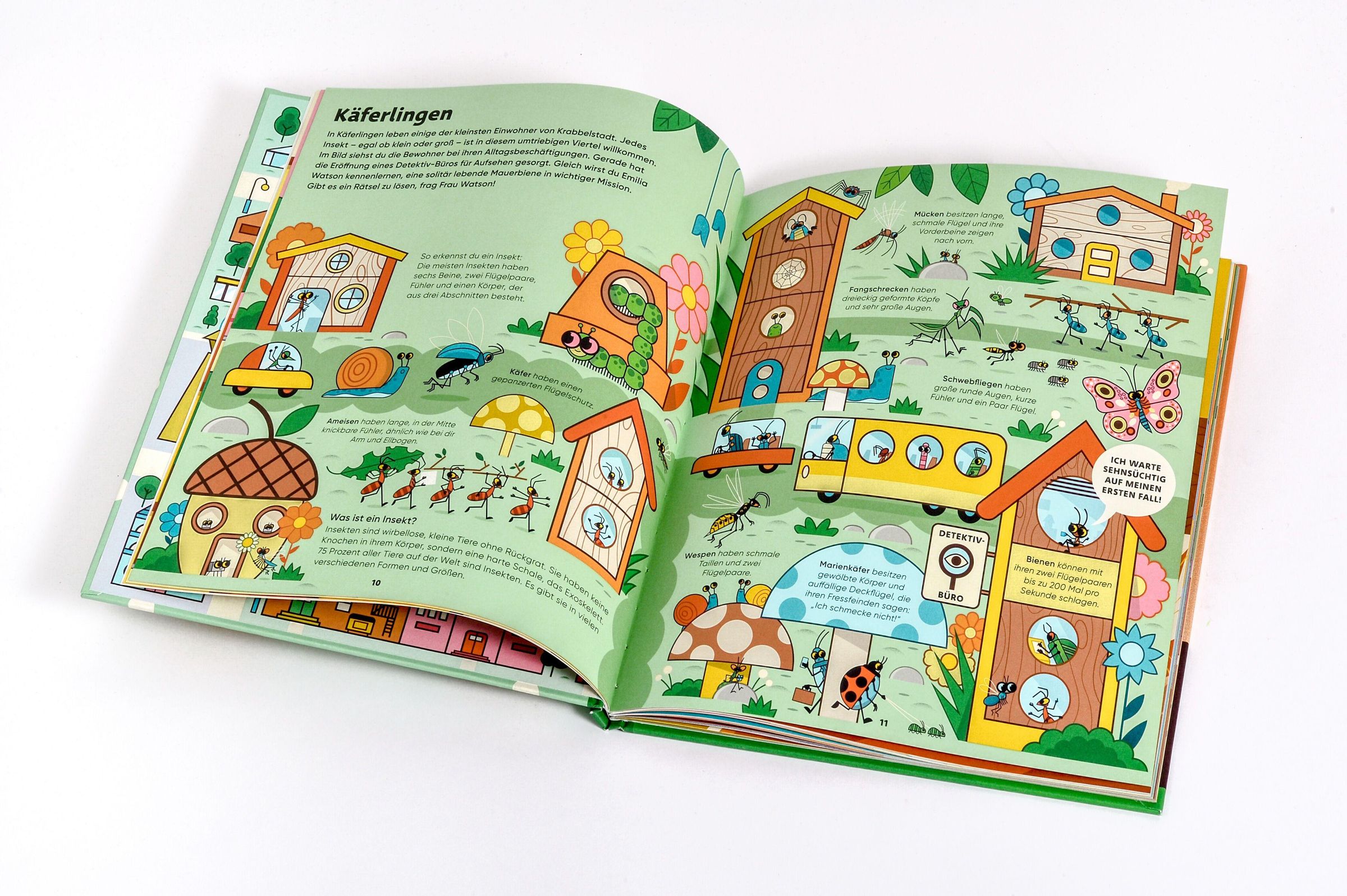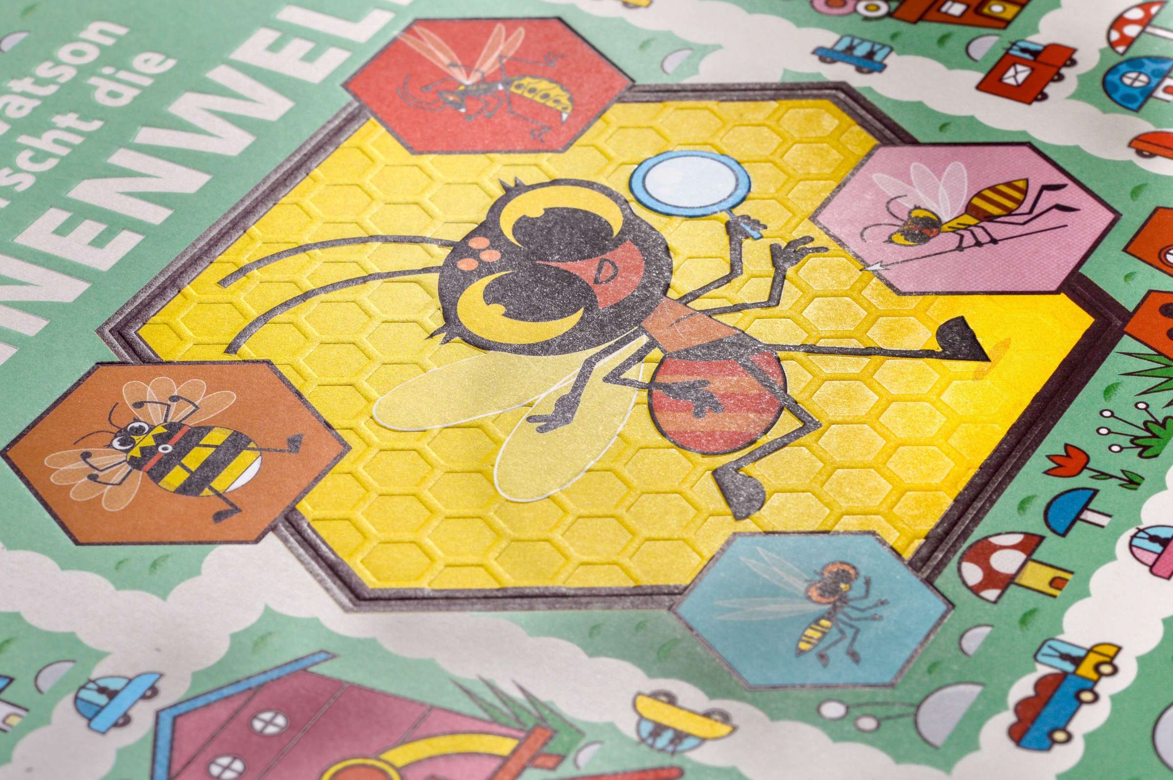 "Emilia Watson erforscht die BIENENWELT" steht in der Mitte. Eine bunte Illustration mit Bienen und kleinen Häusern., Buch