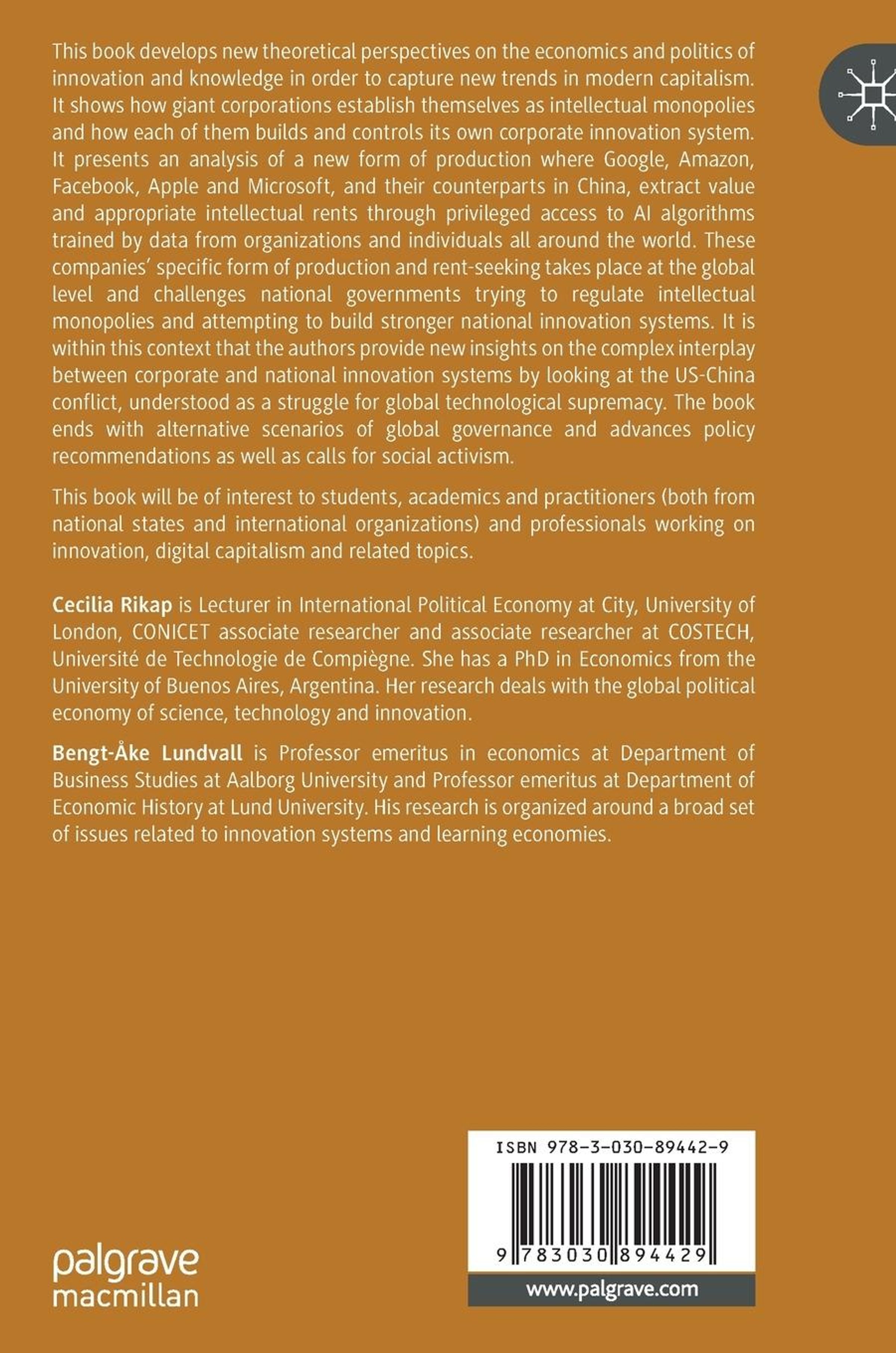 This book develops new theoretical perspectives on the economics and politics of innovation and knowledge in order to capture new trends in modern capitalism. It shows how giant corporations establish themselves as intellectual monopolies and how each of them builds and controls its own corporate innovation system. It presents an analysis of a new form of production where Google, Amazon, Facebook, Apple and Microsoft, and their counterparts in China, extract value and appropriate intellectual rents through privileged access to AI algorithms trained by data from organizations and individuals all around the world.