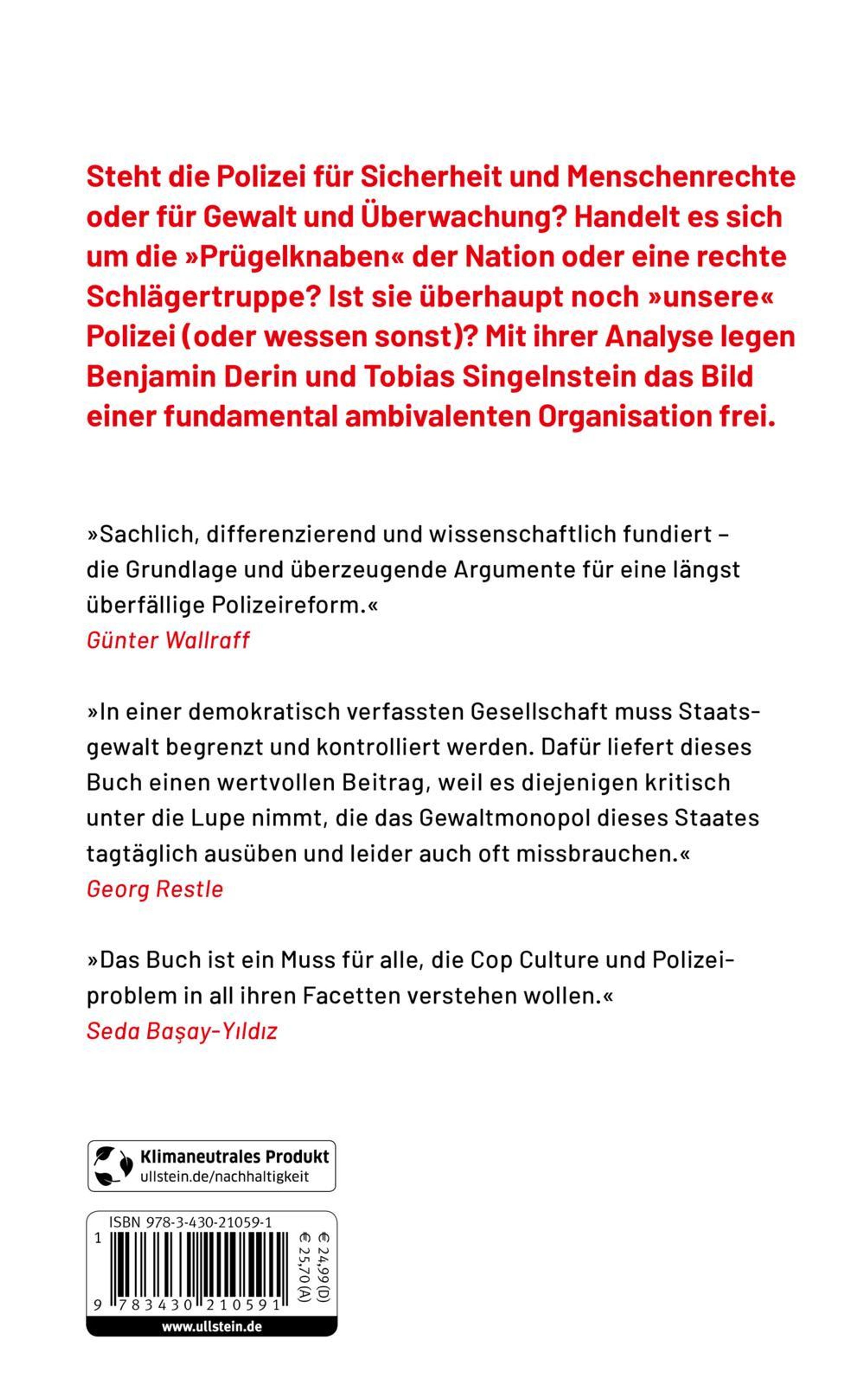 Steht die Polizei für Sicherheit und Menschenrechte oder für Gewalt und Überwachung? Handelt es sich um die 'Prügelknaben' der Nation oder eine rechte Schlägertruppe? Ist sie überhaupt noch 'unsere' Polizei (oder wessen sonst)? Mit ihrer Analyse legen Benjamin Derin und Tobias Singelnstein das Bild einer fundamental ambivalenten Organisation frei. 'Sachlich, differenzierend und wissenschaftlich fundiert - die Grundlage und überzeugende Argumente für eine längst überfällige Polizeireform.'