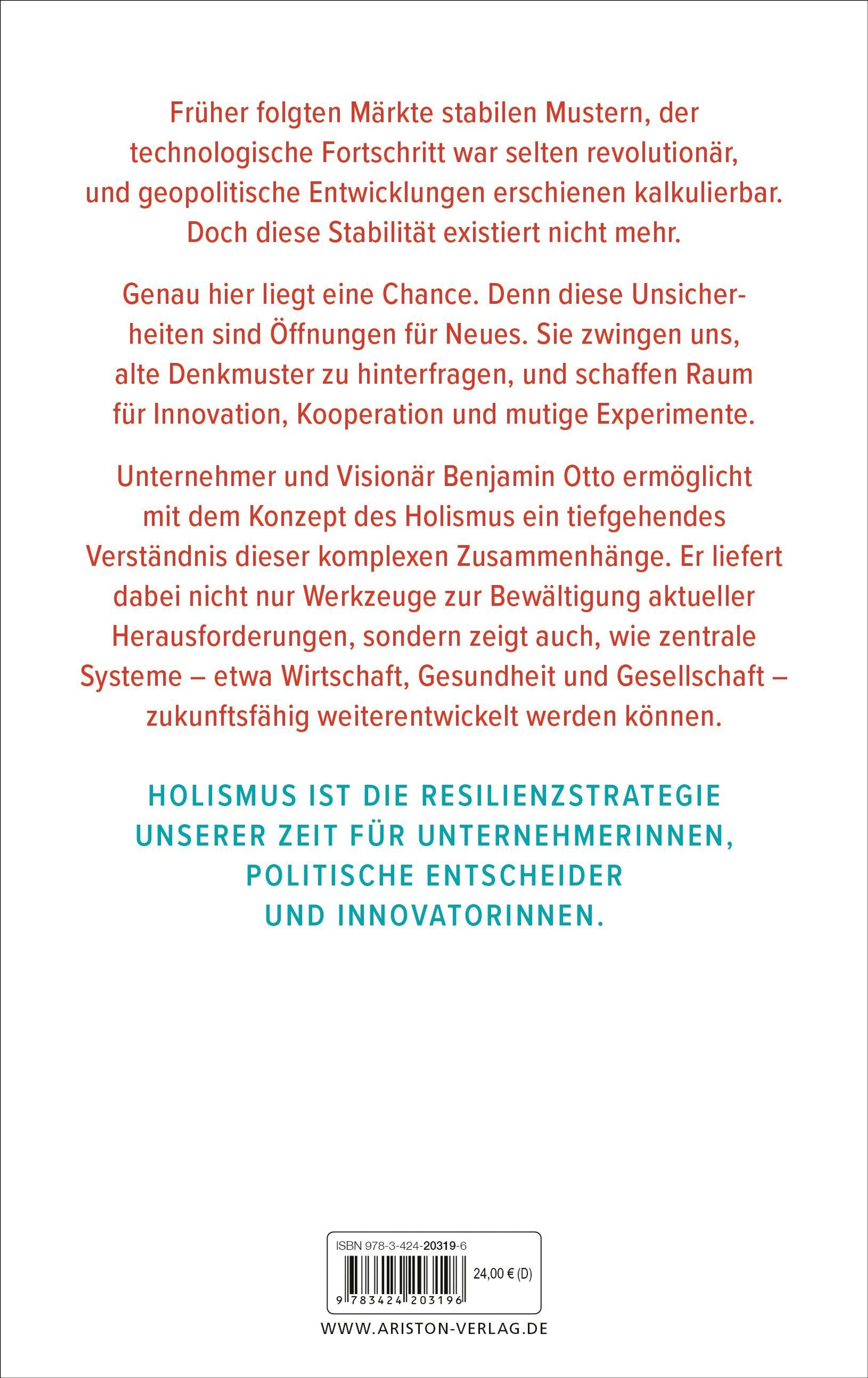 Holismus ist die Zukunftsvision von Benjamin Otto, dem gestaltenden Gesellschafter der Otto Group. Mit der Übergabe vom Vater auf den Sohn im März 2026 übernimmt er die Aufgabe, die internationale Handels- und Dienstleistungsgruppe in eine gute Zukunft zu führen. Dafür wählt er einen ganzheitlichen Weg. Benjamin Otto setzt darauf, Verantwortung zu teilen sowie die Stärken des Einzelnen und die Intelligenz der Vielen zu nutzen. Und das nicht nur im Unternehmenskontext, sondern gesamtgesellschaftlich und global. Er erläutert, welche Rahmenbedingungen es braucht, um holistische Systeme wachsen zu lassen. Systeme, die aufgrund ihrer Ganzheitlichkeit anderen klar überlegen sind. Ein Must Read für Menschen, die sich persönlich und unternehmerisch weiterentwickeln möchten und die nicht kapitulieren vor den scheinbar unlösbaren Herausforderungen unserer Zeit.