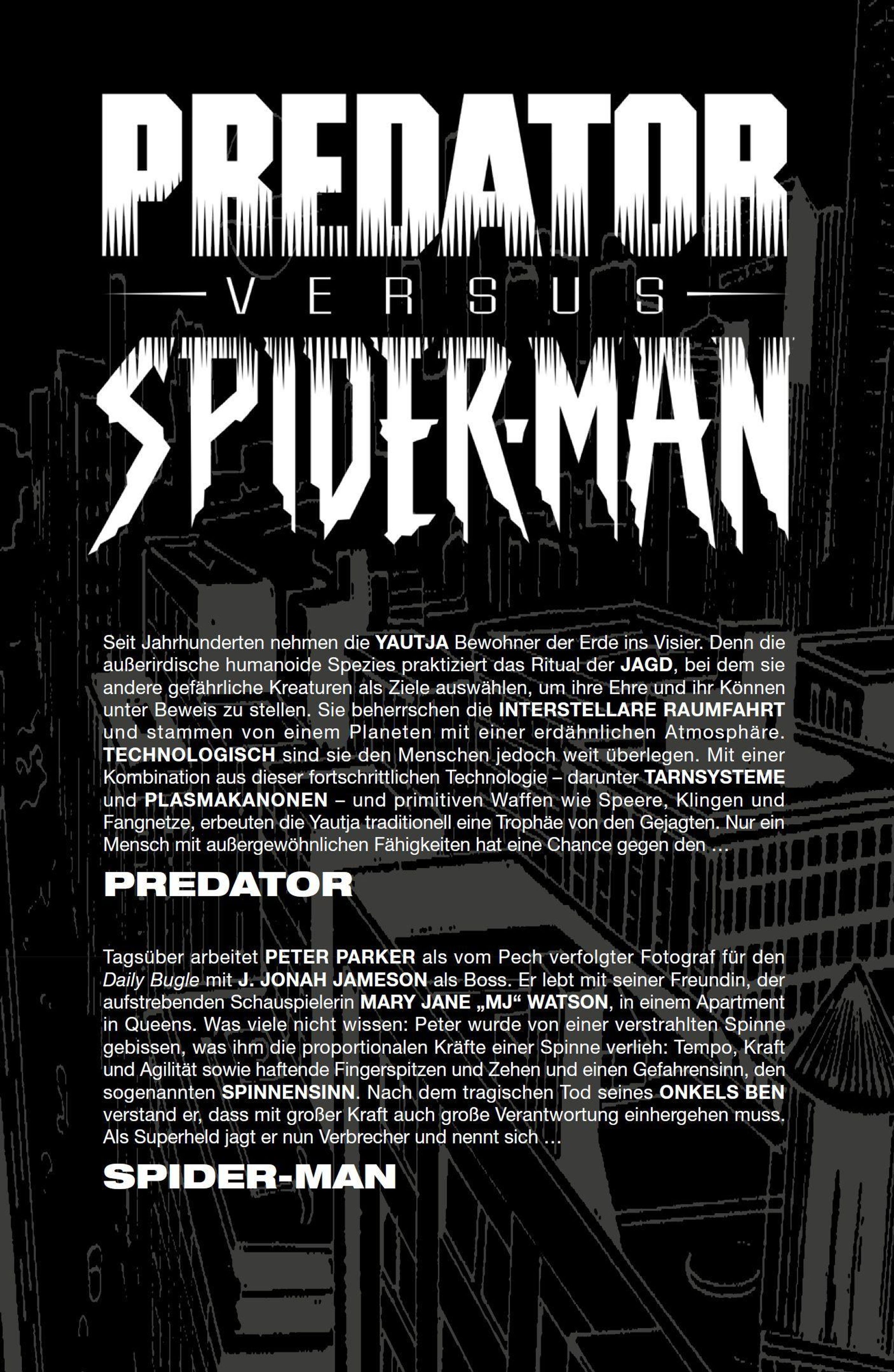 JÄGER IN DER DUNKELHEIT Eine ungewöhnliche Hitzewelle erfasst New York und löst einen massiven Stromausfall aus. Spider-Man tut alles, was er kann, um zu helfen, während die Stadt in völliger Dunkelheit versinkt. Was Peter Parker jedoch nicht weiß: In diesen sengenden Schatten lauert etwas, das nicht von dieser Welt ist - etwas, das ihn als Ziel für ein Ritual ausgewählt hat, das seine Spezies seit Anbeginn der Zeit durchführt. Ein Yautja ohne Regeln und ohne Ehrenkodex streift durch die Stadt, und dieses Mal ist sein Ziel Spider-Man! So beginnt eine Jagd zwischen den Wolkenkratzern des Big Apple. Aber Spidey und der Predator sind nicht die Einzigen, die an diesem tödlichen Spiel teilnehmen - ein weiterer Jäger hat sich gerade in den Kampf eingemischt ...