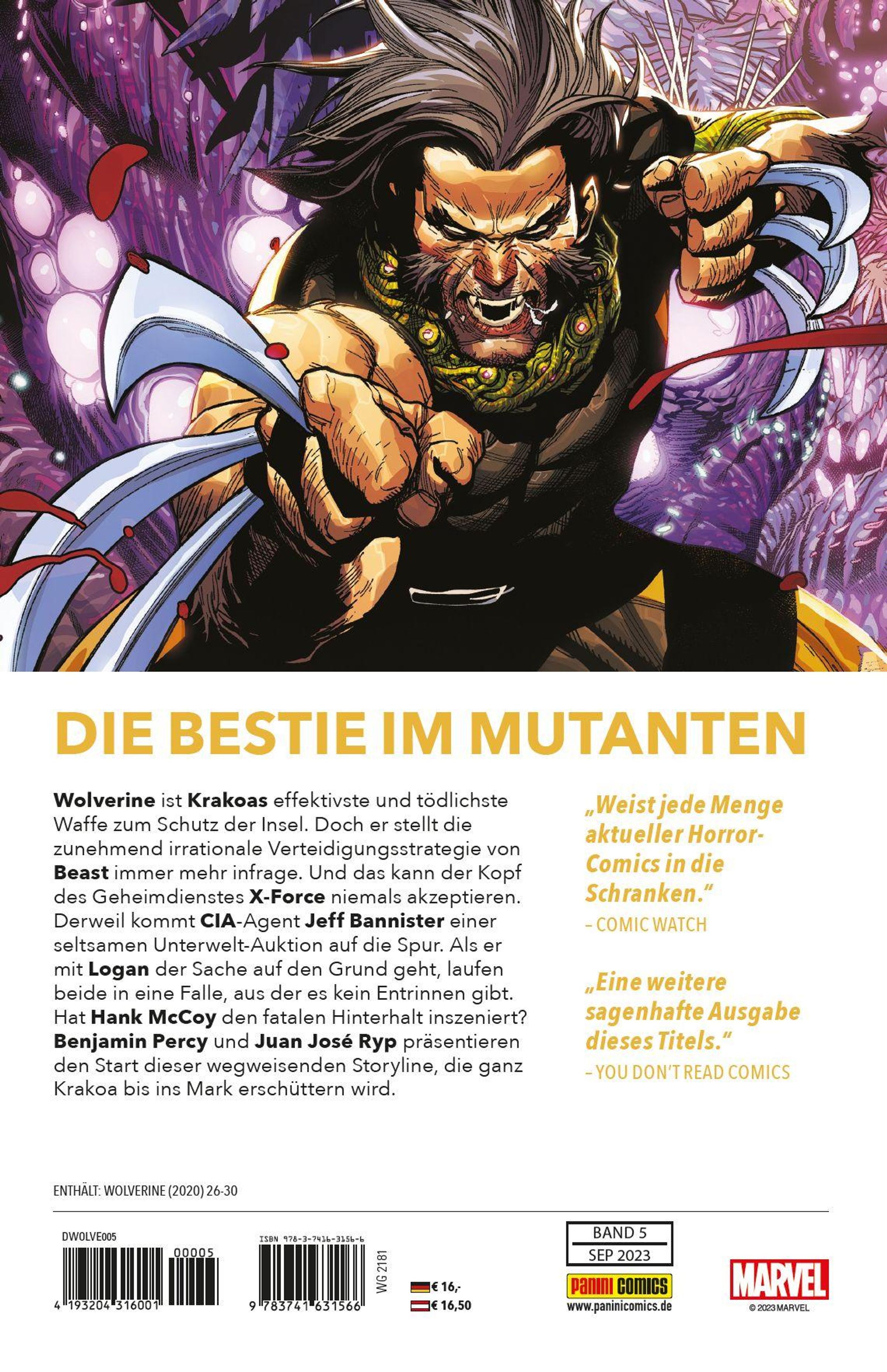 DIE BESTIE IM MUTANTEN Wolverine ist Krakoas effektivste und tödlichste Waffe zum Schutz der Insel. Doch er stellt die zunehmend irrationale Verteidigungsstrategie von Beast immer mehr infrage. Und das kann der Kopf des Geheimdienstes X-Force niemals akzeptieren. Derweil kommt CIA-Agent Jeff Bannister einer seltsamen Unterwelt-Auktion auf die Spur. Als er mit Logan der Sache auf den Grund geht, laufen beide in eine Falle, aus der es kein Entrinnen gibt. Hat Hank McCoy den fatalen Hinterhalt inszeniert? Benjamin Percy und Juan José Ryp präsentieren den Start dieser wegweisenden Storyline, die ganz Krakoa bis ins Mark erschüttern wird.
