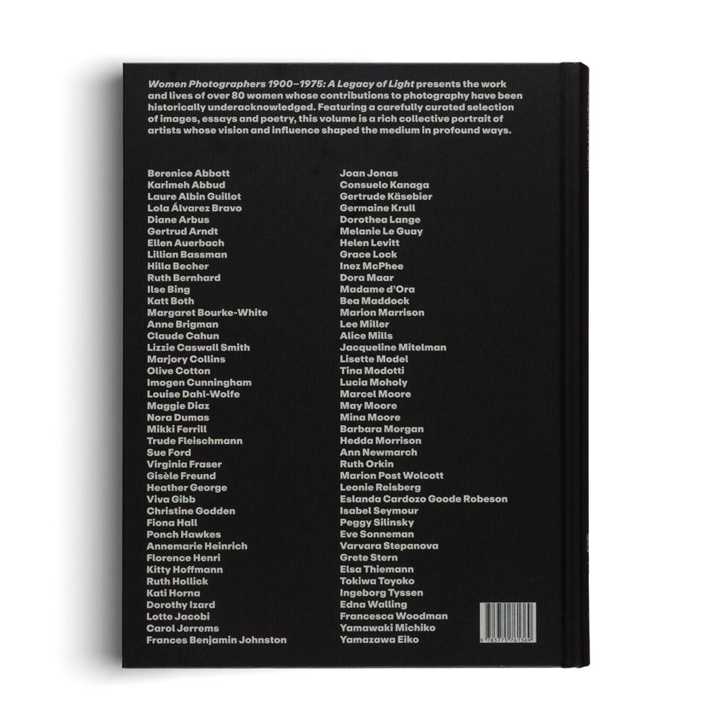Women Photographers 1900-1975: A Legacy of Light presents the work and lives of over 80 women whose contributions to photography have been historically underacknowledged. Featuring a carefully curated selection of images, essays and poetry, this volume is a rich collective portrait of artists whose vision and influence shaped the medium in profound ways. With images by: Berenice Abbott, Karimeh Abbud, Laure Albin Guillot, Lola Álvarez Bravo, Diane Arbus, Gertrud Arndt, Ellen Auerbach, Lillian Bassman, Hilla Becher, Ruth Bernhard, Ilse Bing, Katt Both, Margaret Bourke-White, Anne Brigman, Claude Cahun, Lizzie Caswall Smith, Marjory Collins, Olive Cotton, Imogen Cunningham, Louise Dahl-Wolfe, Maggie Diaz, Nora Dumas, Mikki Ferrill, Trude Fleischmann, Sue Ford, Virginia Fraser, Gisèle Freund, Heather George, Viva Gibb, Christine Godden, Fiona Hall, Ponch Hawkes, Annemarie Heinrich, Florence Henri, Kitty Hoffmann, Ruth Hollick, Kati Horna, Dorothy Izard, Lotte Jacobi, Carol Jerrems, Frances Benjamin Johnston, Joan Jonas, Consuelo Kanaga, Gertrude Käsebier, Germaine Krull, Dorothea Lange, Melanie Le Guay, Helen Levitt, Grace Lock, Inez McPhee, Dora Maar, Madame d'Ora, Bea Maddock, Marion Marrison, Lee Miller, Alice Mills, Jacqueline Mitelman, Lisette Model, Tina Modotti, Lucia Moholy, Marcel Moore, May Moore, Mina Moore, Barbara Morgan, Hedda Morrison, Ann Newmarch, Ruth Orkin, Marion Post Wolcott, Leonie Reisberg, Eslanda Cardozo Goode Robeson, Isabel Seymour, Peggy Silinsky, Eve Sonneman, Varvara Stepanova, Grete Stern, Elsa Thiemann, Tokiwa Toyoko, Ingeborg Tyssen, Edna Walling, Francesca Woodman, Yamawaki Michiko, Yamazawa Eiko