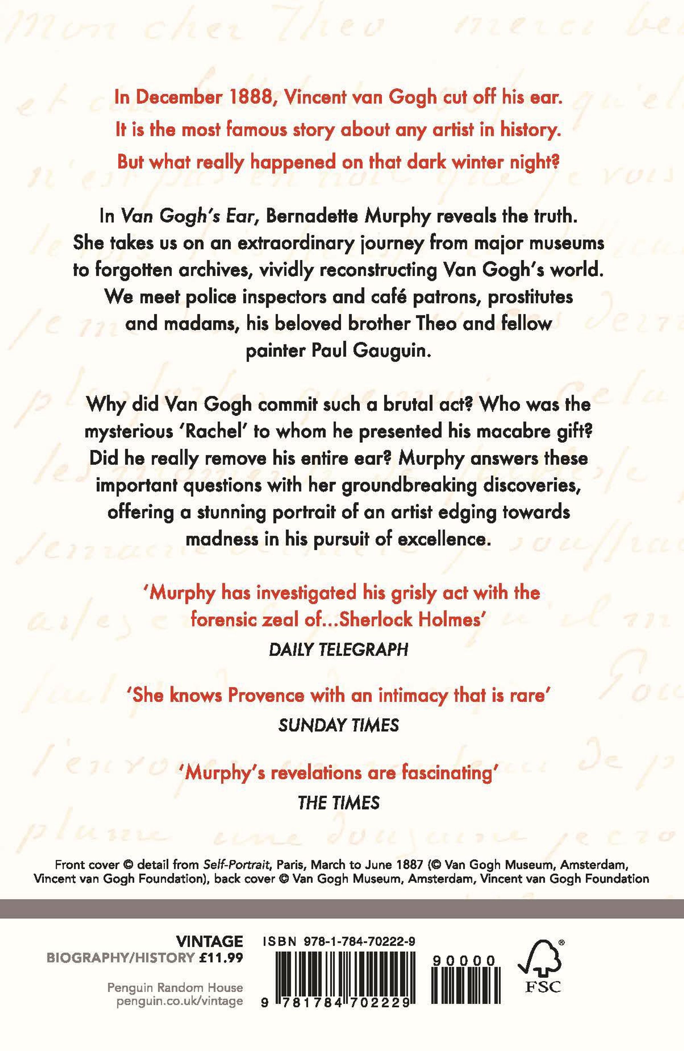 In Van Gogh's Ear , Bernadette Murphy reveals the truth. She takes us on an extraordinary journey from major museums to forgotten archives, vividly reconstructing Van Gogh's world. We meet police inspectors and café patrons, prostitutes and madams, his beloved brother Theo and fellow painter Paul Gauguin.