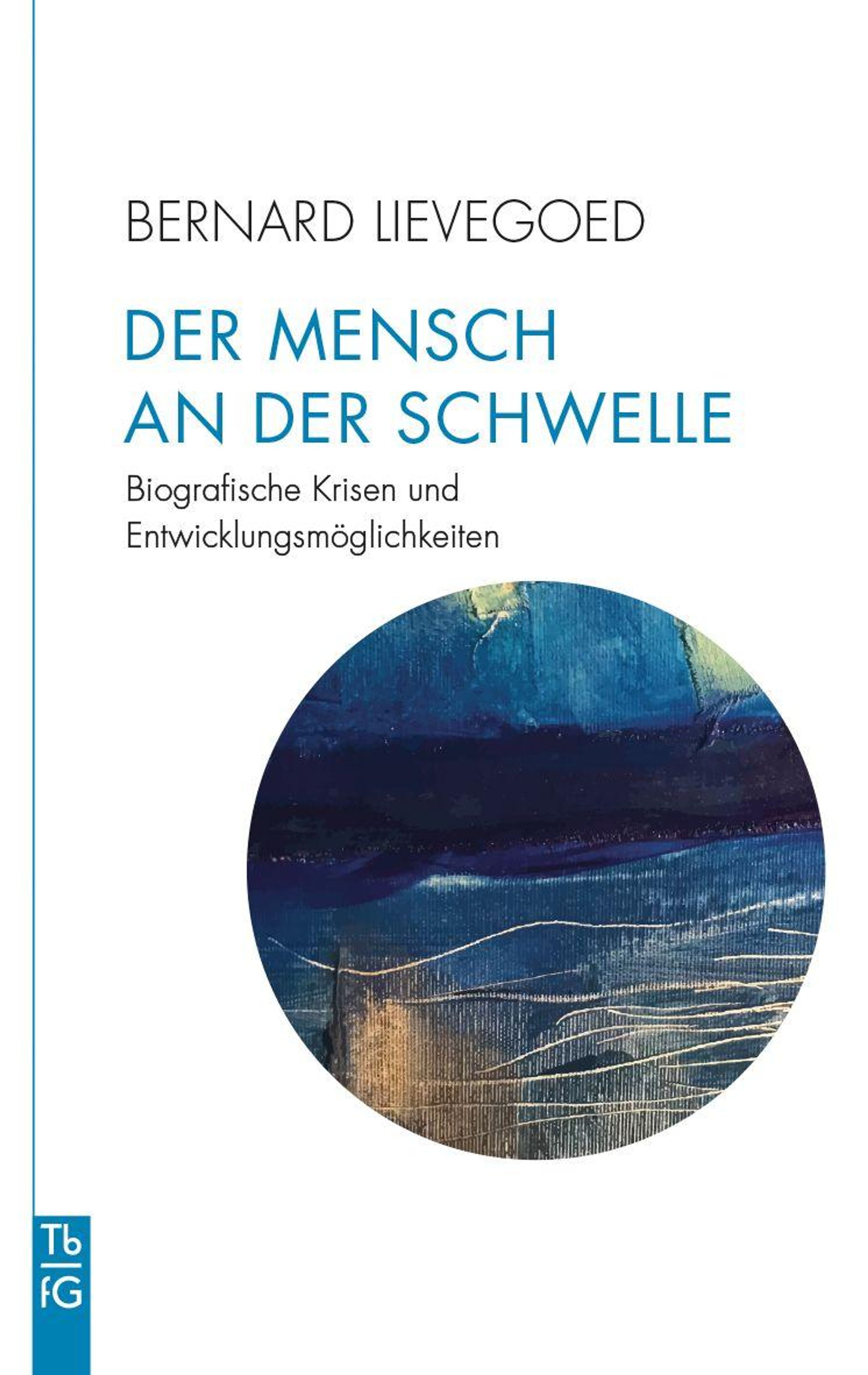 "DER MENSCH AN DER SCHWELLE. Biografische Krisen und Entwicklungsmöglichkeiten." Abstrakte, blaue Illustration darunter., Buch