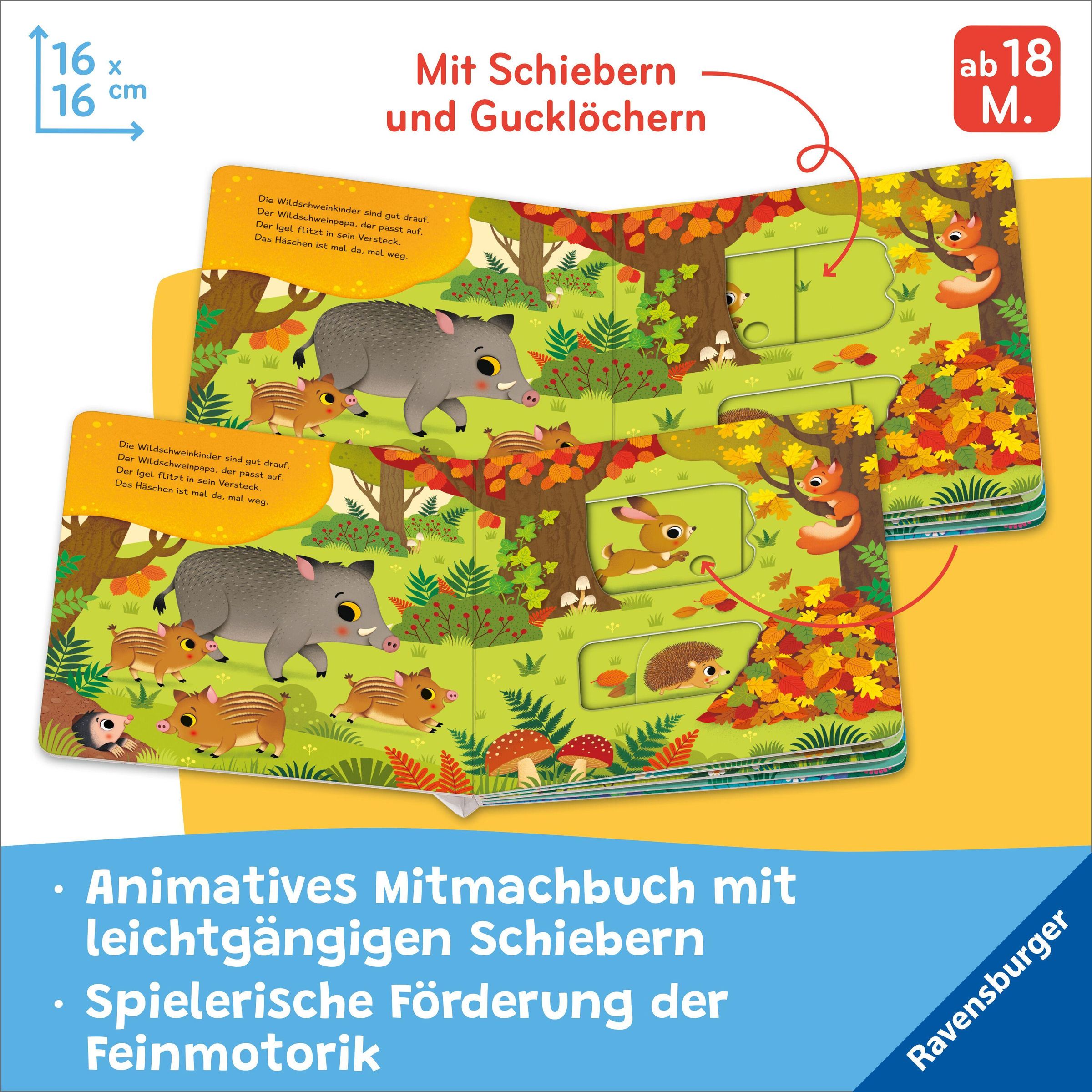 Der Specht pickt nach Insekten. Das Häschen hoppelt aus seinem Versteck und die Eule fliegt von Baum zu Baum. Auf jeder Seite gibt es ein großes Schiebe-Element, durch das die Tiere lebendig werden. Mach mit und hilf dem Biber, ins Wasser zu hüpfen oder verstecke den Igel im Blätterhaufen. Der gereimte Text animiert zum Spielen mit den Schiebern. Die farbenfrohen Illustrationen zeigen spannende Szenen, in denen es viel zu entdecken gibt.