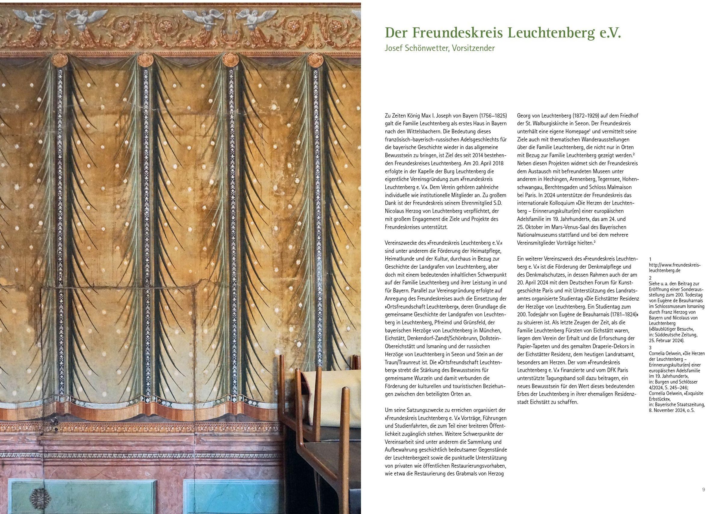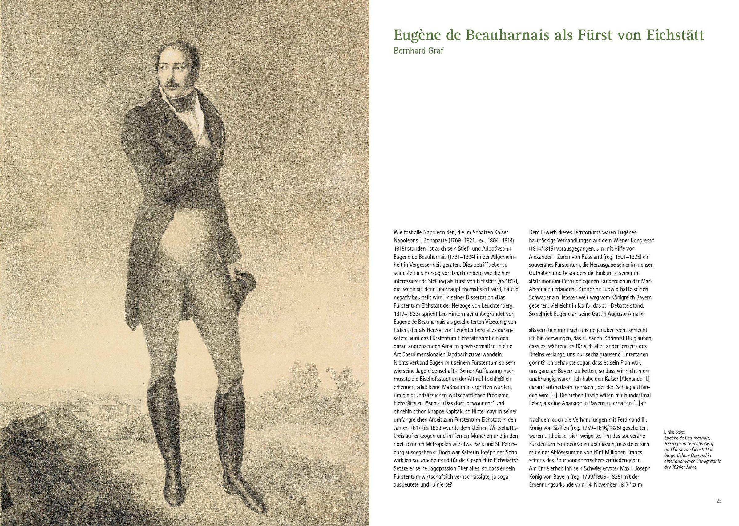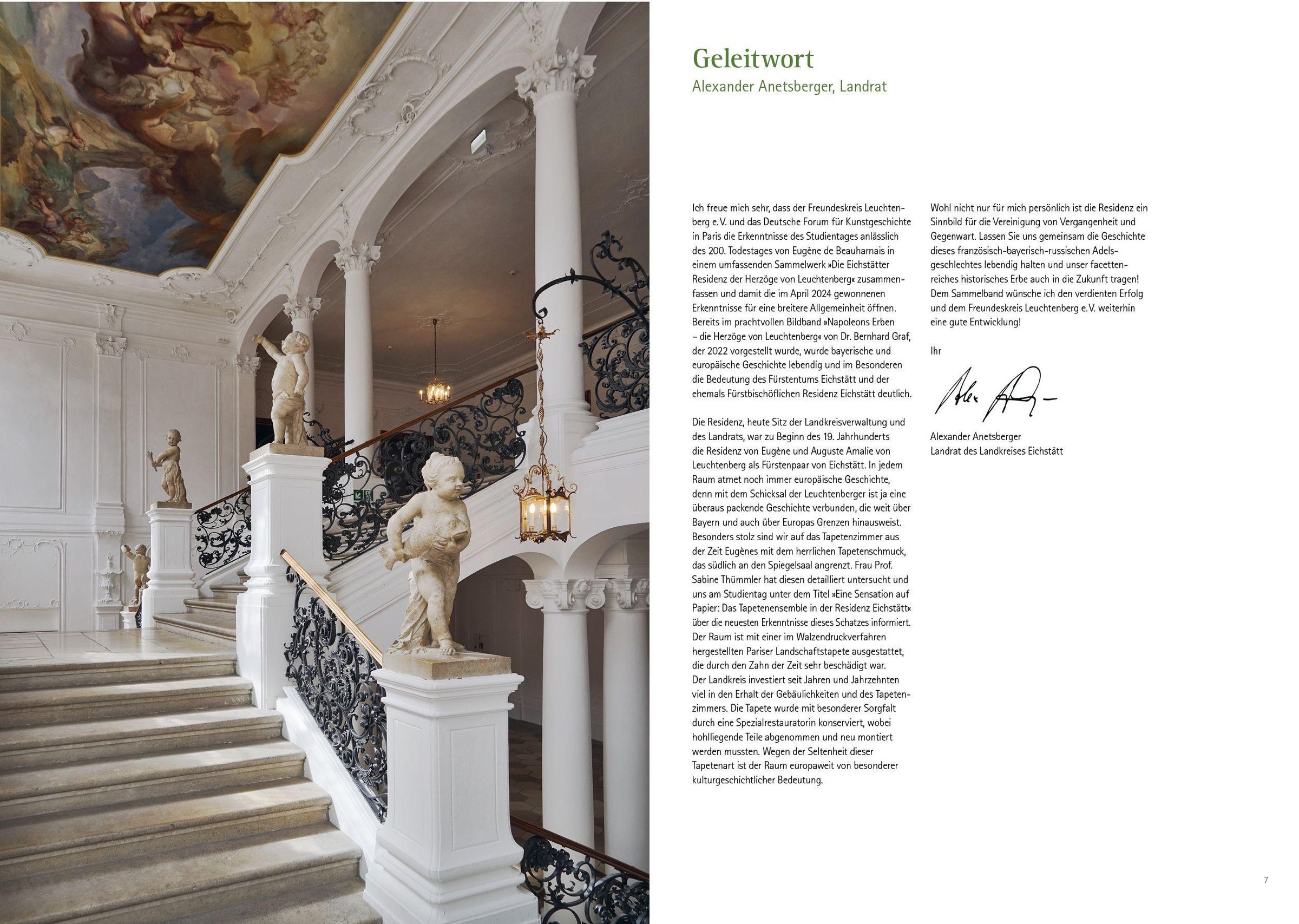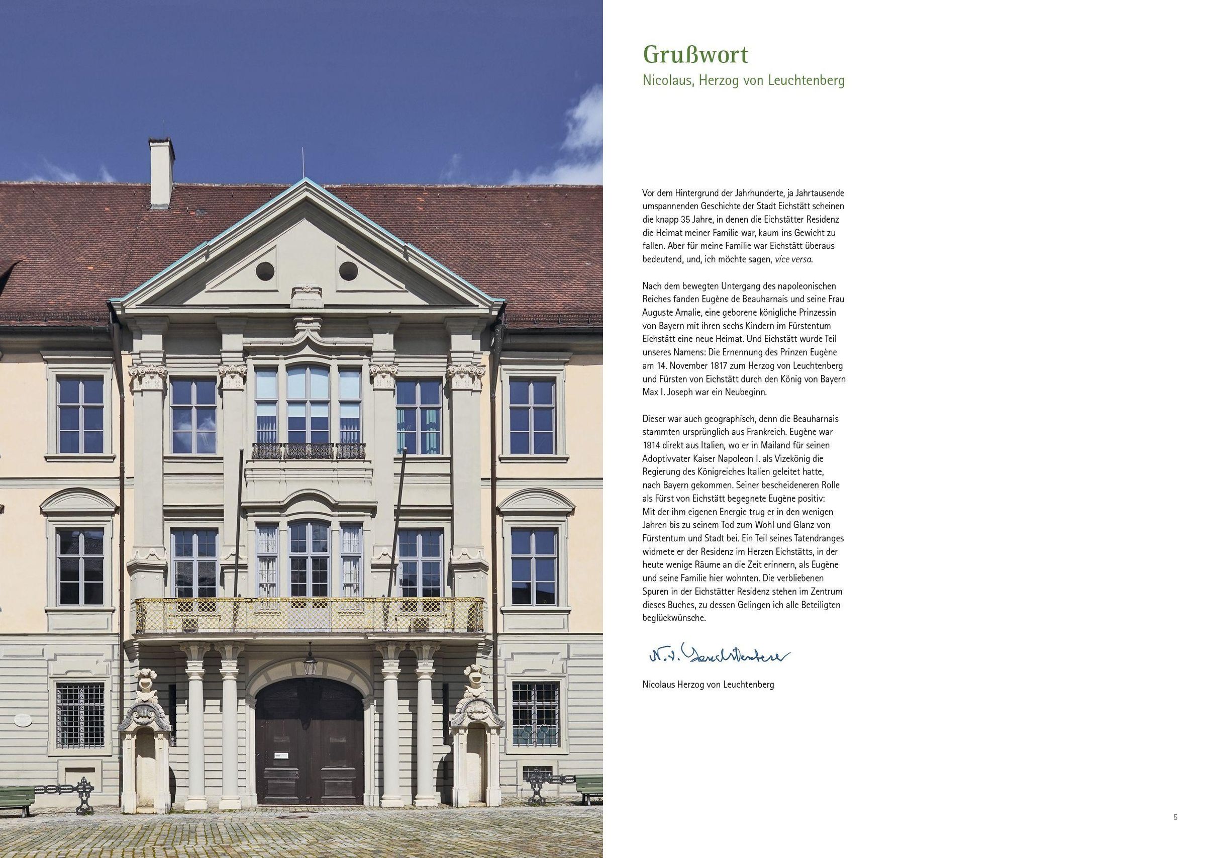 Raumausstattungen von europäischem Rang Die ehemalige fürstbischöfliche Residenz - heute Sitz der Landkreisverwaltung und des Landrats - war zu Beginn des 19. Jahrhunderts die Residenz von Eugène und Auguste Amalie von Leuchtenberg in ihrem Fürstentum Eichstätt. Noch heute zeugen kostbare Pariser Tapeten von der Pracht und dem Raffinement der von Eugène de Beauharnais hier geschaffenen Einrichtung. Als Herzog von Leuchtenberg züchtete der Adoptivsohn Napoleons und ehemalige Vizekönig von Italien im Hofgarten Ananas und richtete in der Sommerresidenz ein Naturalienkabinett ein, das seine Söhne und Nachfolger August und Maximilian zu weltweitem Ruhm führten. Die bayerischen Könige kamen in dieser Zeit -ebenso nach Eichstätt wie der schwedische Kronprinz Oscar, der hier seine spätere Frau und Königin kennenlernte.