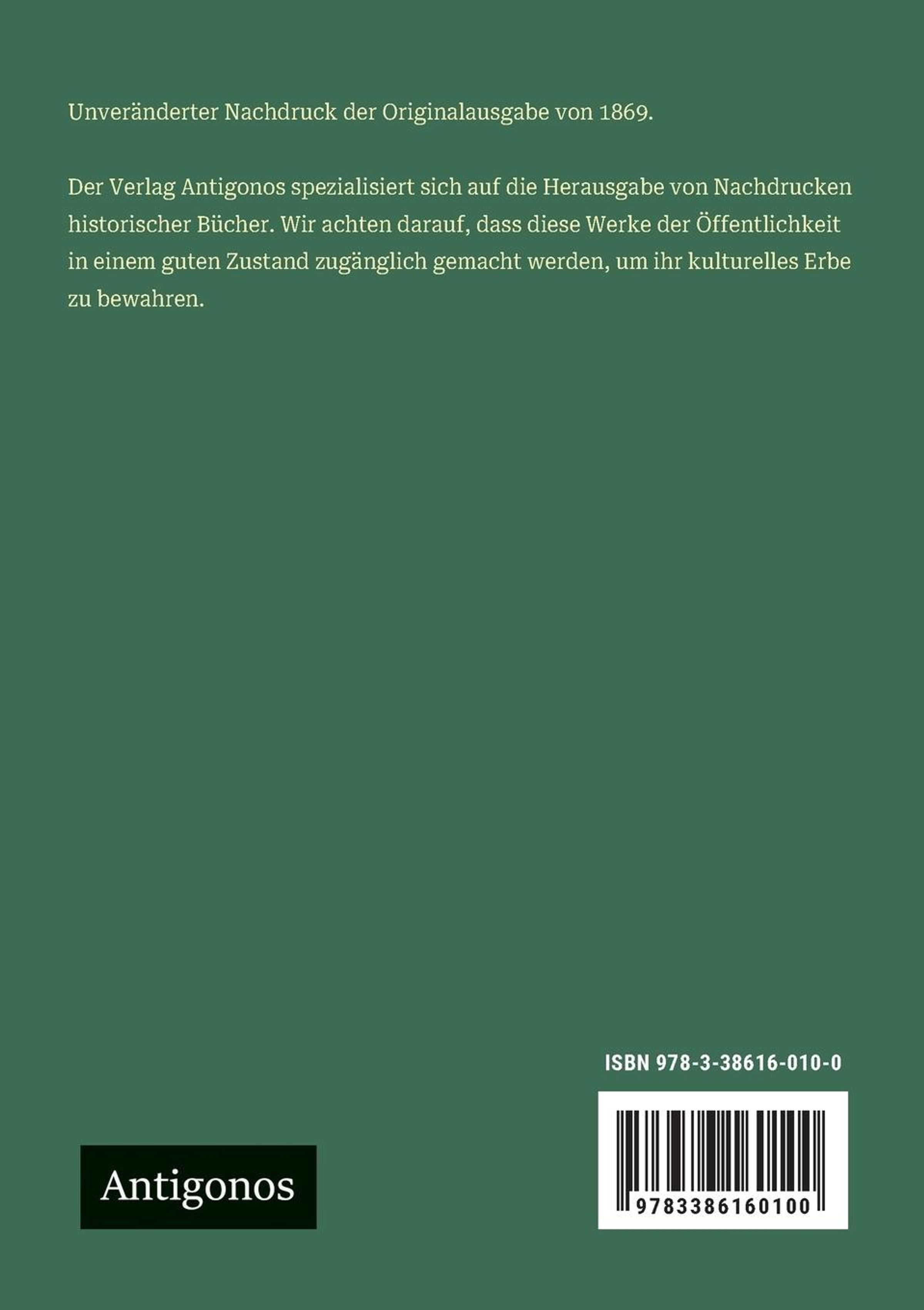 Unveränderter Nachdruck der Originalausgabe von 1869. Der Verlag Antigonos spezialisiert sich auf die Herausgabe von Nachdrucken historischer Bücher. Wir achten darauf, dass diese Werke der Öffentlichkeit in einem guten Zustand zugänglich gemacht werden, um ihr kulturelles Erbe zu bewahren.