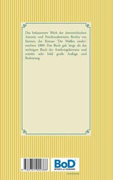 Das bekannteste Werk der österreichischen Autorin und Friedensaktivistin Bertha von Suttner, der Roman "Die Waffen nieder", erschien 1889. Das Buch galt lange als das wichtigste Buch der Antikriegsliteratur und erzielte sehr bald große Auflage und Bedeutung.