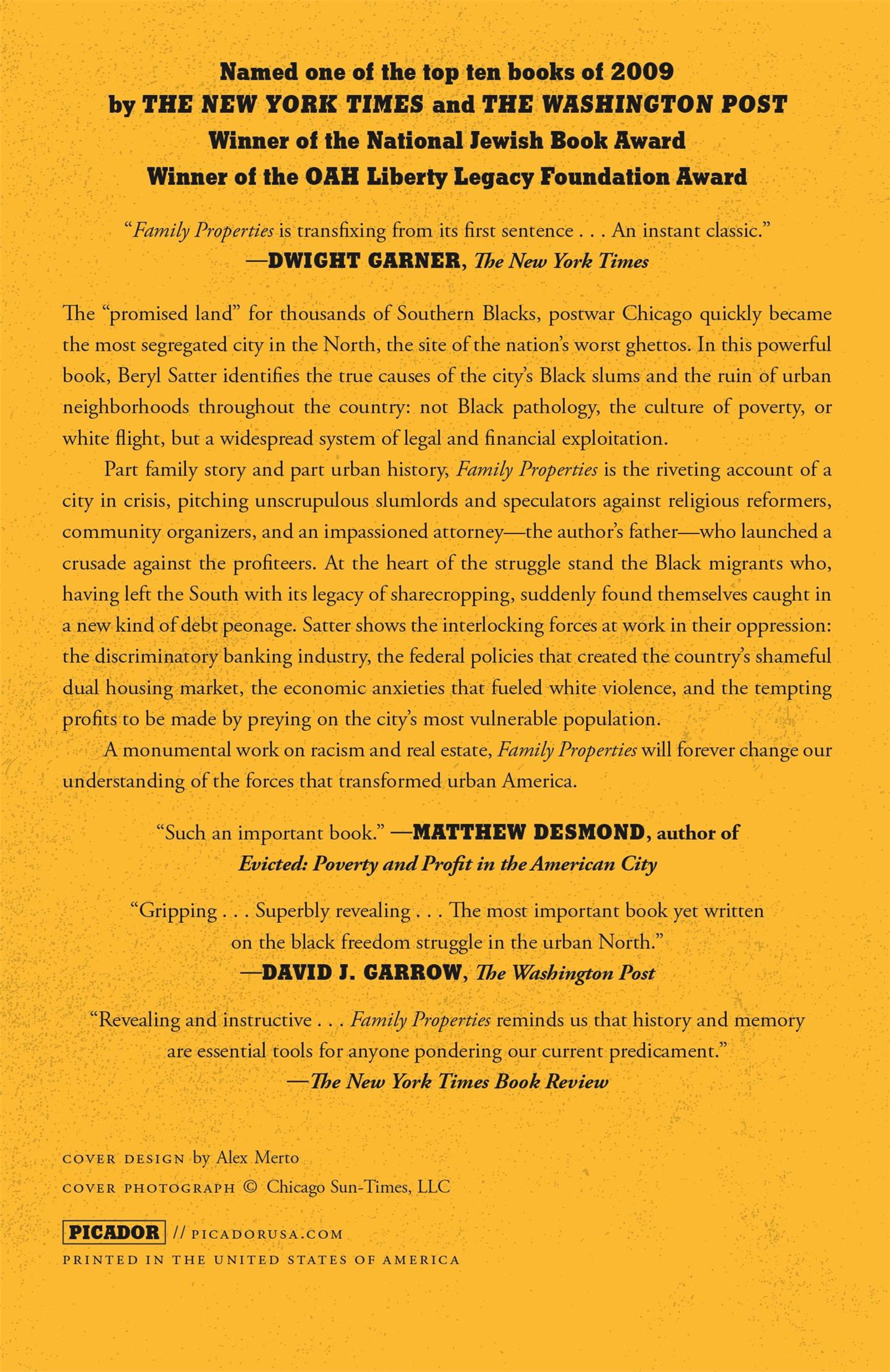 "Beryl Satter's Family Properties is really an incredible book. It is, by far, the best book I've ever read on the relationship between blacks and Jews. That's because it hones in on the relationship between one specific black community and one specific Jewish community and thus revels in the particular humanity of all its actors." -Ta-Nehisi Coates, The Atlantic