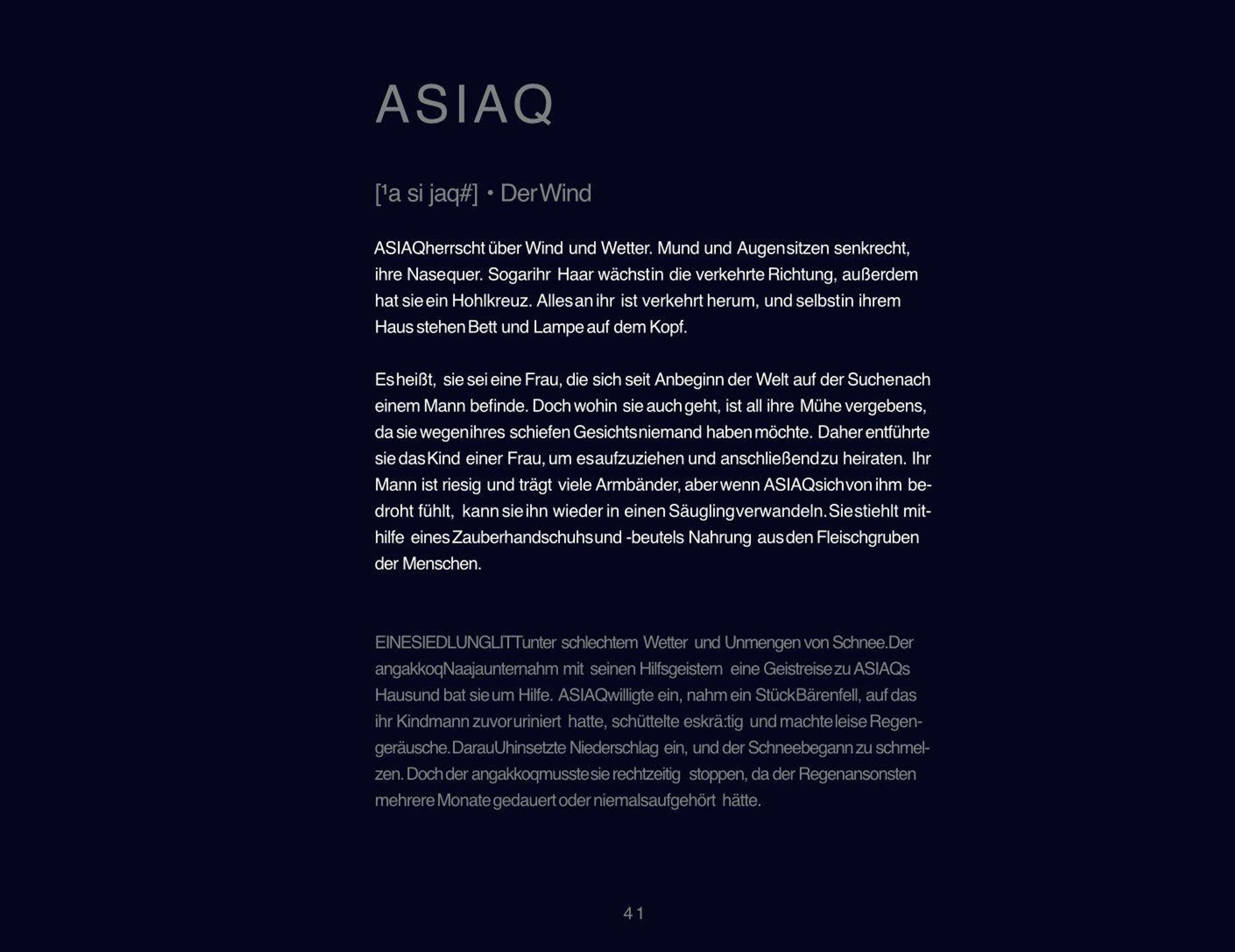Eine kurze Geschichte Grönlands und der Schamanentradition führt in die alte Welt ein und zeigt, wie Mythen und Legenden, die von Generation zu Generation weitergegeben wurden, einen Ort formen können, der dunkel und düster war, aber auch schelmisch und lebendig und voller Naturwunder. Das Bestiarium sammelt und bewahrt traditionelles Wissen einer mündlichen Erzähltradition und sorgt zugleich für Impulse zu seiner Neuinterpretation.