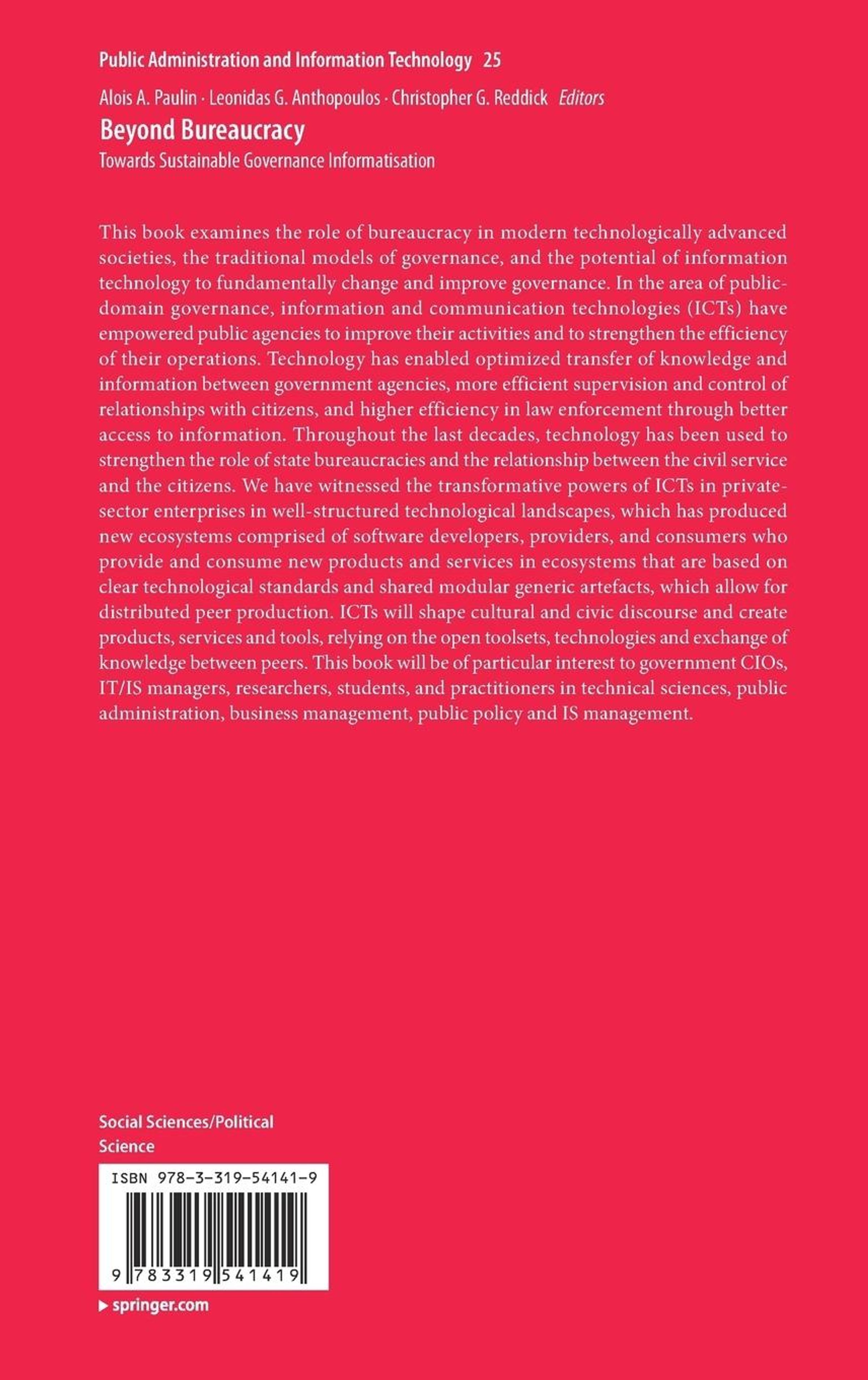 This book examines the role of bureaucracy in modern technologically advanced societies, the traditional models of governance, and the potential of information technology to fundamentally change and improve governance. In the area of public-domain governance, information and communication technologies (ICTs) have empowered public agencies to improve their activities and to strengthen the efficiency of their operations. Technology has enabled optimized transfer of knowledge and information between government agencies, more efficient supervision and control of relationships with citizens, and higher efficiency in law enforcement through better access to information. Throughout the last decades, technology has been used to strengthen the role of state bureaucracies and the relationship between the civil service and the citizens. We have witnessed the transformative powers of ICTs in private-sector enterprises in well-structured technological landscapes, which has produced new ecosystems comprised of software developers, providers, and consumers who provide and consume new products and services in ecosystems that are based on clear technological standards and shared modular generic artefacts, which allow for distributed peer production. ICTs will shape cultural and civic discourse and create products, services and tools, relying on the open toolsets, technologies and exchange of knowledge between peers. This book will be of particular interest to government CIOs, IT/IS managers, researchers, students, and practitioners in technical sciences, public administration, business management, public policy and IS management.