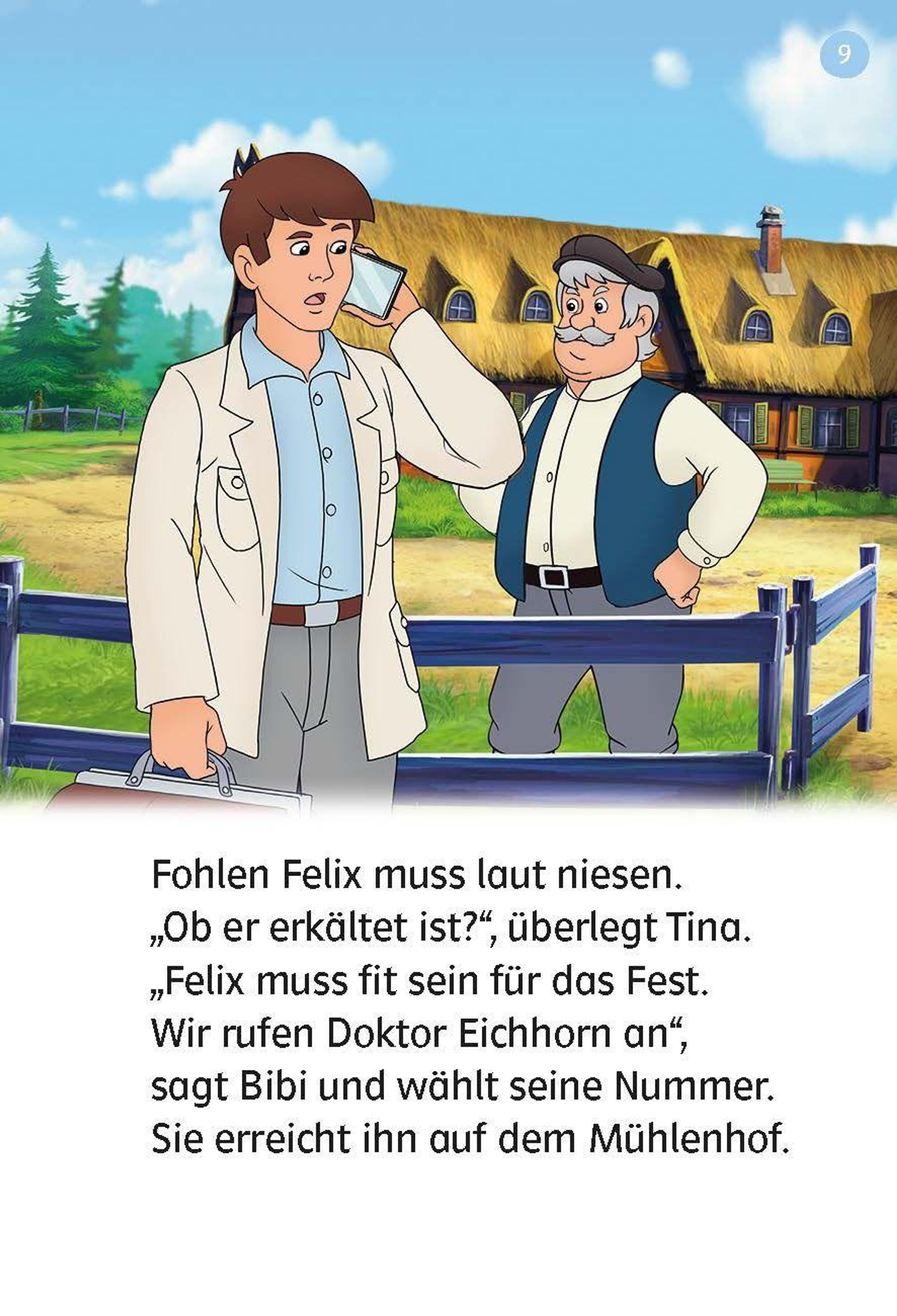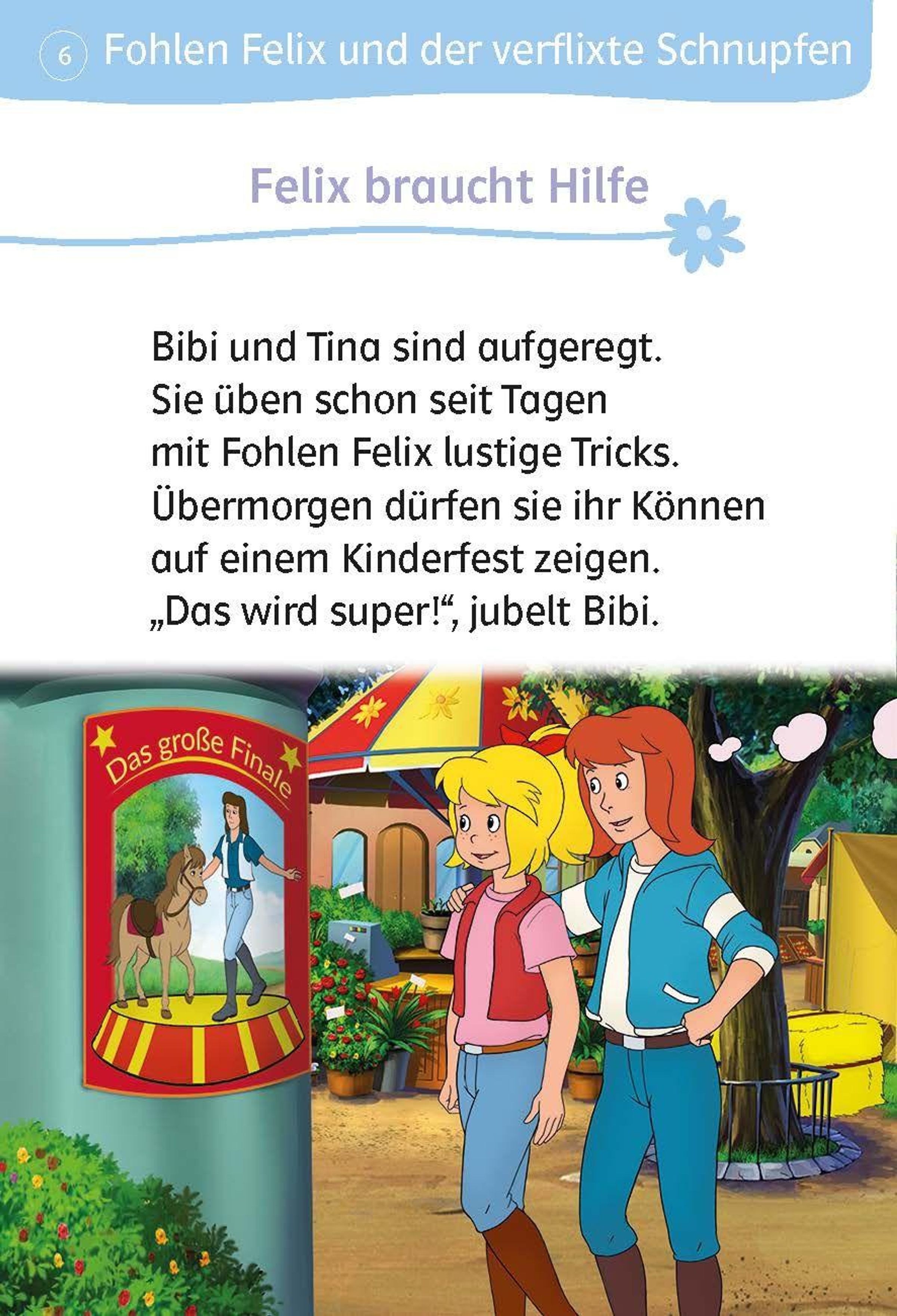 Bibi und Tina wollen mit Fohlen Felix auf einem Kinderfest auftreten. Sie üben schon seit Tagen lustige Tricks. Doch plötzlich bekommt der kleine Felix einen verflixten Schnupfen. Kann Tierarzt Doktor Eichhorn ihm helfen? Und was wird aus dem Auftritt?