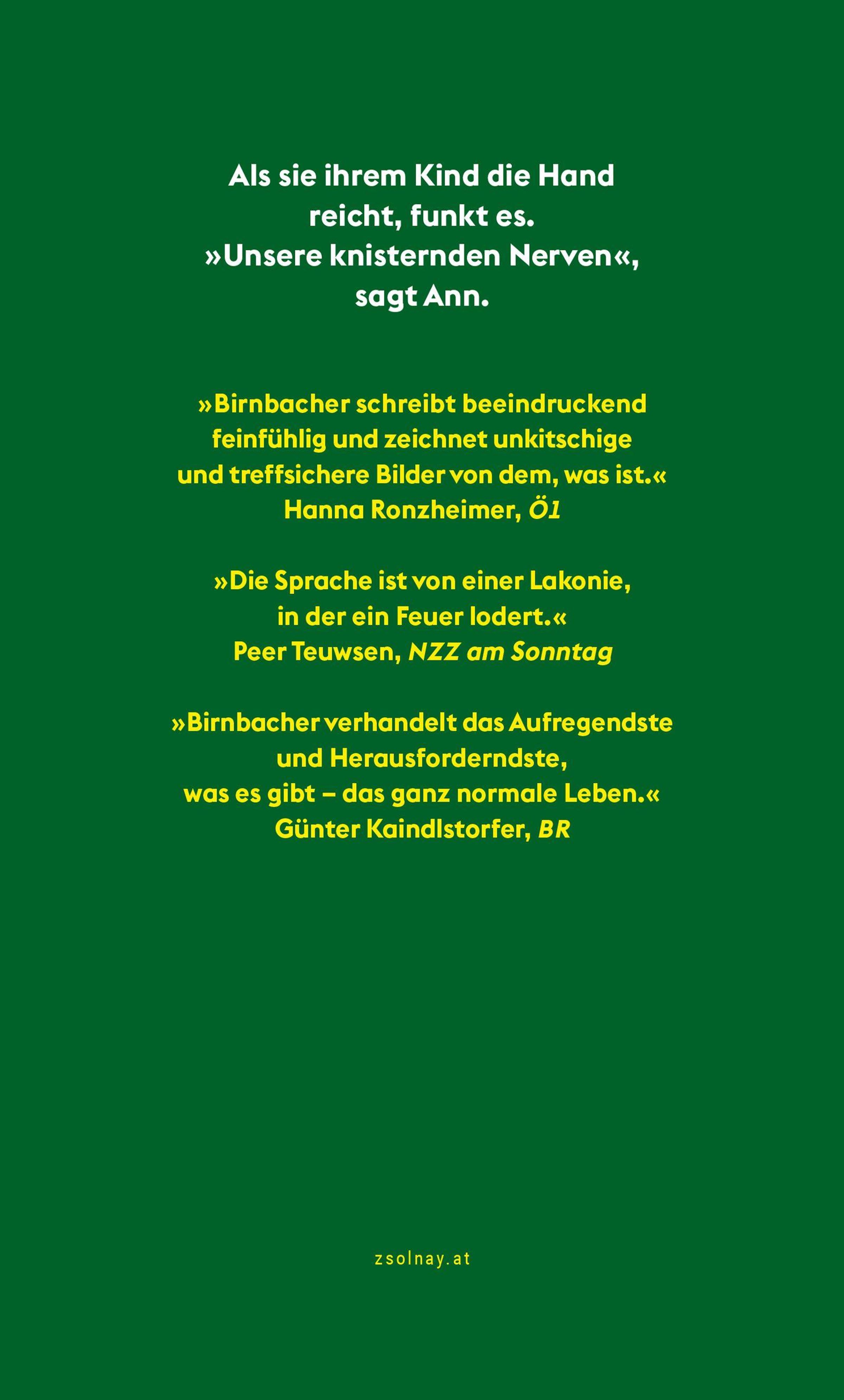 'Birgit Birnbacher beherrscht sie noch, diese älteste und edelste Kunst: das lebendige Erzählen als seelenrettende Maßnahme.' Clemens J. Setz