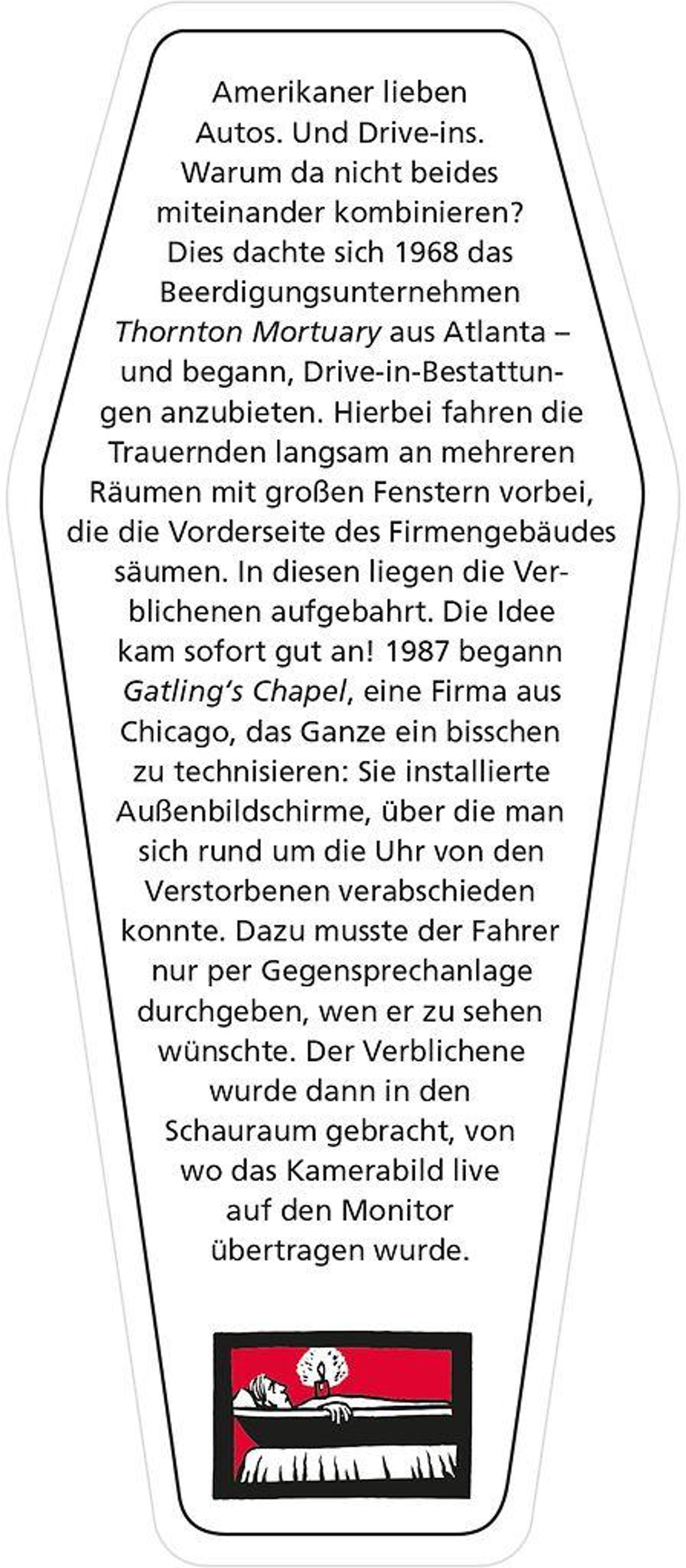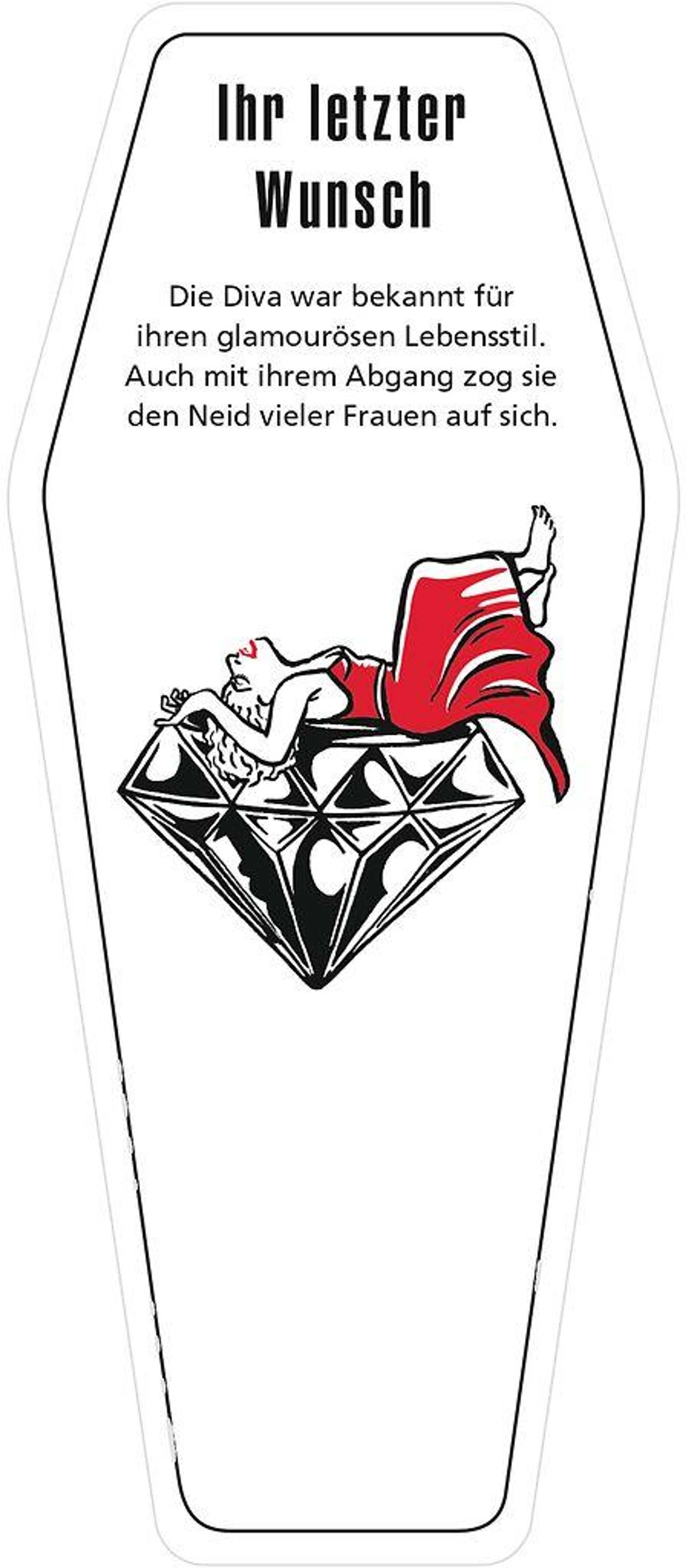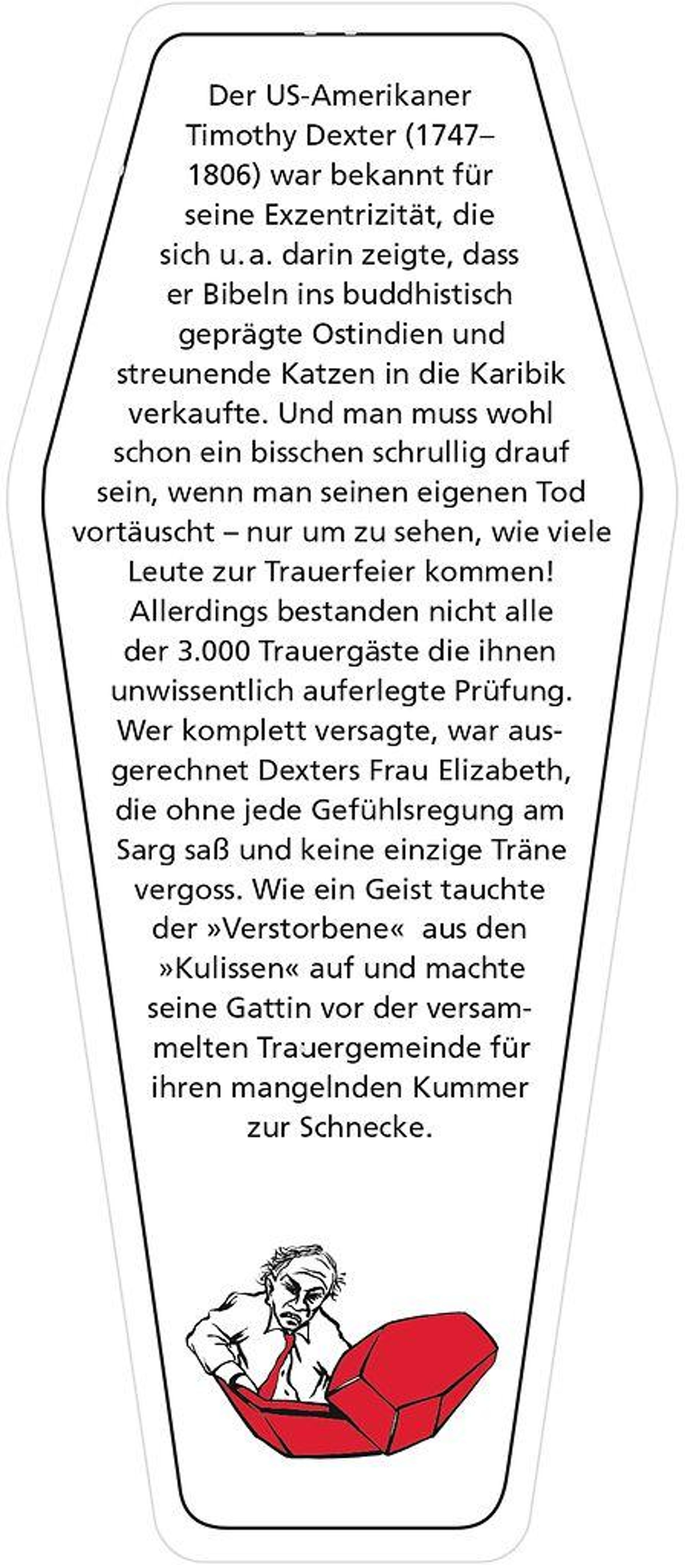 Der Umstand, irgendwann den Löffel abgeben zu müssen, mag so unvermeidlich wie unerfreulich sein - doch wer sagt, dass man daraus nicht trotzdem das Beste machen kann? Es gibt so viele abenteuerliche, skurrile, absurde - und manchmal ganz schön illegale! - Möglichkeiten, seine Ewige Ruhe zu zelebrieren. Und so beginnt Ab in die Kiste! da, wo die meisten anderen black stories enden: mit dem Tod. Denn hier geht es um das, was danach passiert! Und alles ist exakt genau so passiert wie beschrieben. Erscheint in einer einmaligen und limitieren Sonderausstattung in Sargform mit Sound: Beim Öffnen des Sargdeckels ertönt ein schauriges Lachen.