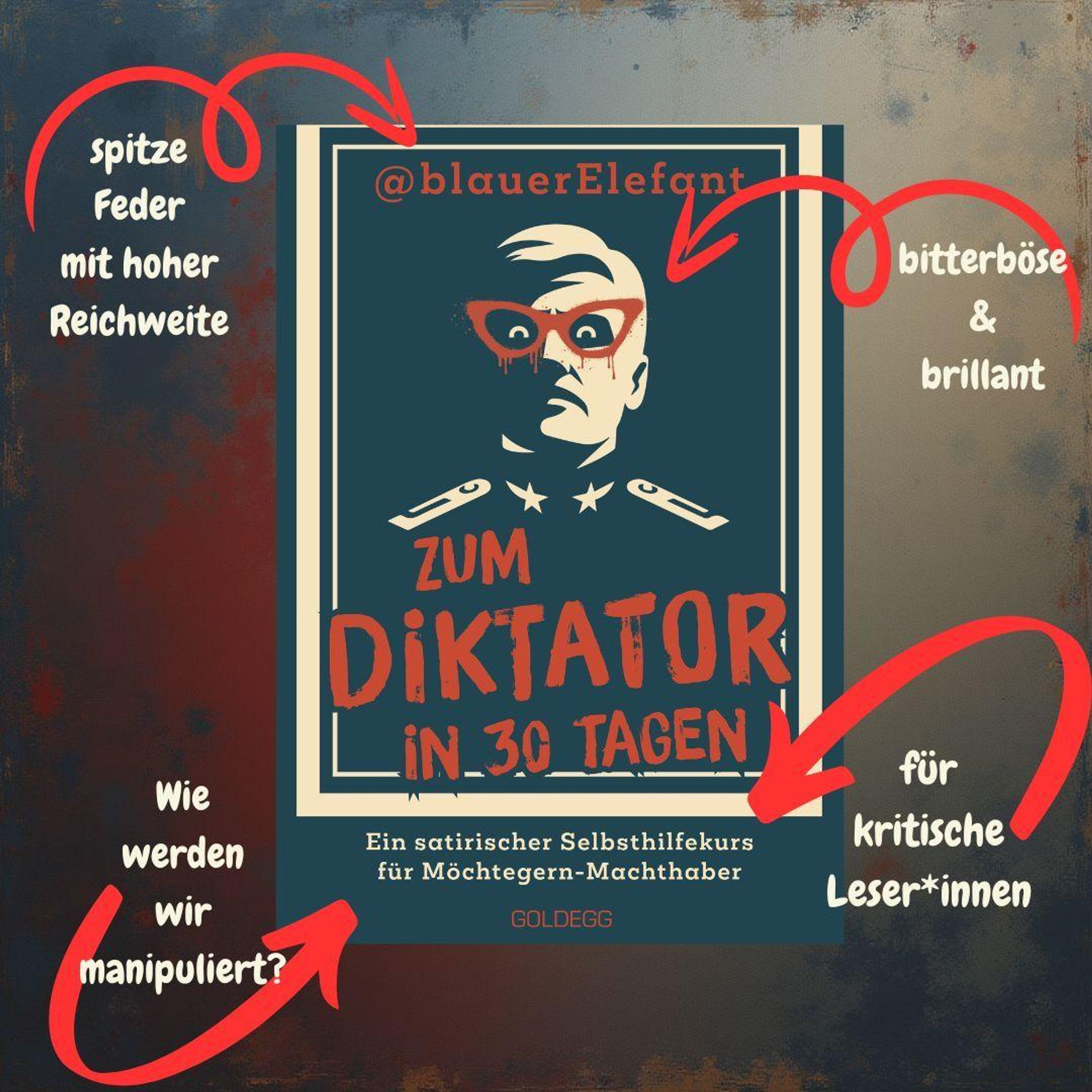 In nur einem Monat vom „kleinen Diktator" zum politischen Überflieger ... Klingt absurd? Genau darum geht es. In Zum Diktator in 30 Tagen nimmt @einblauerelefant, Facharzt für Psychiatrie und scharfsinniger Satiriker, seine Leser*innen mit auf eine gnadenlos humorvolle Reise durch die Mechanismen des Rechtspopulismus. Mit spitzer Feder seziert er die Intrigen, rhetorischen Tricks und Inszenierungen, die politische Bühnen heute dominieren.