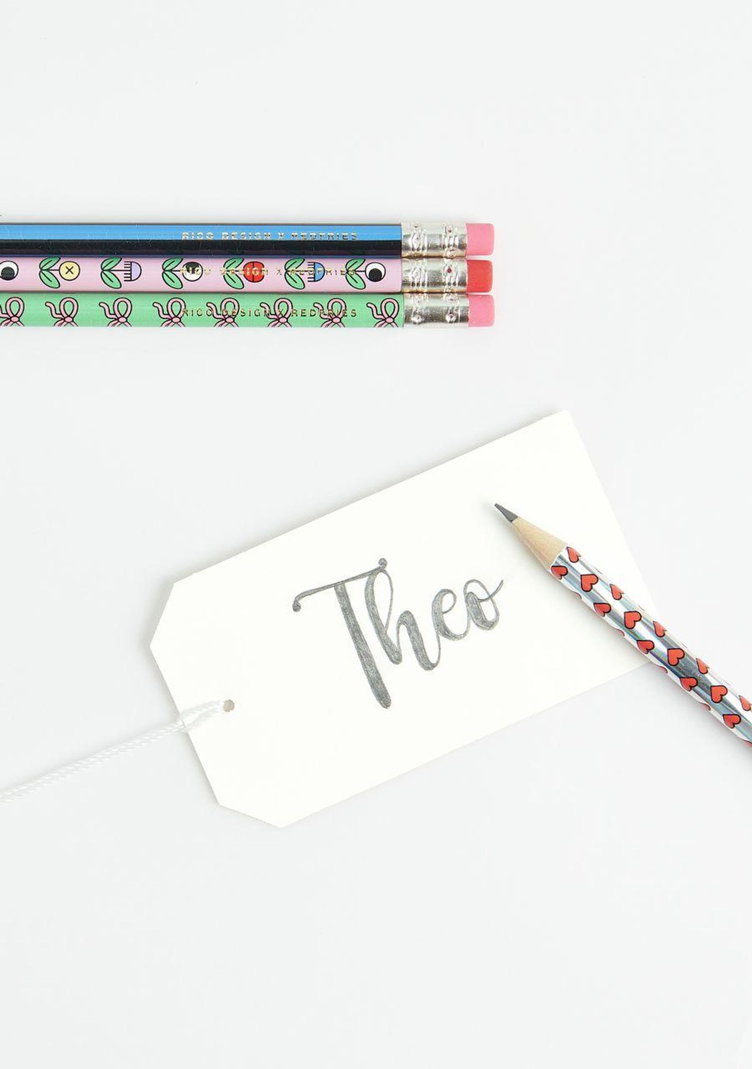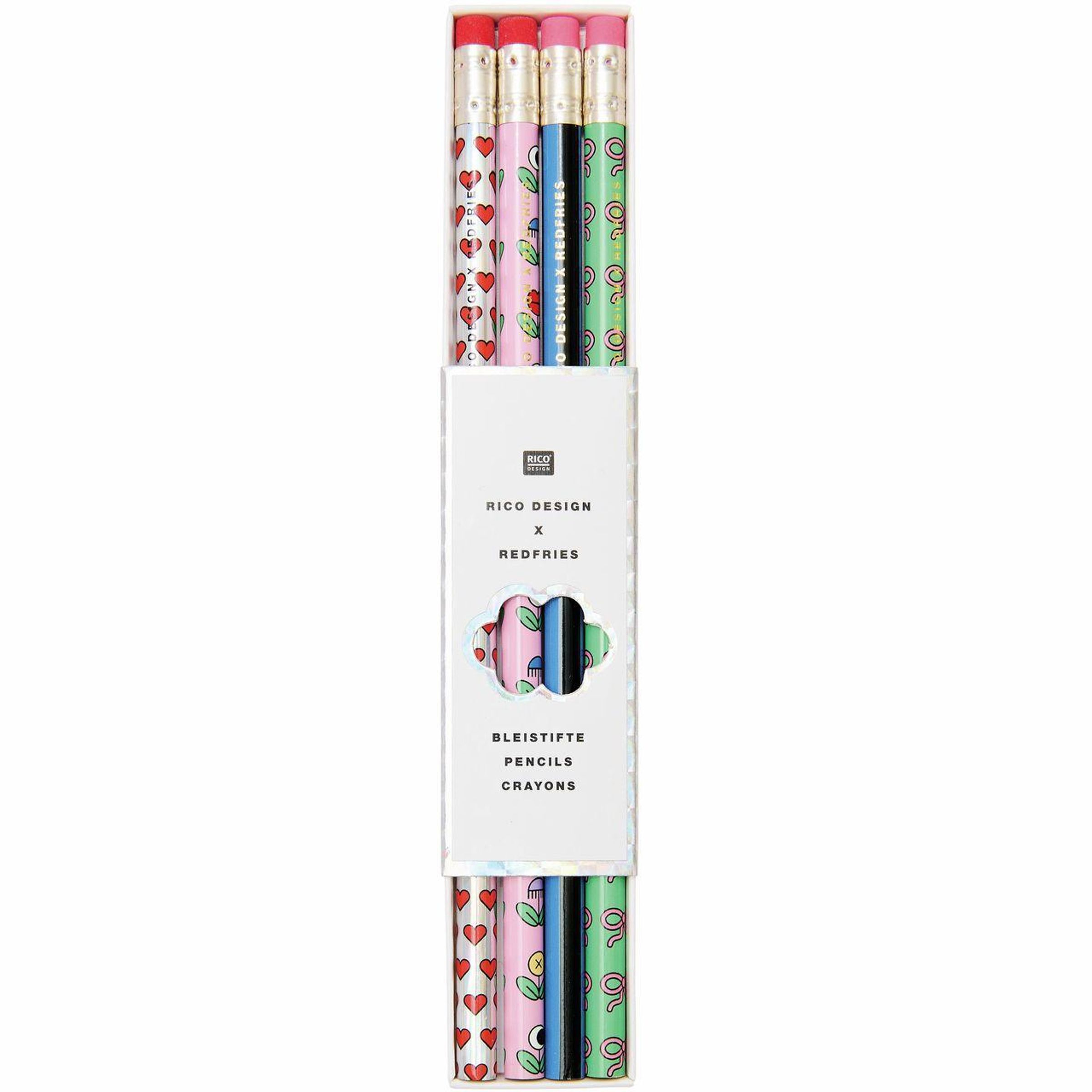 Vier Bleistifte mit Mustern: Herzen, Augen, Text auf Schwarz und Schleifenmuster, alle mit Radiergummienden., Diverse