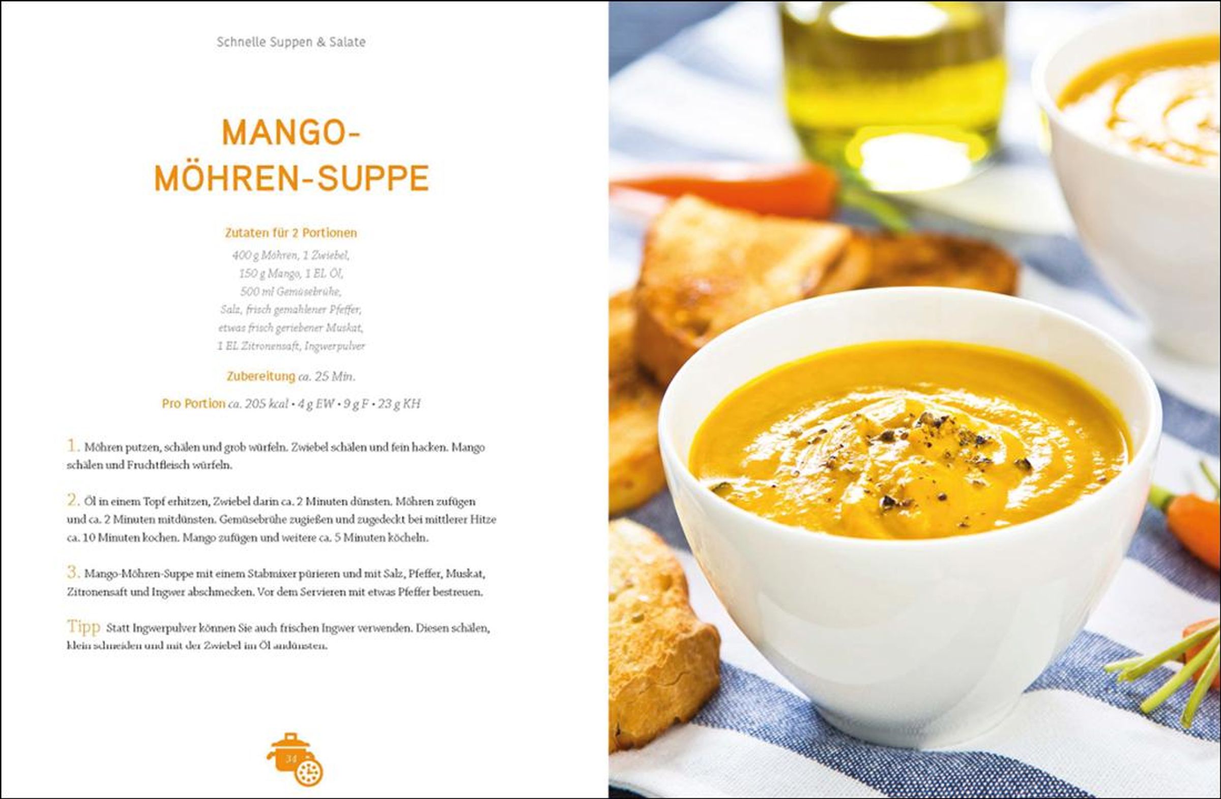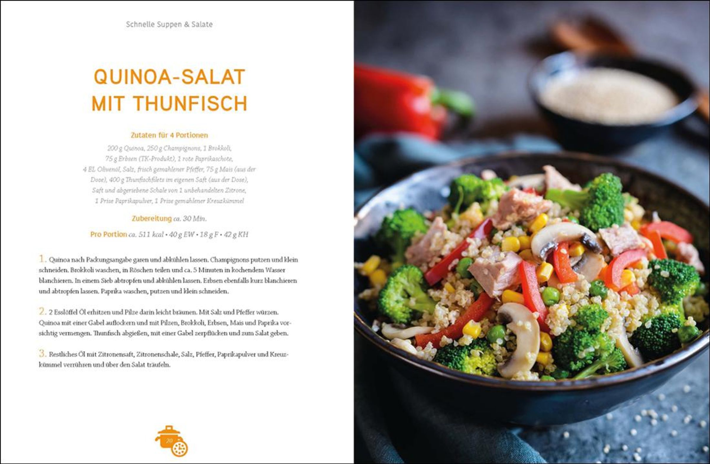 Ein genussvolles, schnelles und gesundes Abendessen zaubern und gleichzeitig etwas für die schlanke Linie tun - mit diesen Low-Carb-Gerichten ist das problemlos möglich! Denn wer Kohlenhydrate einspart und sich mit jeder Menge Gemüse, gesunden Fetten und magerem Eiweiß versorgt, hält den Stoffwechsel in Schwung und bringt die Pfunde zum Purzeln. Die leckere Low-Carb-Küche muss zudem nicht kompliziert sein. Schnelle Suppen und Salate, fixe Gerichte mit Fleisch, Fisch und für Vegetarier sowie köstliche Blitz-Desserts garantieren auch im stressigen Alltag gesunde Genussmomente. Wie wäre es z. B. mit einer cremigen Erbsensuppe, einem bunten Quinoa-Salat mit Thunfisch, trendigen Zoodles mit Bolognesesoße oder mit überbackenen Avocados mit Ei? Kohlenhydratarme Nachspeisen wie Tassenküchlein mit Blaubeeren oder Johannisbeer-Sorbet sorgen dann im Nu für den krönenden süßen Abschluss.