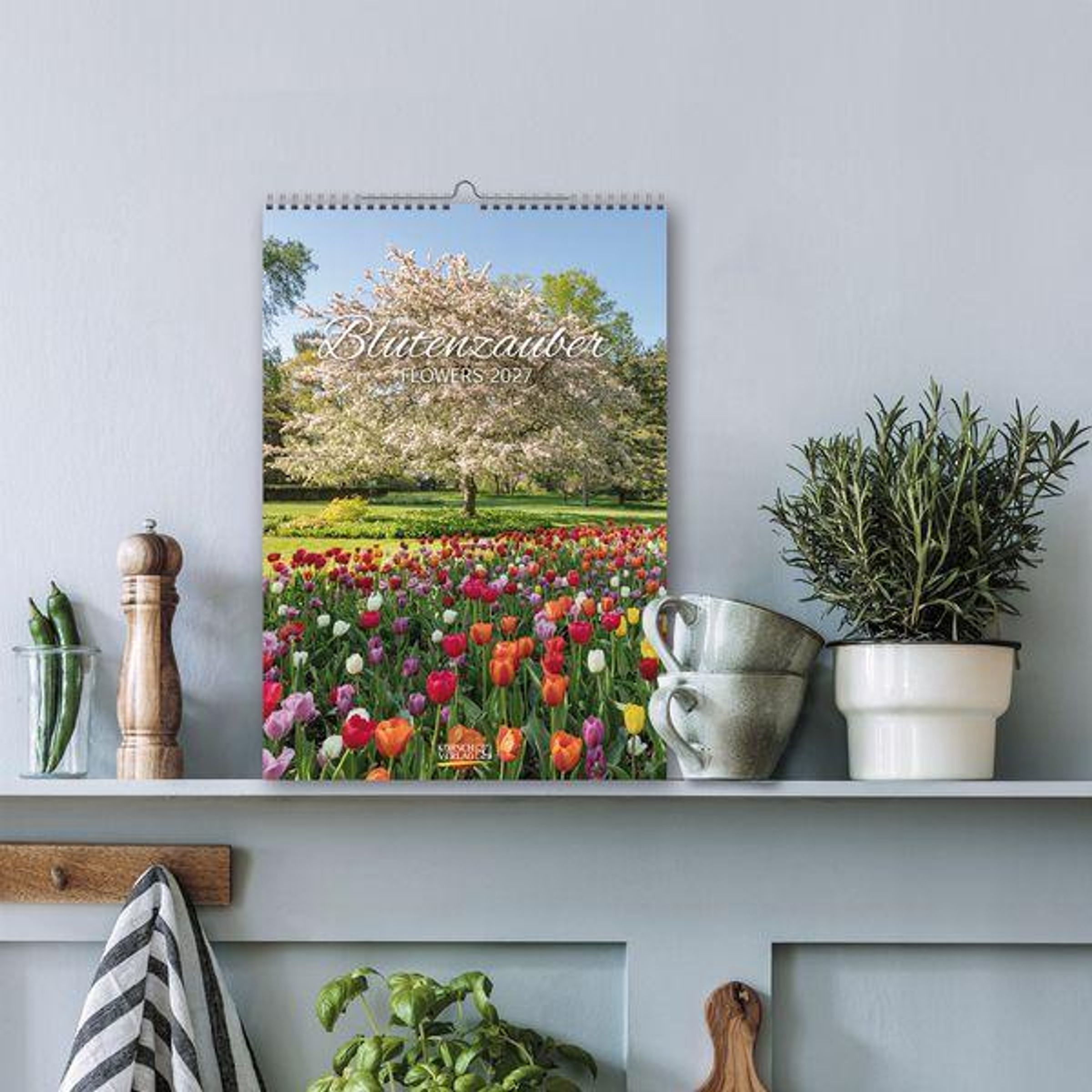 "Blütenzauber Flowers 2027" in eleganter Schrift. Ein blühender Baum und ein mehrfarbiges Tulpenfeld im Vordergrund., Kalender