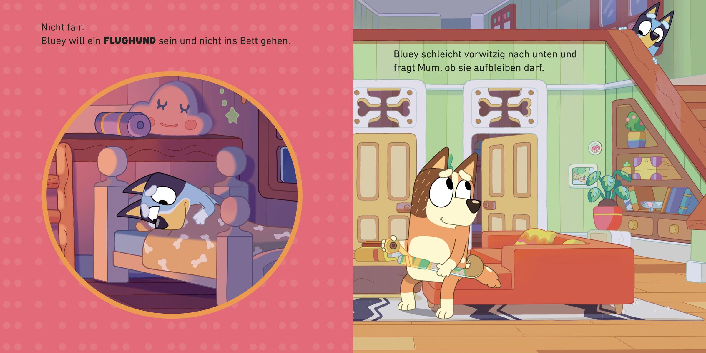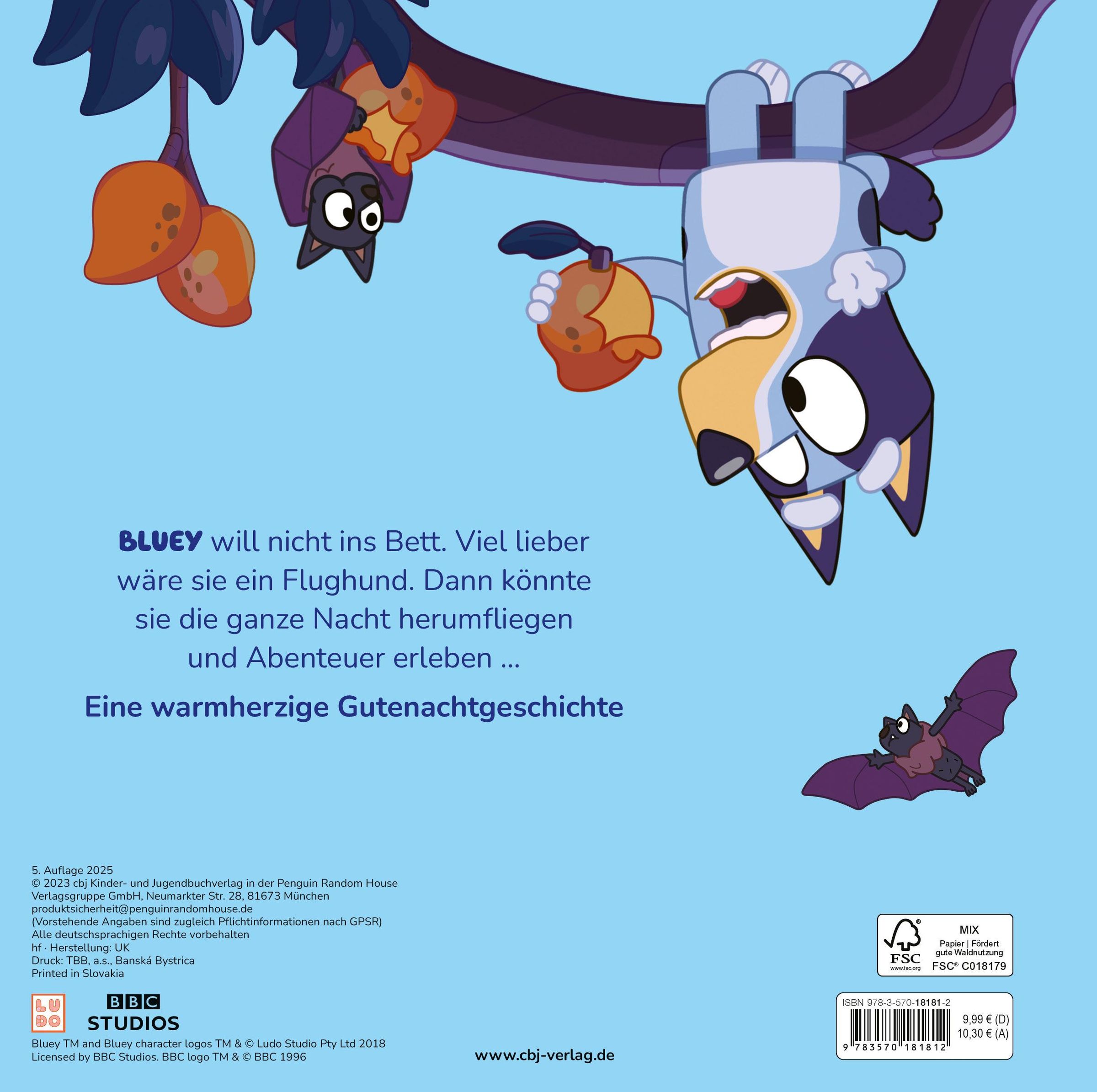 Bluey will nicht schlafen! Sie ist überhaupt nicht müde, und im Bett zu liegen, findet sie schrecklich langweilig! Viel lieber wäre sie ein Flughund. Dann könnte sie die ganze Nacht herumfliegen und was erleben! Grummelnd versucht Bluey einzuschlafen, da hat sie plötzliche eine tolle Idee: Sie will ein Flughund-Abenteuer träumen ! Zuerst klappt das nicht, aber als sie ihre Pfoten wie Flughundflügel auf und ab bewegt, fliegt sie in die Nacht hinaus ... am Fenster ihres besten Freundes vorbei Richtung Sportplatz. Und das ist erst der Anfang eines wunderbaren Flughund-Abenteuers ...