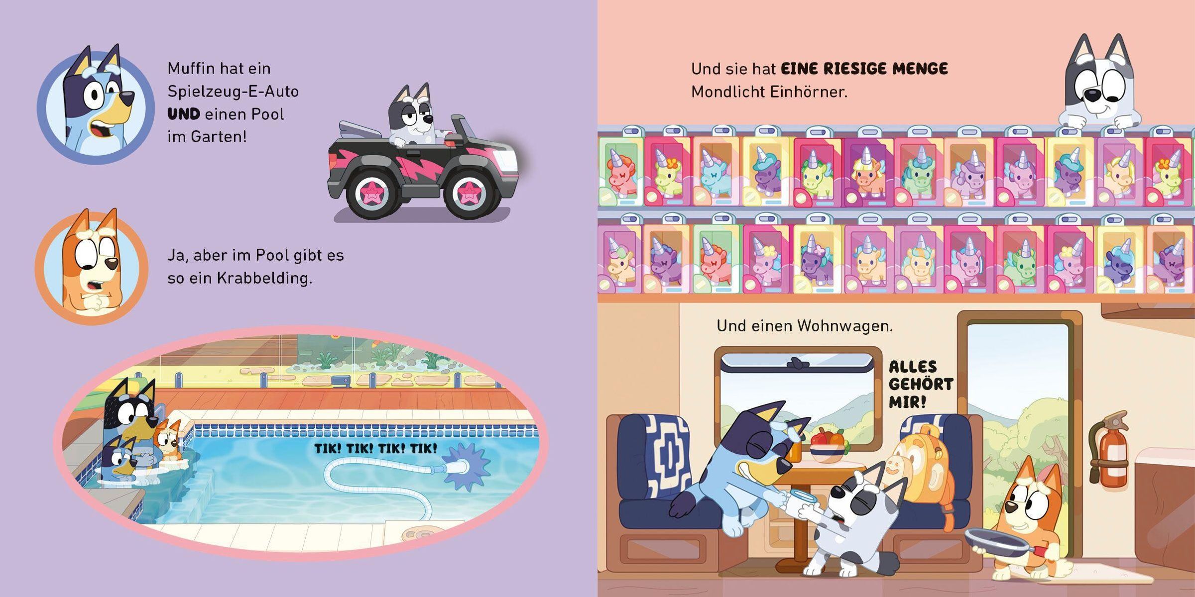 Bluey und Bingo überlegen, ob ihre Familie oder die ihrer Cousine Muffin besser ist. Einiges spricht für Muffins Familie, denn sie bekommt Eis, wann immer sie will, fährt ein eigenes Spielzeug-Auto, hat ein einen Pool im Garten und einen Wohnwagen. Mum hingegen meint, dass es darauf ankommt, ob man sich liebt und gern Zeit miteinander verbringt. Also listen Bluey und Bingo Dinge auf, die sie an ihrer Familie toll finden ...