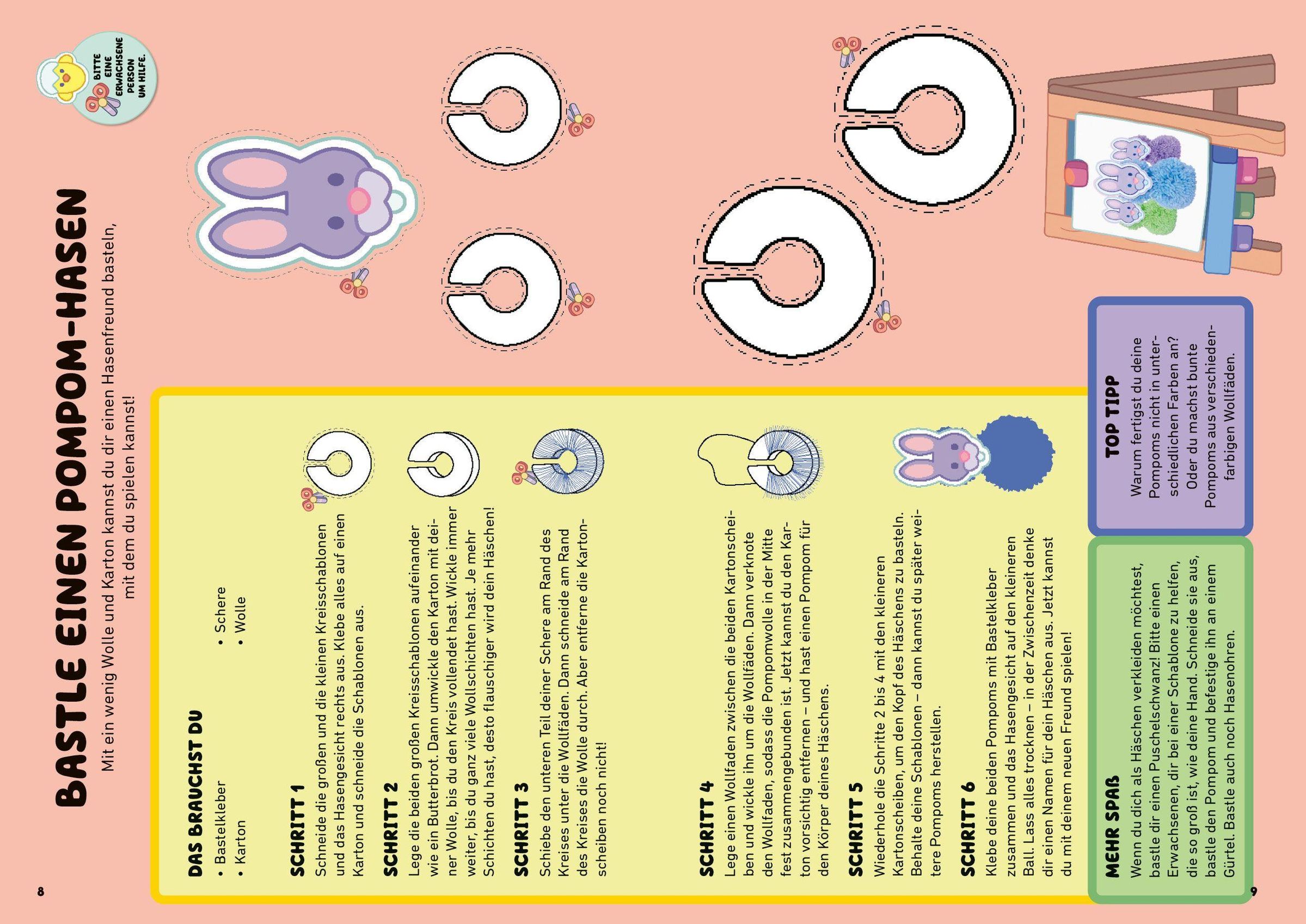 Ein umfangreiches Oster-Beschäftigungsheft mit tollen Ideen für die Zeit vor Ostern und die Osterferien! Hier kann nach Herzenslust gespielt, gebastelt, gemalt, gerätselt und gebacken werden. Mit zwei Bastelkartons für einen Häschen-Beutel und eine kleine Tasche für die Ostereiersuche! Frohe Ostern!