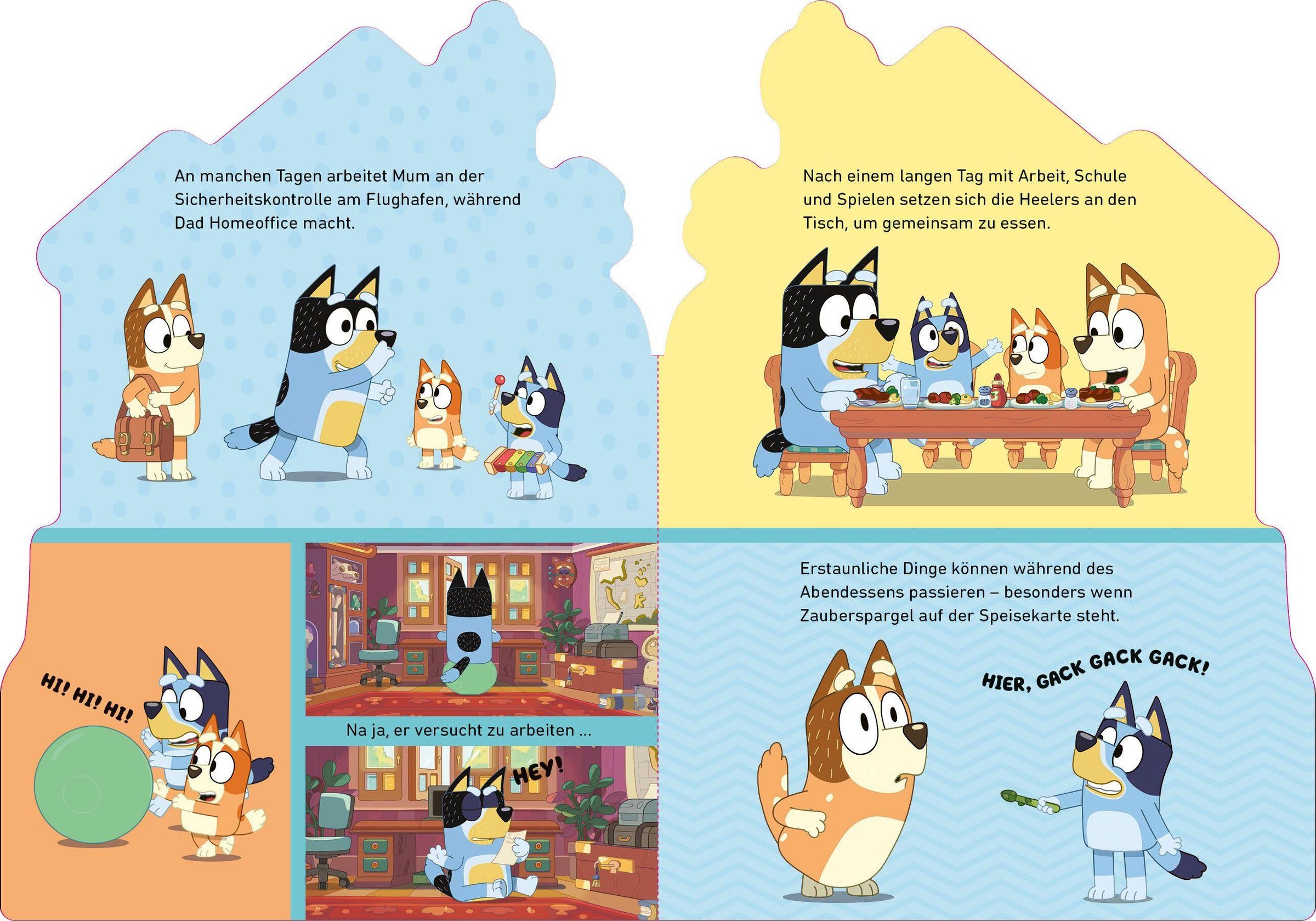 Alles, was BLUEY-Fans über die Familie Heeler wissen möchten, erfahren sie in diesem konturgestanzten Pappbilderbuch. Bluey und Bingo spielen von morgens bis abends mit Mum und Dad: Im Frisörsalon werden Haare gewaschen und geschnitten, im Krankenhaus wird Dad operiert und dann wird Mum in ein Huhn verzaubert. Und nach einem gemeinsamen Abendessen gibt es noch eine Gutenachtgeschichte mit einer gemütlichen Kuschelzeit.
