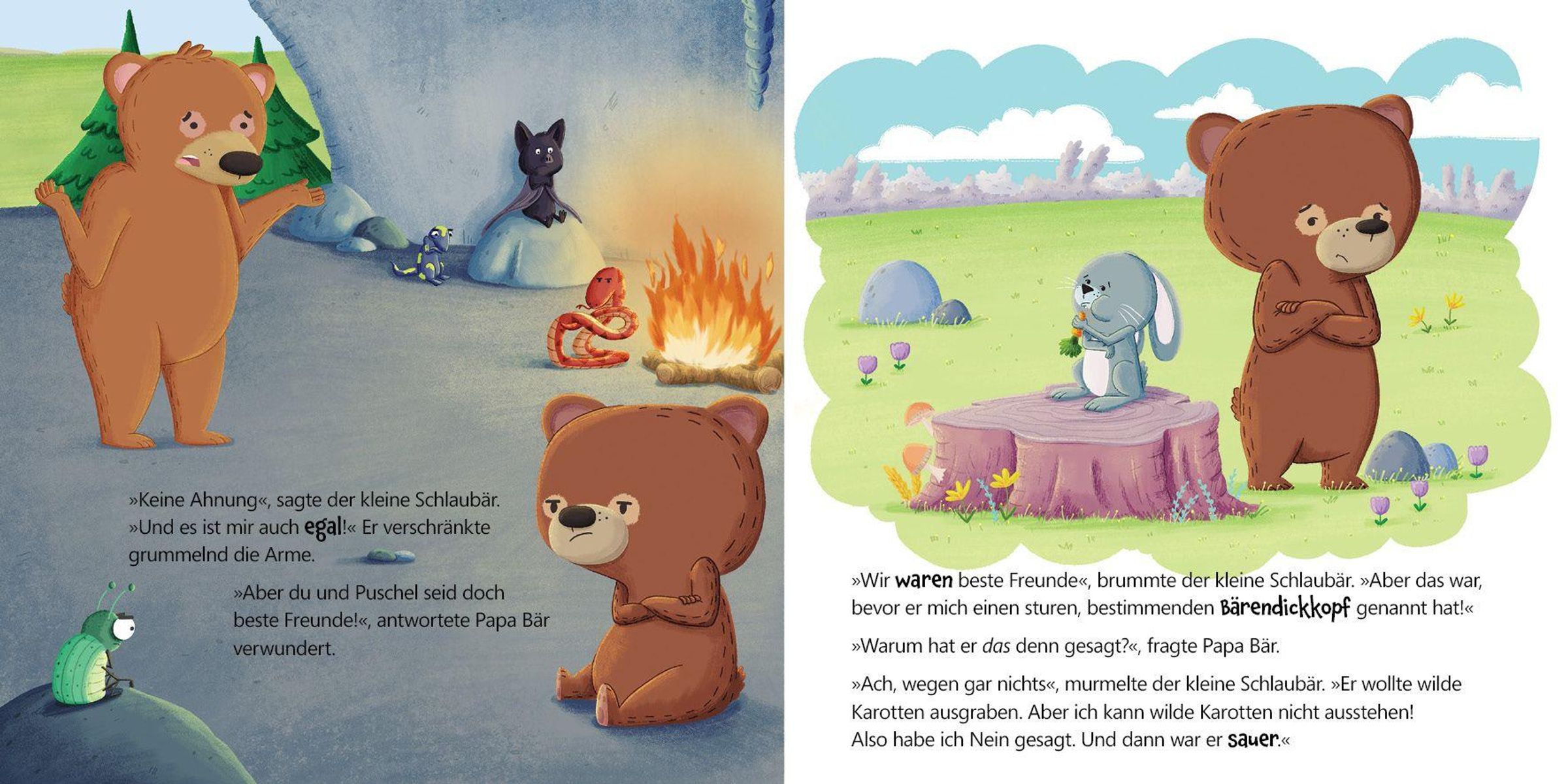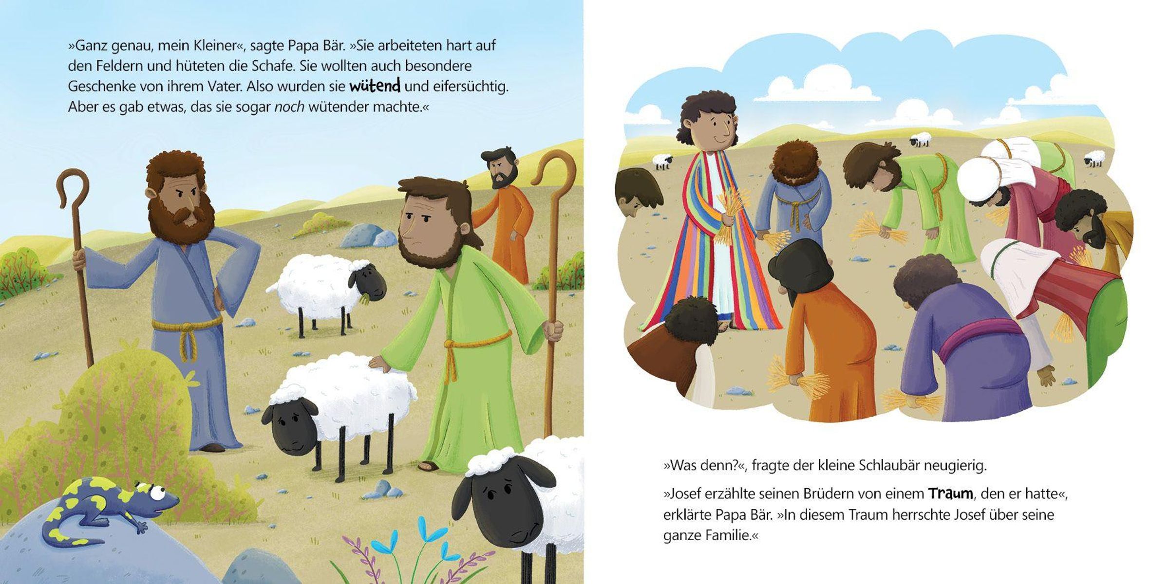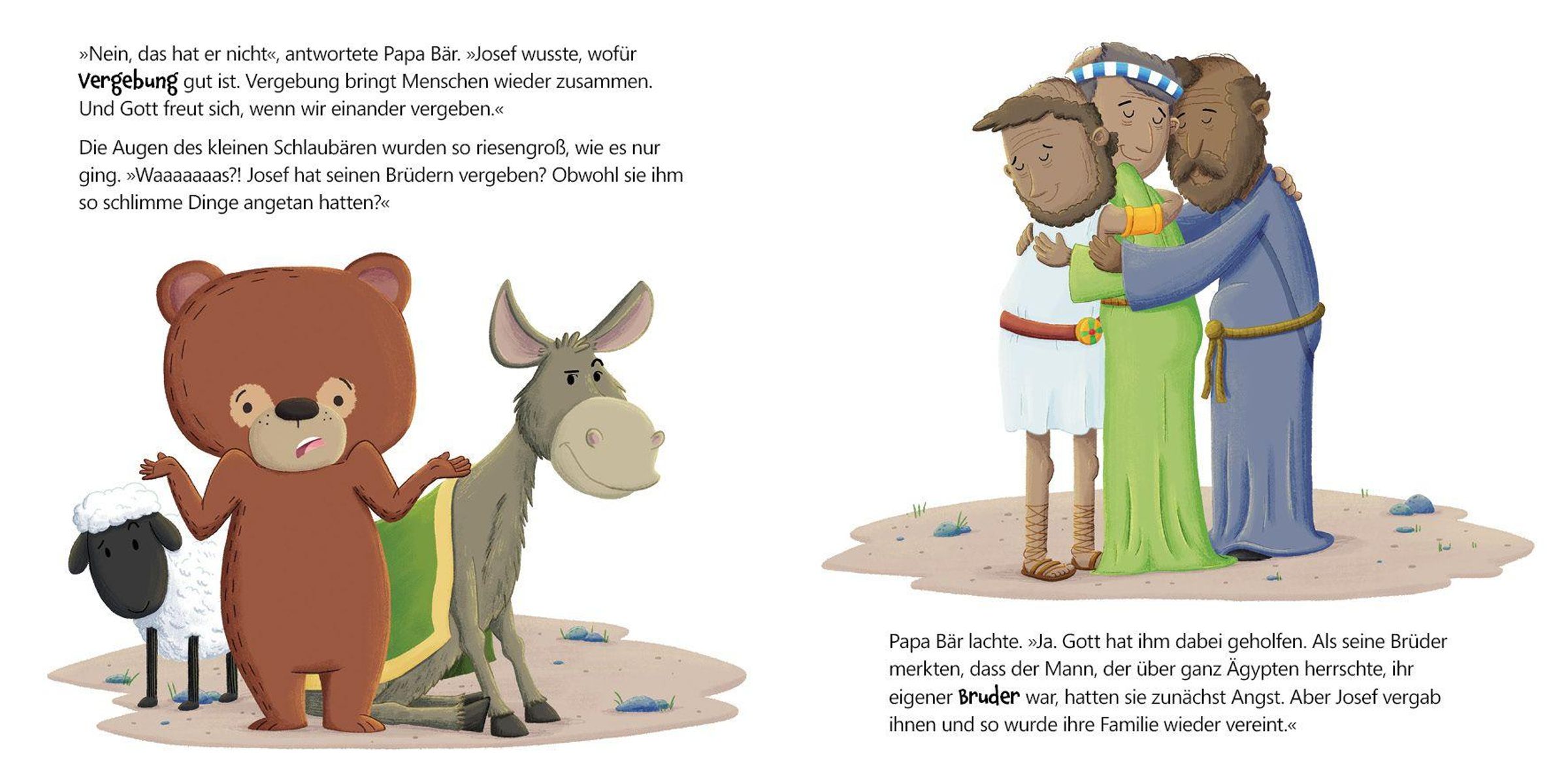 Der kleine Schlaubär hat sich mit seinem Freund Puschel, dem Kaninchen, gestritten und ist fest entschlossen, ihm auf keinen Fall zu vergeben. Daraufhin erzählt Papa Bär seinem Sohn die biblische Geschichte von Josef und seinen Brüdern.