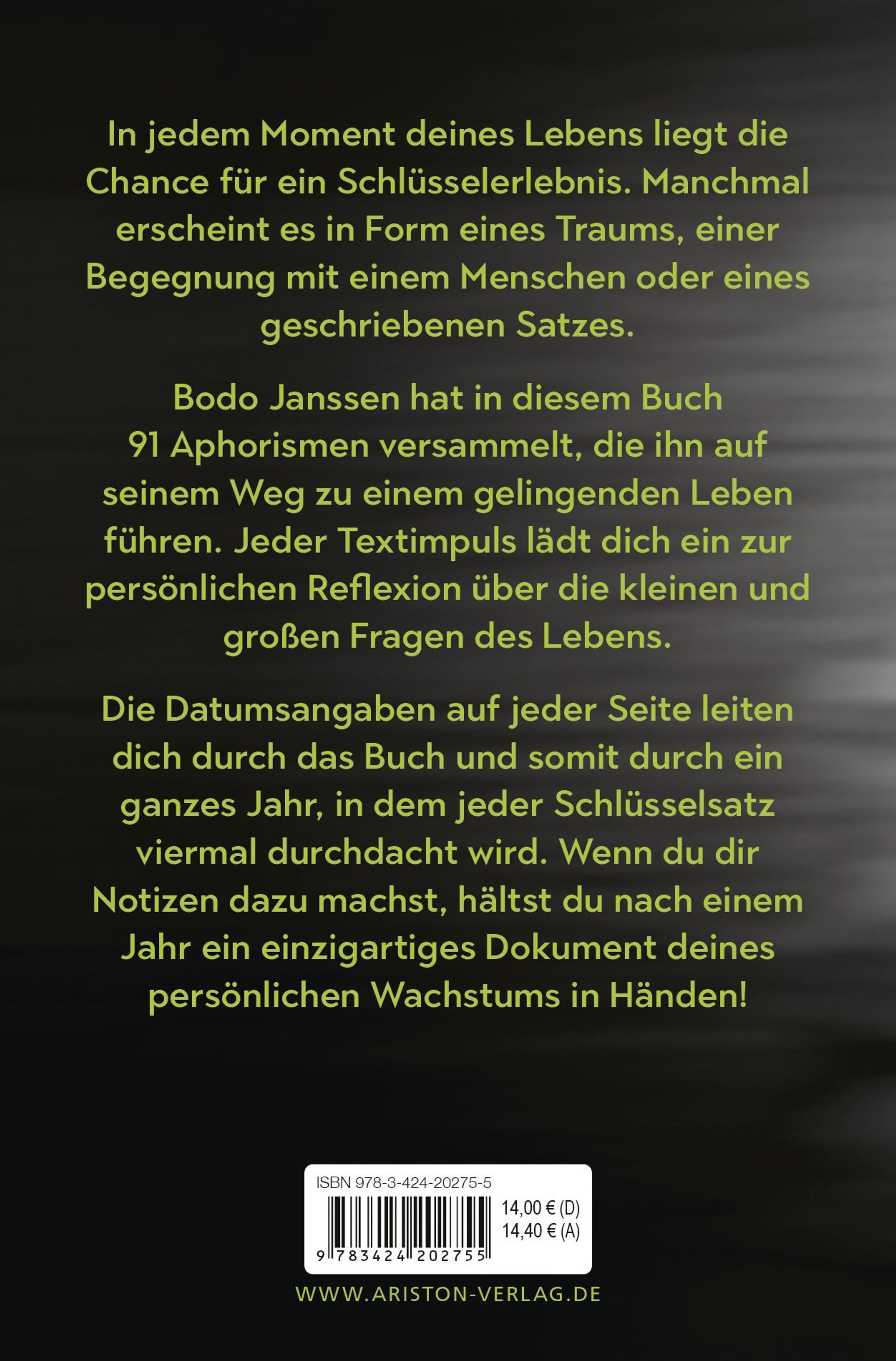 Bodo Janssen gibt mit diesem Buch unserem Denken eine Richtung. 91 illustrierte Aphorismen mit je einem Textimpuls laden ein zur persönlichen Reflexion über die kleinen und großen Fragen des Lebens. Die Datumsangaben auf jeder Seite leiten die Leser*innen durch das Buch und somit durch ein ganzes Jahr, denn jeder Schlüsselsatz wird vier Mal durchdacht. Wer sich jedes Mal Notizen macht, wird nach dem Verlauf eines Jahres ein einzigartiges Dokument seines persönlichen Wachstums erstellt haben. Und wer möchte, beginnt einfach wieder von vorn!